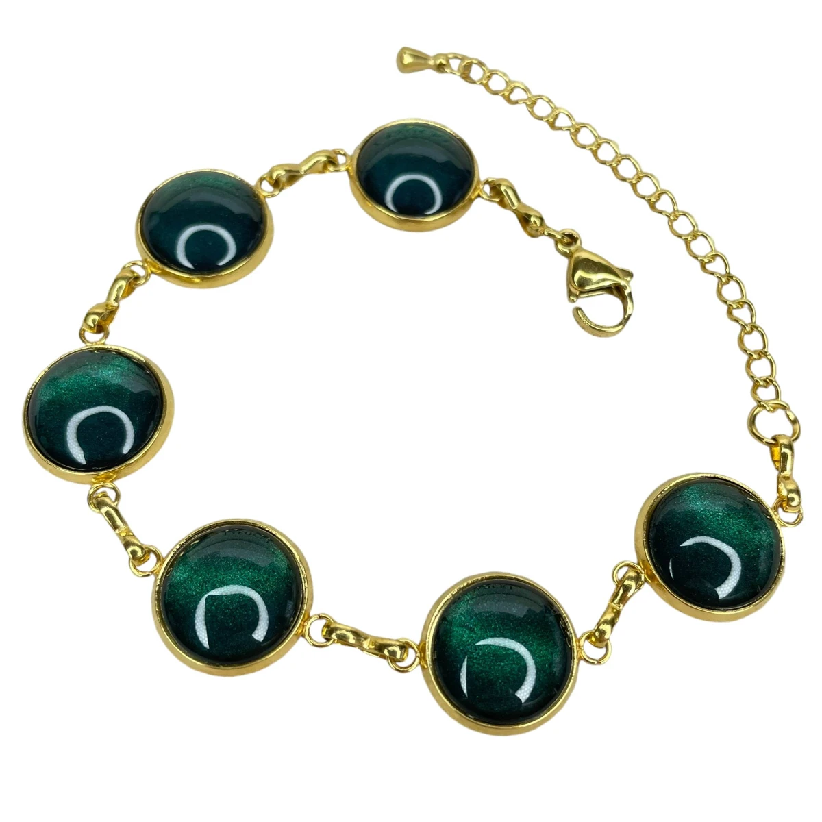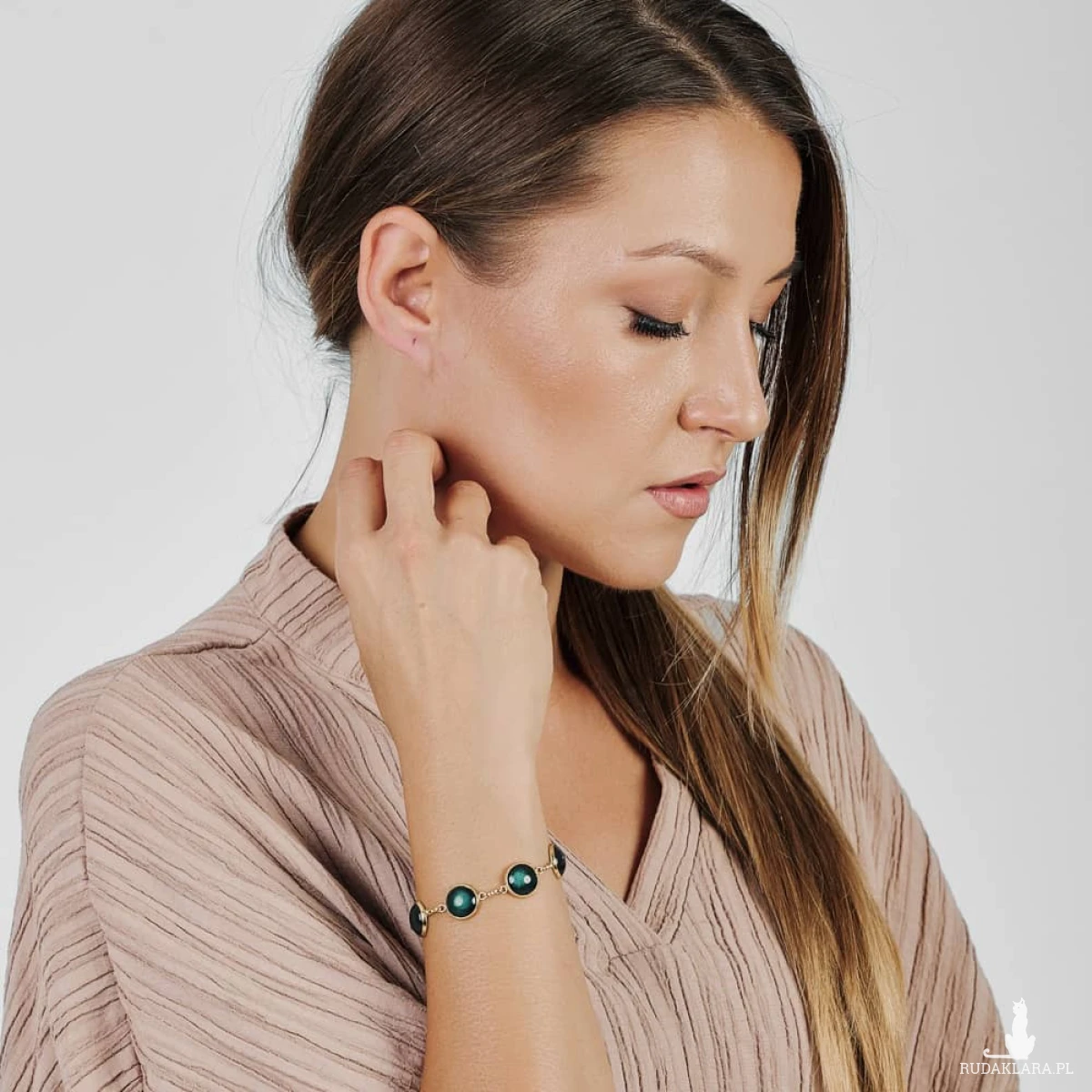 Ta pełna blasku bransoletka jest częścią kolekcji “W blasku perłowego księżyca”. Bransoletka wykonana jest z ręcznie malowanych kaboszonów umieszczonych w bazach ze stali szlachetnej. Szklane elementy zachwycają subtelnym, opalizującym blaskiem, który jest niczym odbicie księżyca na tafli wody. Bransoletka mieni się w świetle, przyciągając wzrok i dodając elegancji każdej stylizacji. Ten dodatek jest idealny dla osób ceniących sobie wyrafinowaną i ponadczasową biżuterię. Materiał: stal szlachetna, malowane ręcznie szkło Wykończenie: połysk Długość bransoletki: ok 17 cm + przedłużka 5cm Średnica kaboszonu: 12 mm SKU: e45/68 Jak dobierać komplety? Kolory na zdjęciach mogą się różnić ze względów technicznych. Aby dobrać identyczny odcień, zwróć uwagę na numer SKU produktu. Pierwsza część to numer modelu, a numery po “/” to kolor, np. /17 oznacza morski perłowy. Produkty z tym samym SKU po "/" mają identyczny kolor. Dzięki temu możesz łatwo tworzyć komplety, mając pewność, że biżuteria jest w tym samym odcieniu. Stwórz własny komplet! Jeśli nie ma biżuterii w wybranym modelu lub kolorze którego szukasz, możesz ją zamówić indywidualnie. Wyślij do nas maila z nazwą, numerem modelu i kolorem, a my w miarę możliwości wykonamy biżuterię na zamówienie. Termin realizacji ustalamy indywidualnie. Biżuteria zostanie elegancko zapakowana. W przypadku zakupu kompletu, biżuteria zostanie zapakowana razem. Kolory na zdjęciach mogą delikatnie różnić się od rzeczywistych.