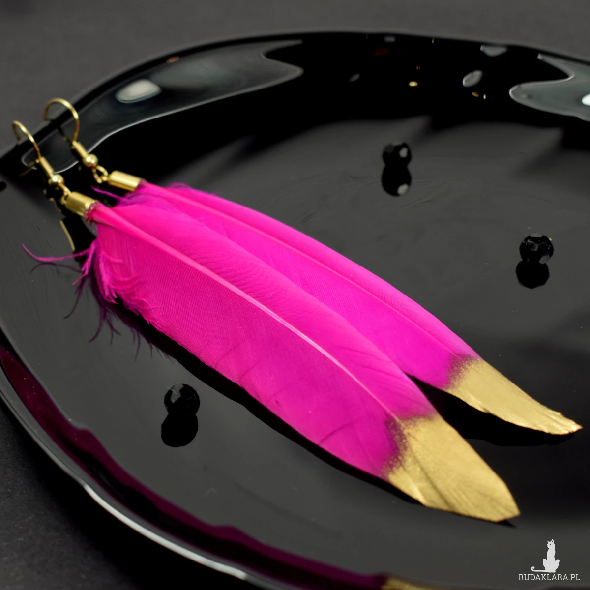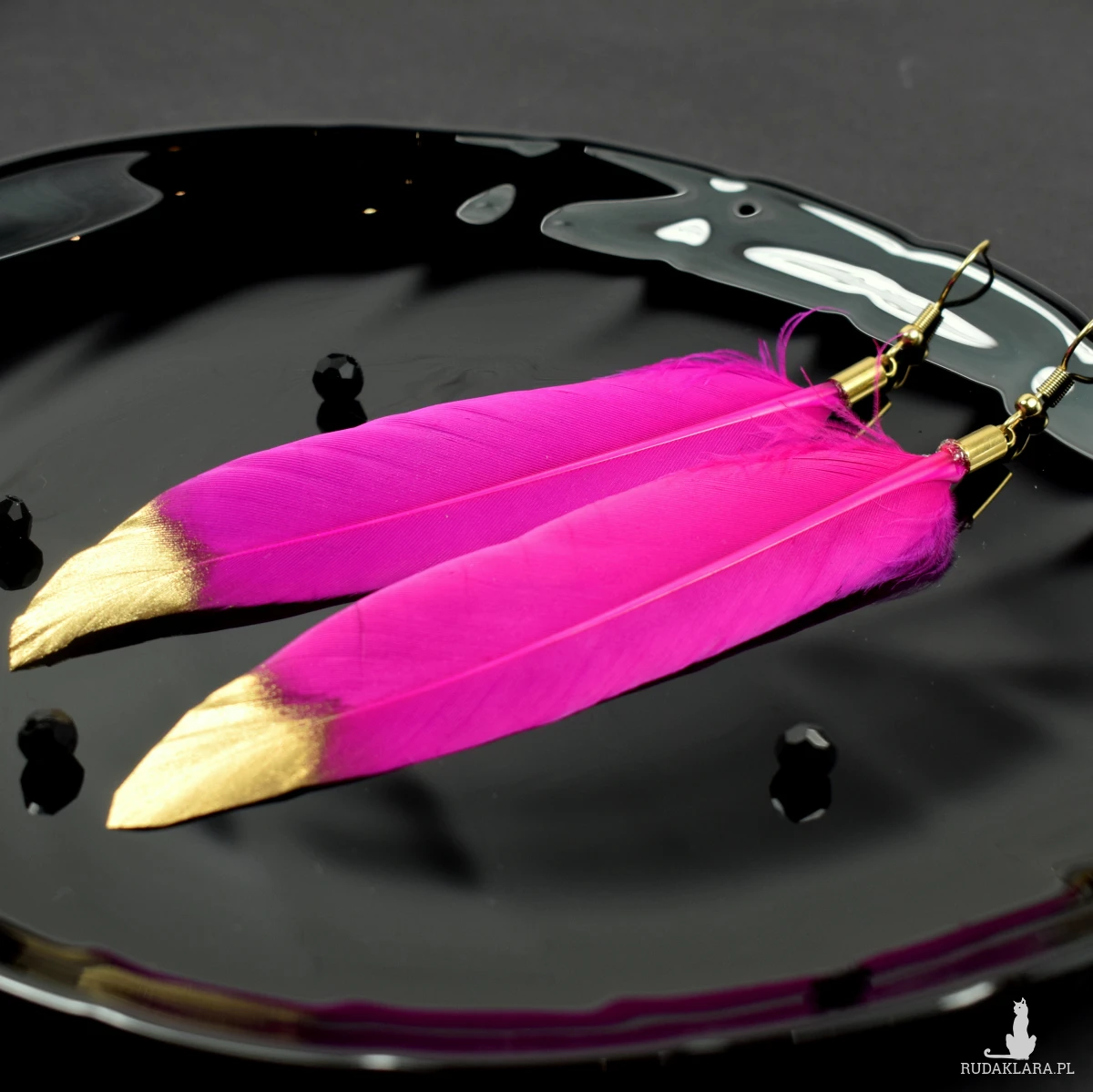 Zjawiskowe kolczyki z delikatnymi piórami w głębokim odcieniu fuksji z