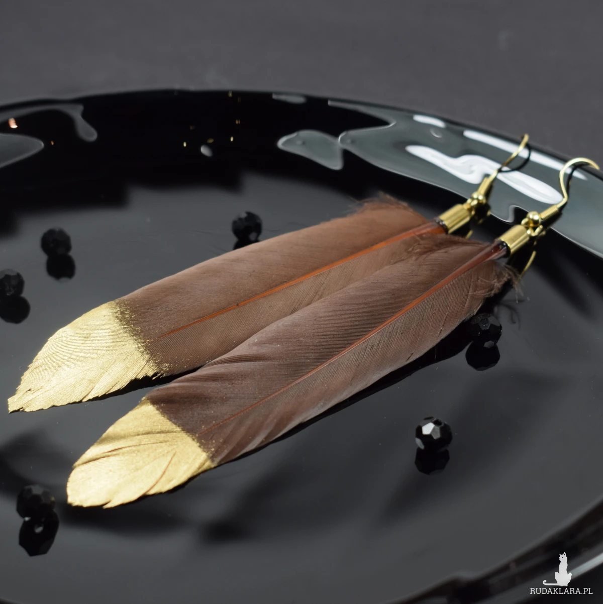 Zjawiskowe kolczyki z delikatnymi piórami w głębokim odcieniu brązu z