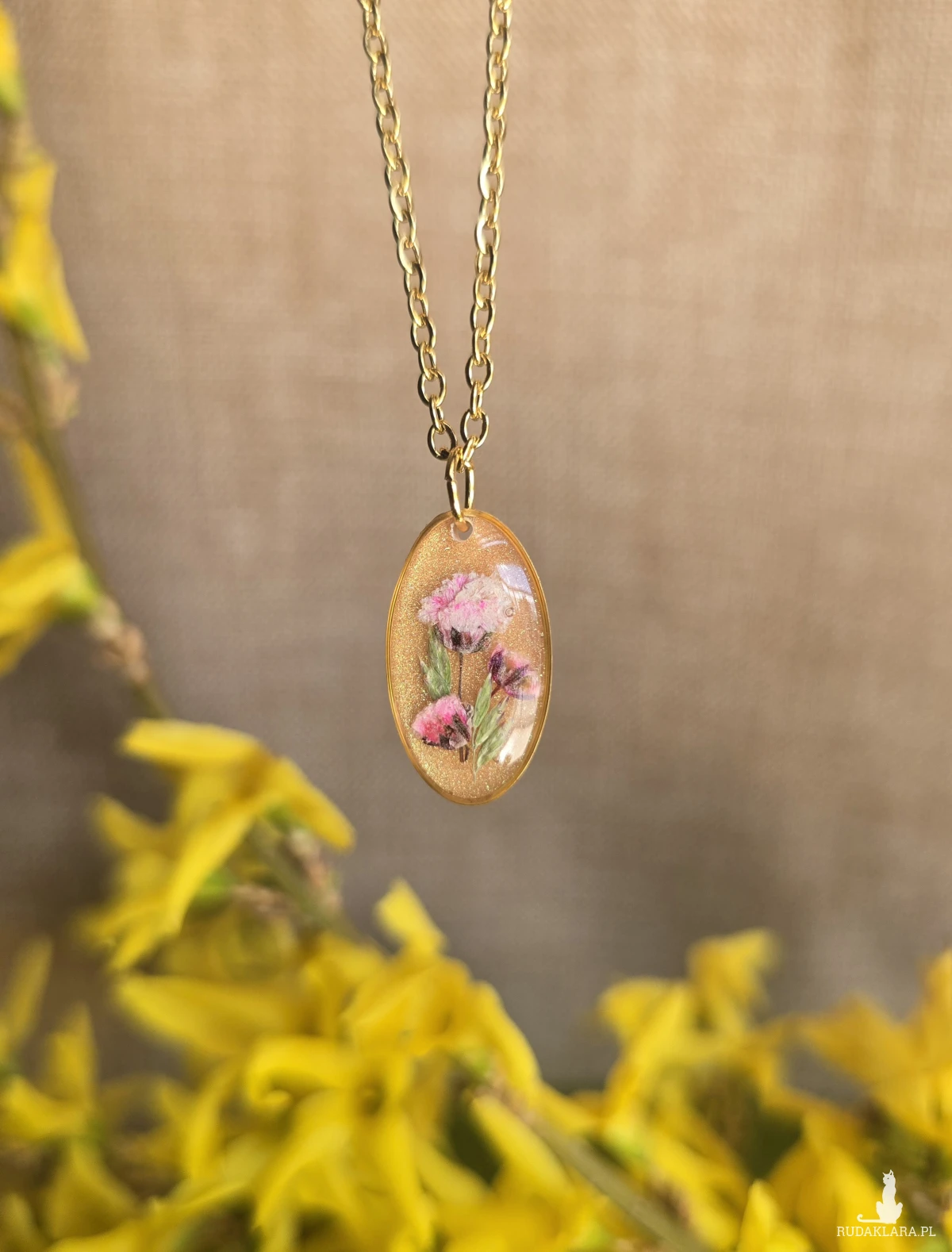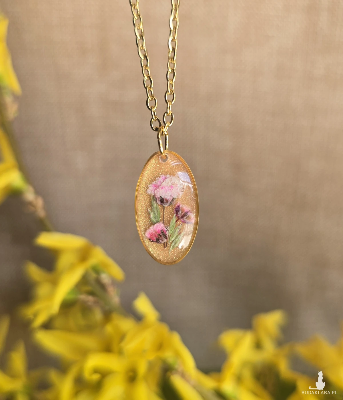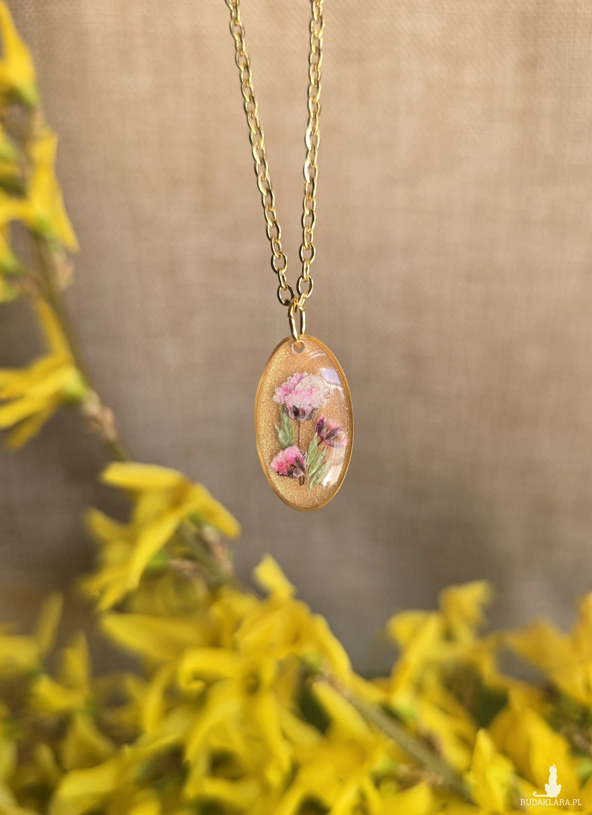 Oferuję Państwu unikalną biżuterię. Zawieszka jest wykonana z suszonych kwiatów i żywicy epoksydowej. Biżuteria jest wspaniałym i oryginalnym prezentem na lata.
