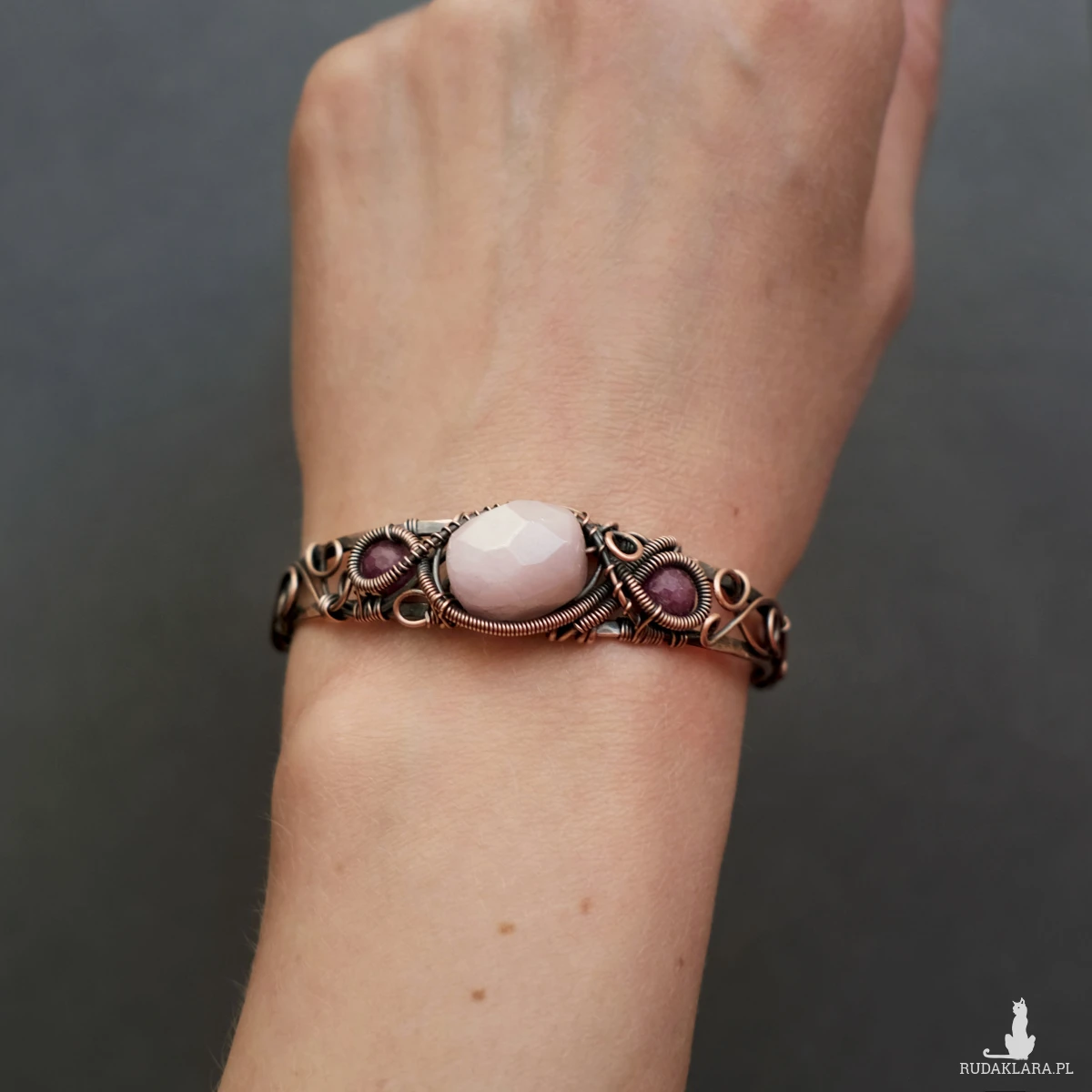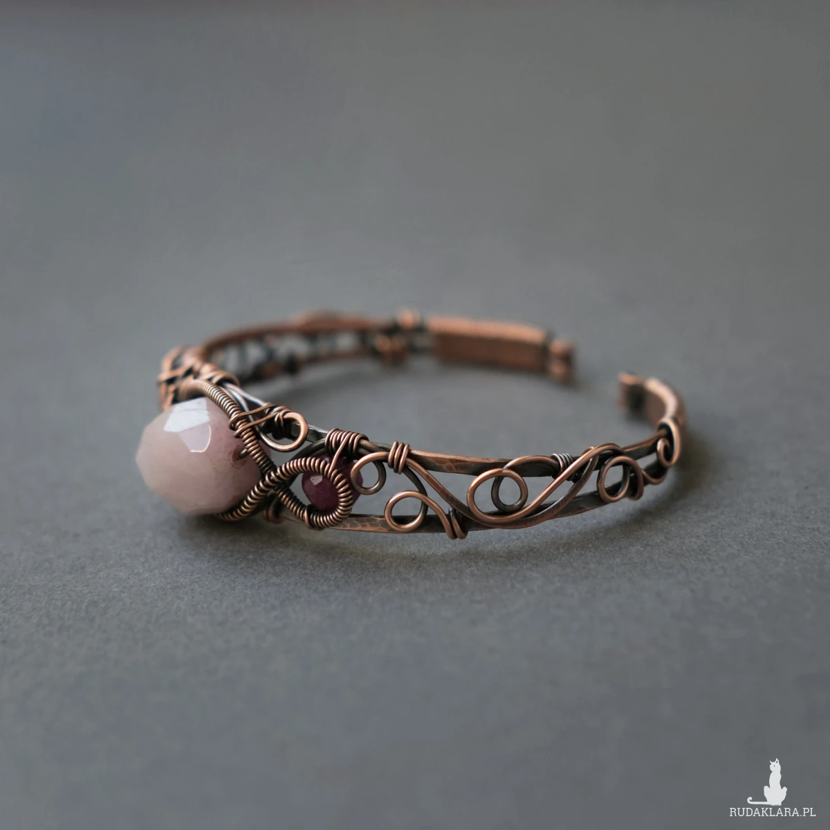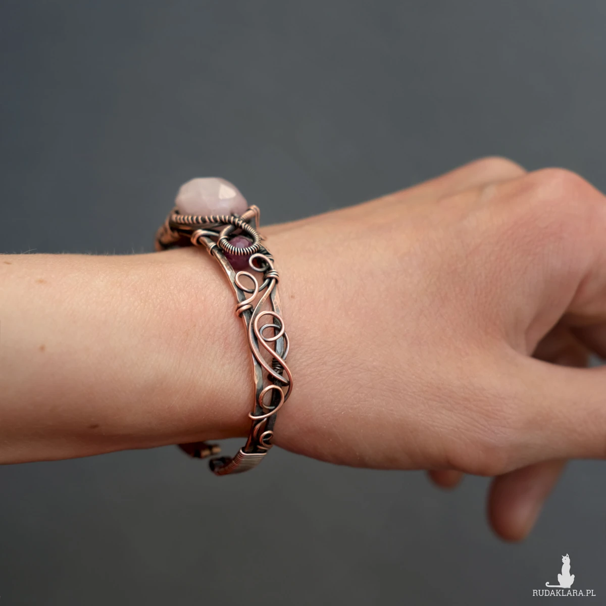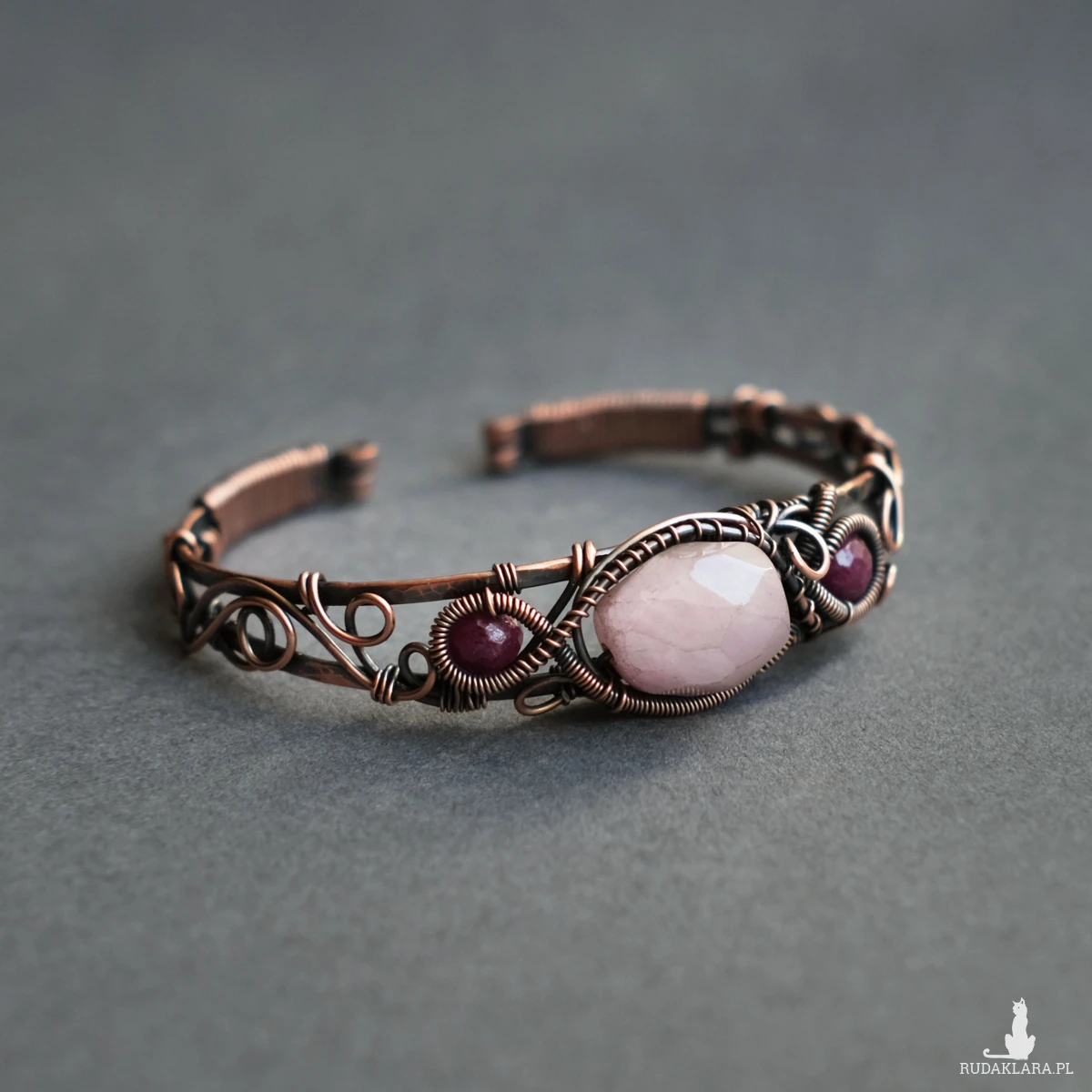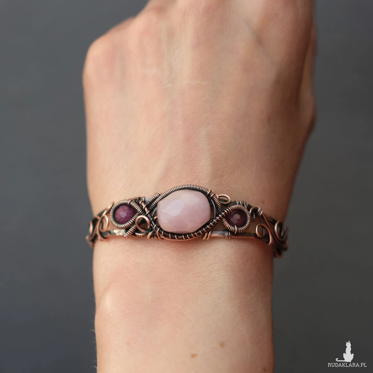 Miedziana bransoletka w elfickim stylu mieści w sobie kamień kunzytu oraz fasetowane rubiny. Oplatają ją sploty miedzianego drutu nadające baśniowego klimatu.