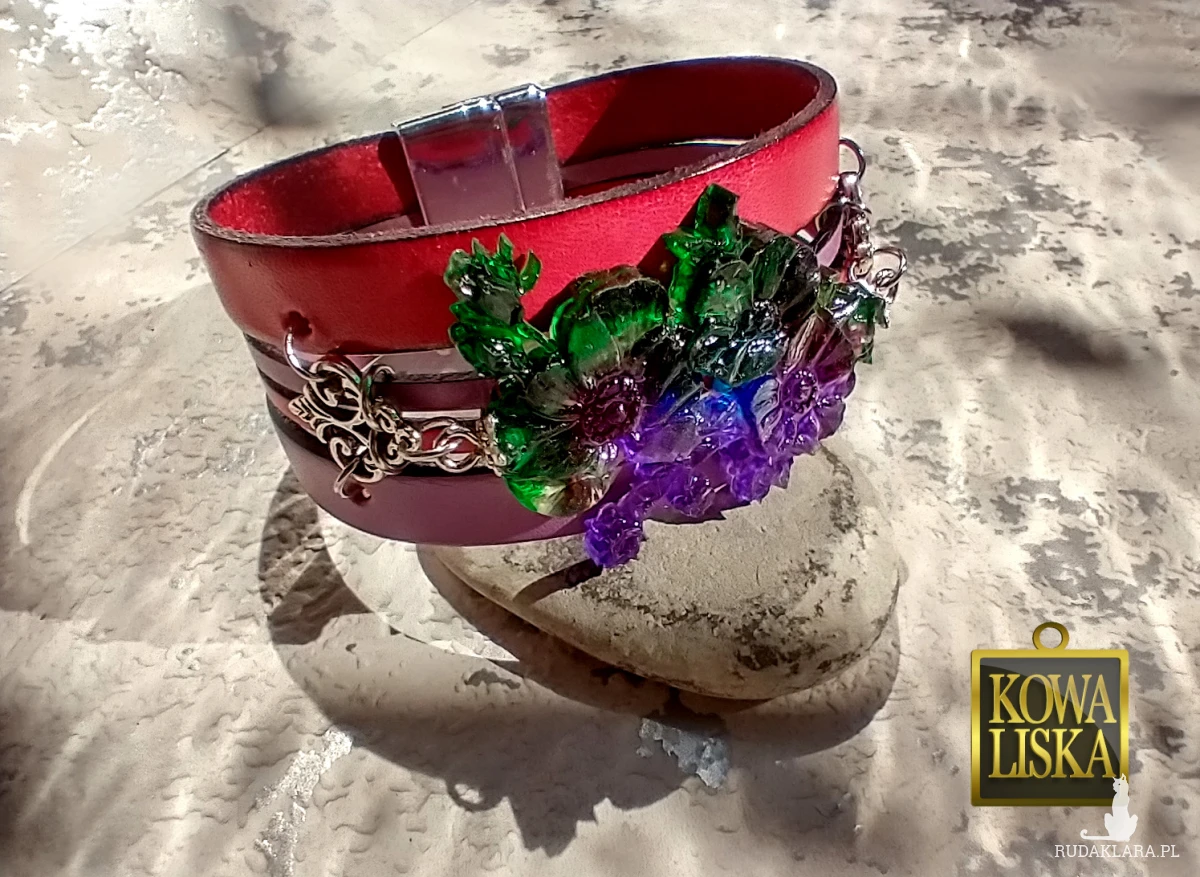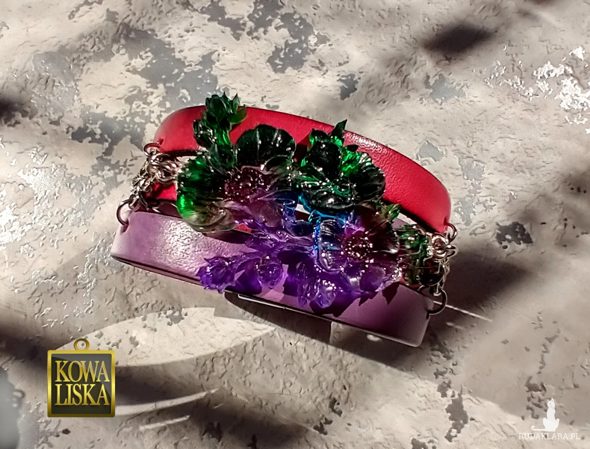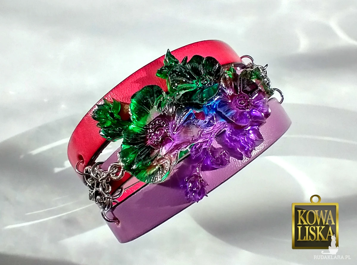 Kwiaty odlane z żywicy zostały zamontowane na szerokich rzemieniach, zebranych wygodnym zapięciem magnetycznym.