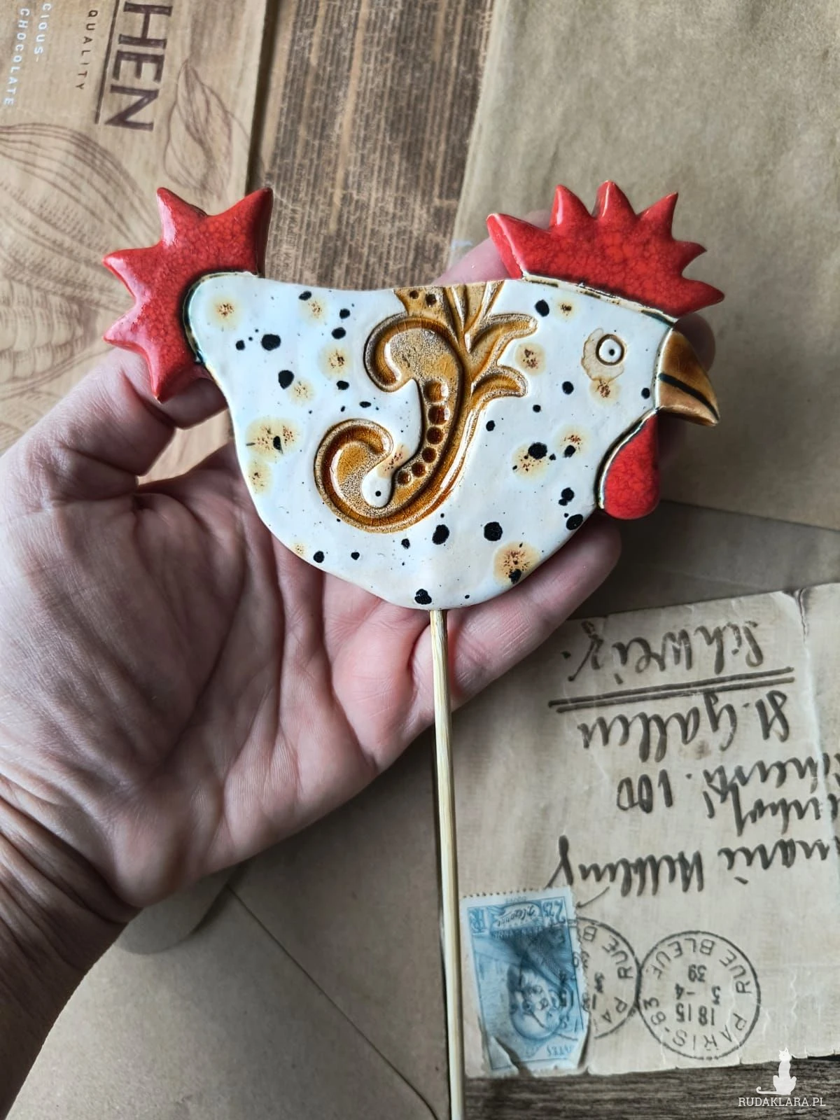 Kura nakrapiana na piku, wykonana została z gliny szamotowej, wypalona na biskwit, a następnie szkliwiona w temp ok 1260 stopni C. Wymiary ok 13 cm x 9 cm. Polecam serdecznie do ozdoby kuchni lub jako upominek wielkanocny.