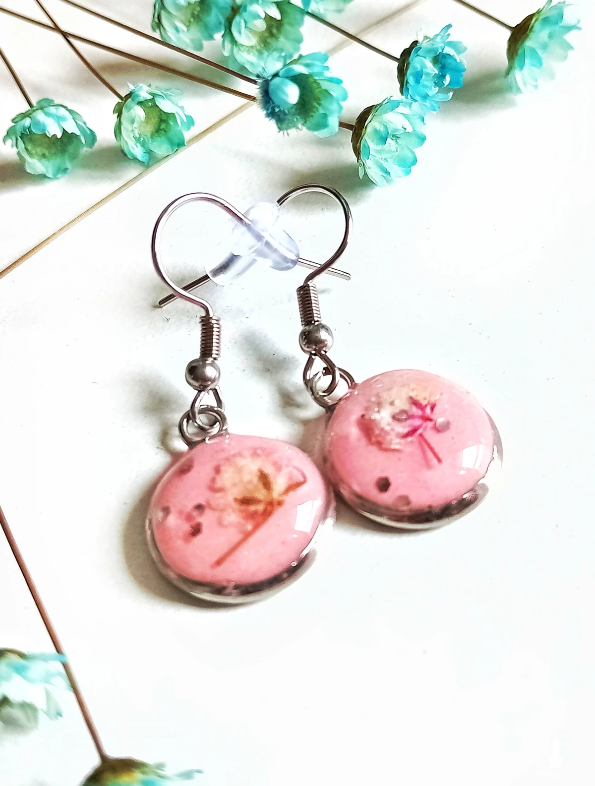 Przedstawiam ręcznie robione kolczyki z żywicy UV z zatopioną suszoną różową gipsówką – każdy egzemplarz to unikat stworzony z sercem i precyzją.