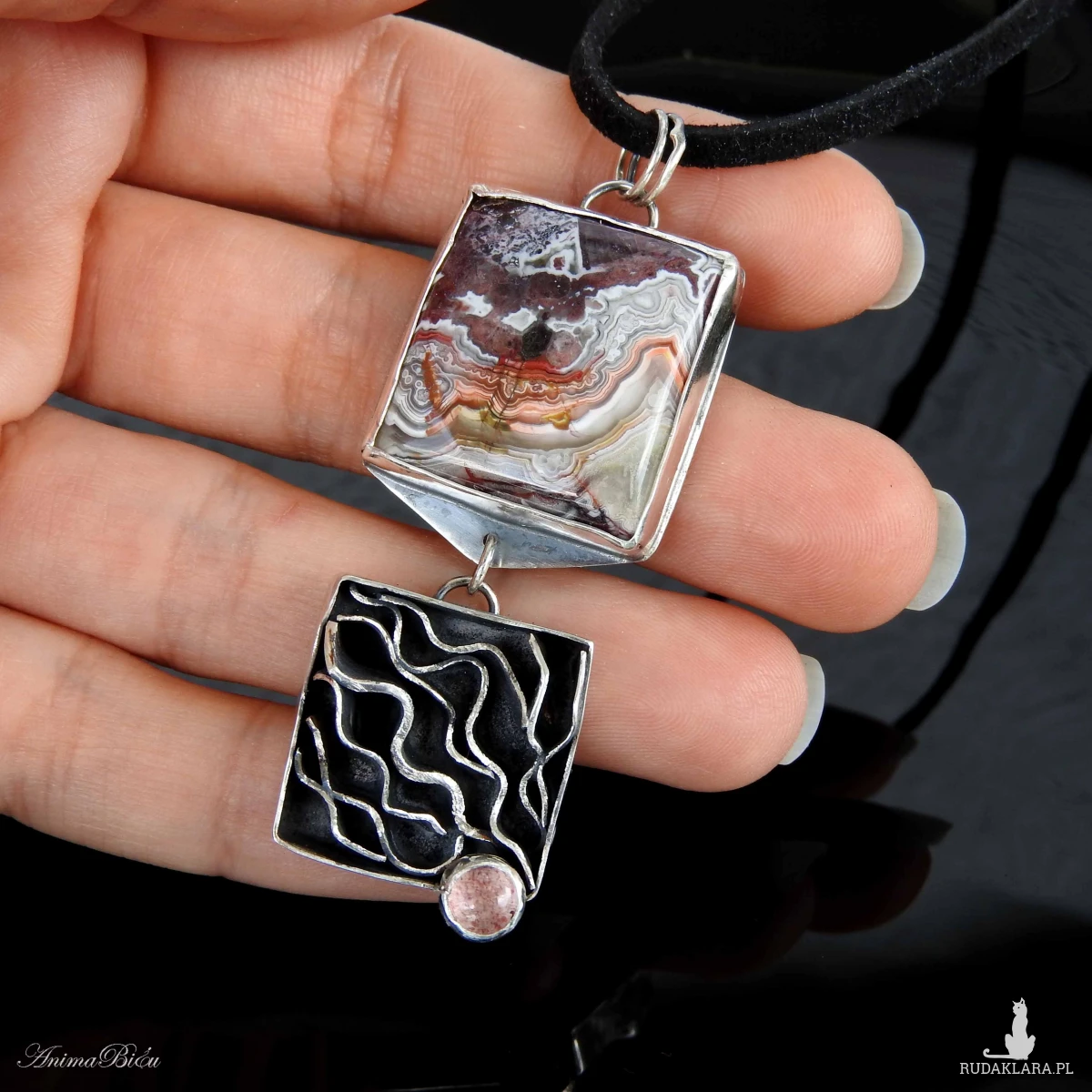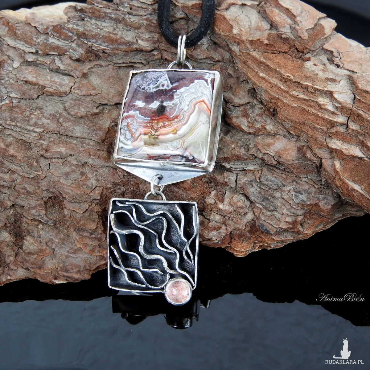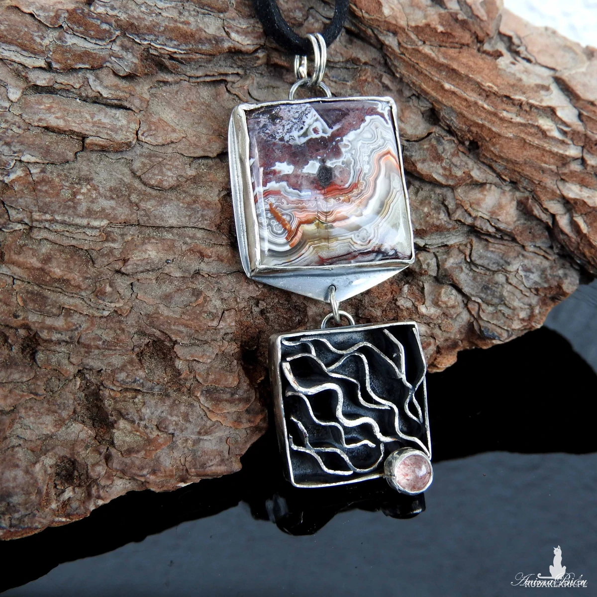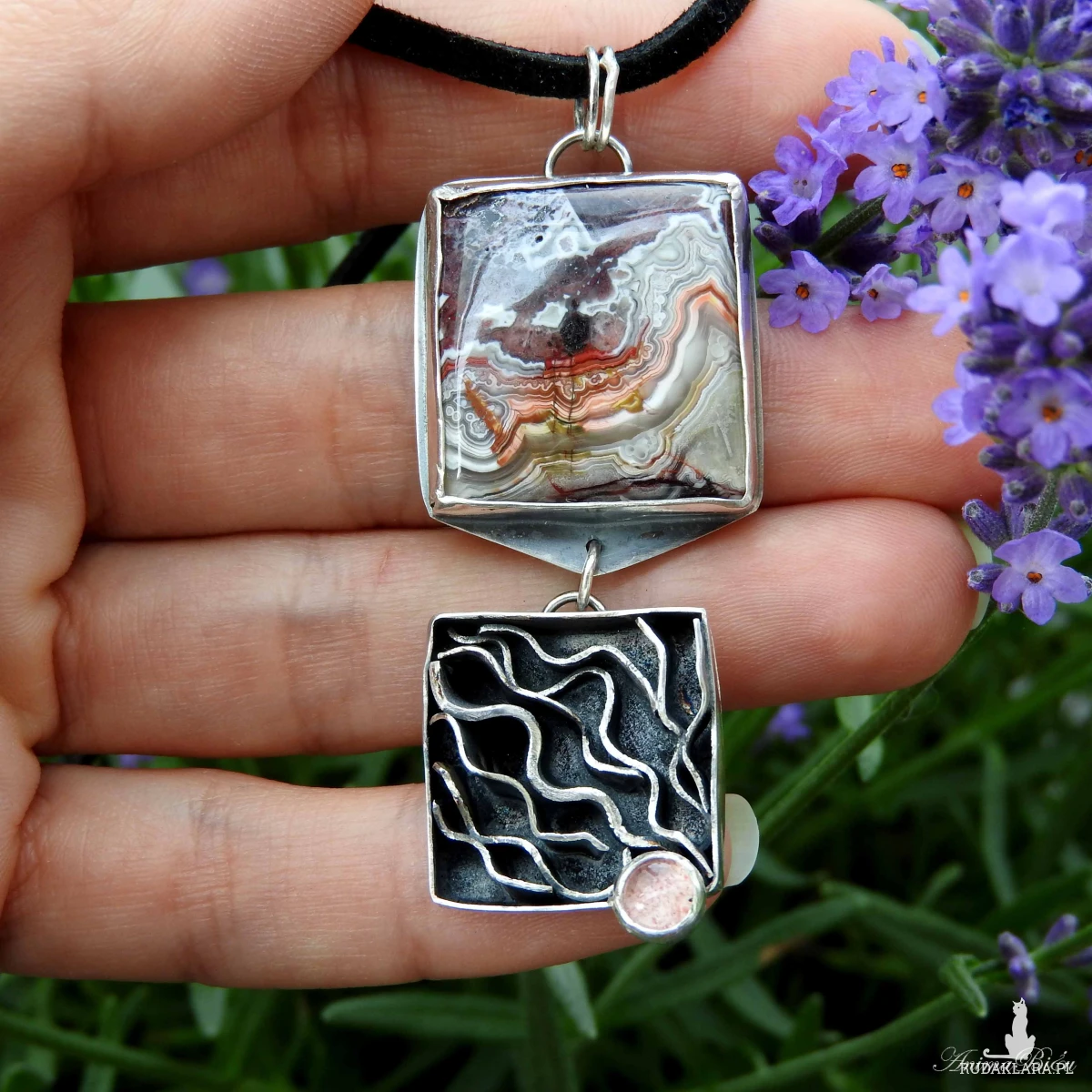 Wisiorek srebrny z agatem crazy lace i kwarcem truskawkowym.