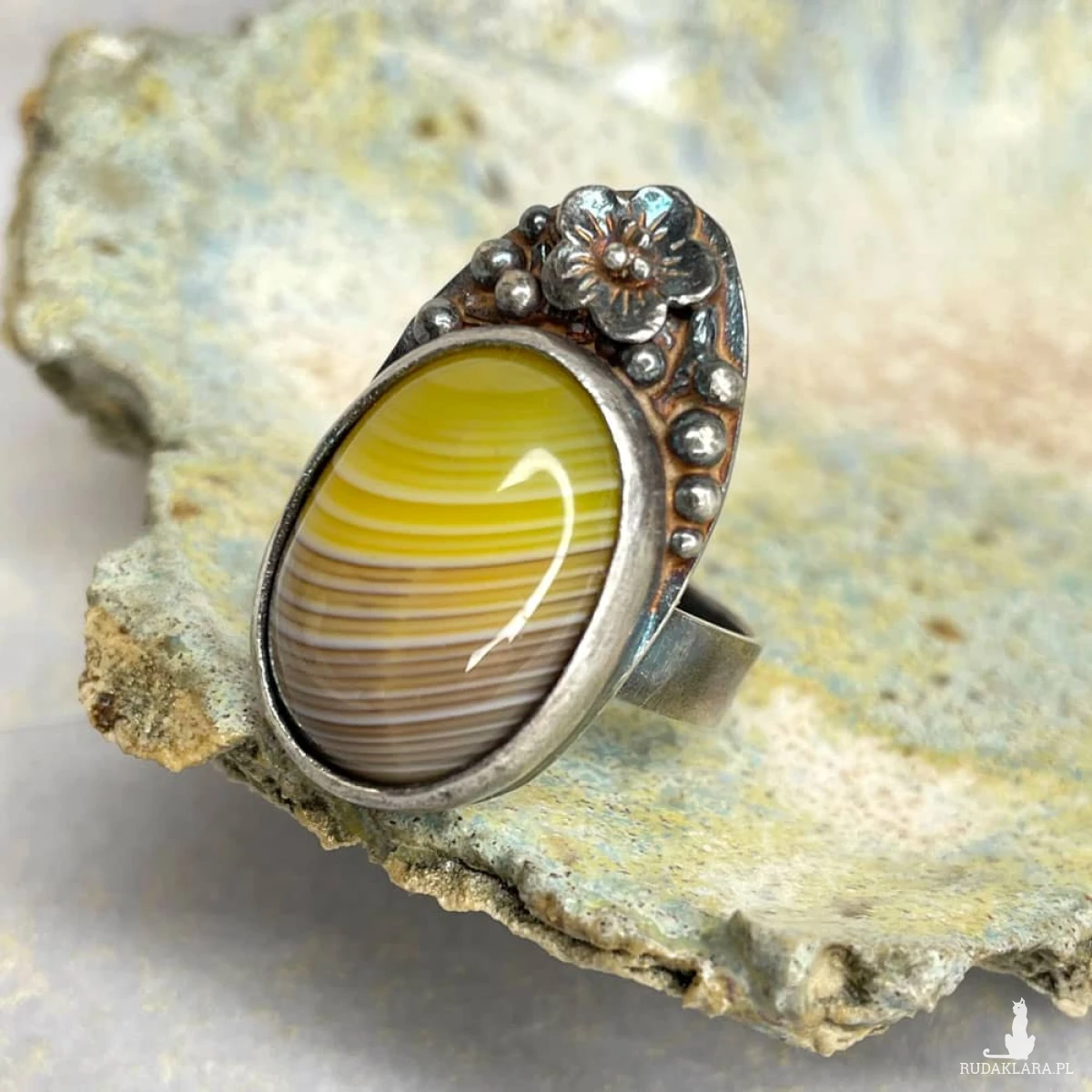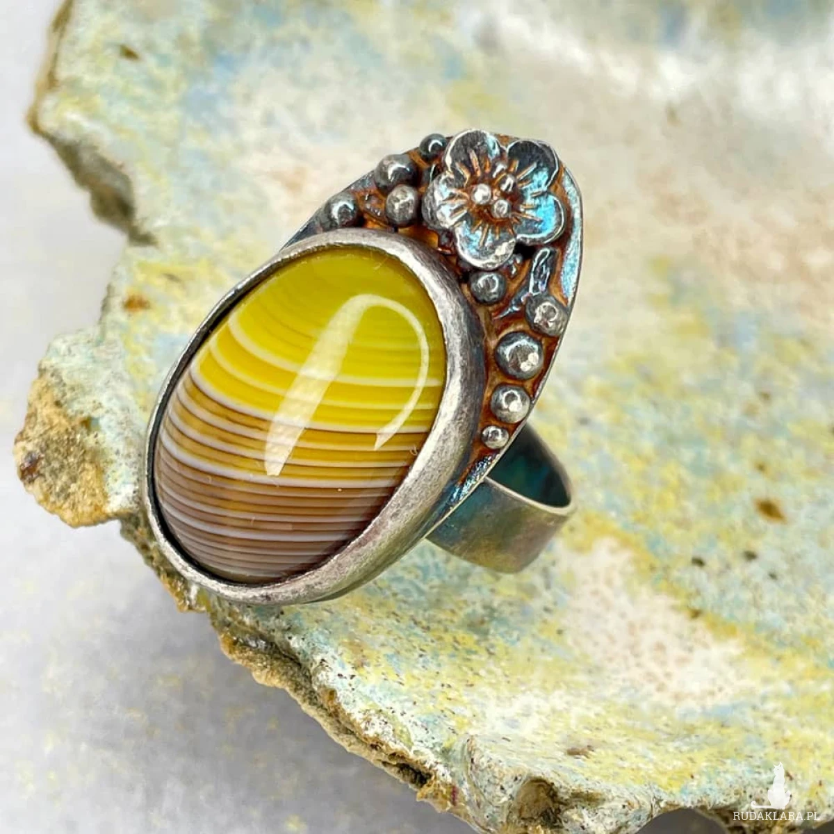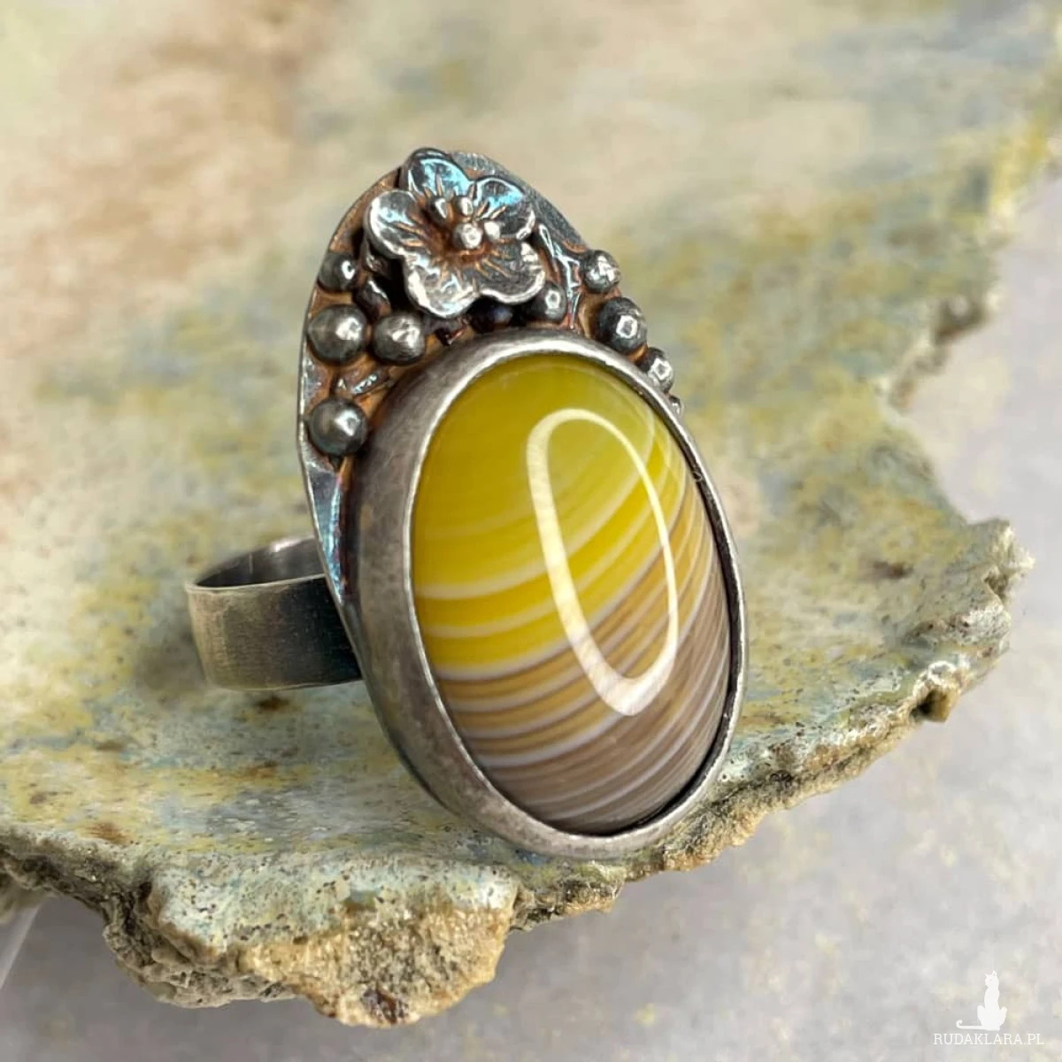 Srebrny pierścionek z prążkowanym agatem to subtelne połączenie klasycznej elegancji i secesyjnego uroku. Kamień zachwyca naturalnym układem barw, które układają się w miękkie, faliste pasma – niczym złote promienie słońca wśród jesiennych liści. Delikatne zdobienia wokół oprawy oraz oksydowane, ręcznie wykończone srebro nadają całości artystycznego wyrazu, podkreślając unikatowy charakter pierścionka. To propozycja dla kobiet, które cenią biżuterię niepowtarzalną, o ponadczasowym pięknie i duszy. Materiał: srebro próby 925, agat Wielkość kamienia: 18 x 15 mm Wielkość korony: 26 x 15 mm Waga: 7,21 g Waga srebra: 4,84 g Rozmiar jubilerski: 15 Biżuteria zostanie elegancko zapakowana. Kolory na zdjęciach mogą delikatnie różnić się od rzeczywistych ze względu na różne ustawienia monitorów.