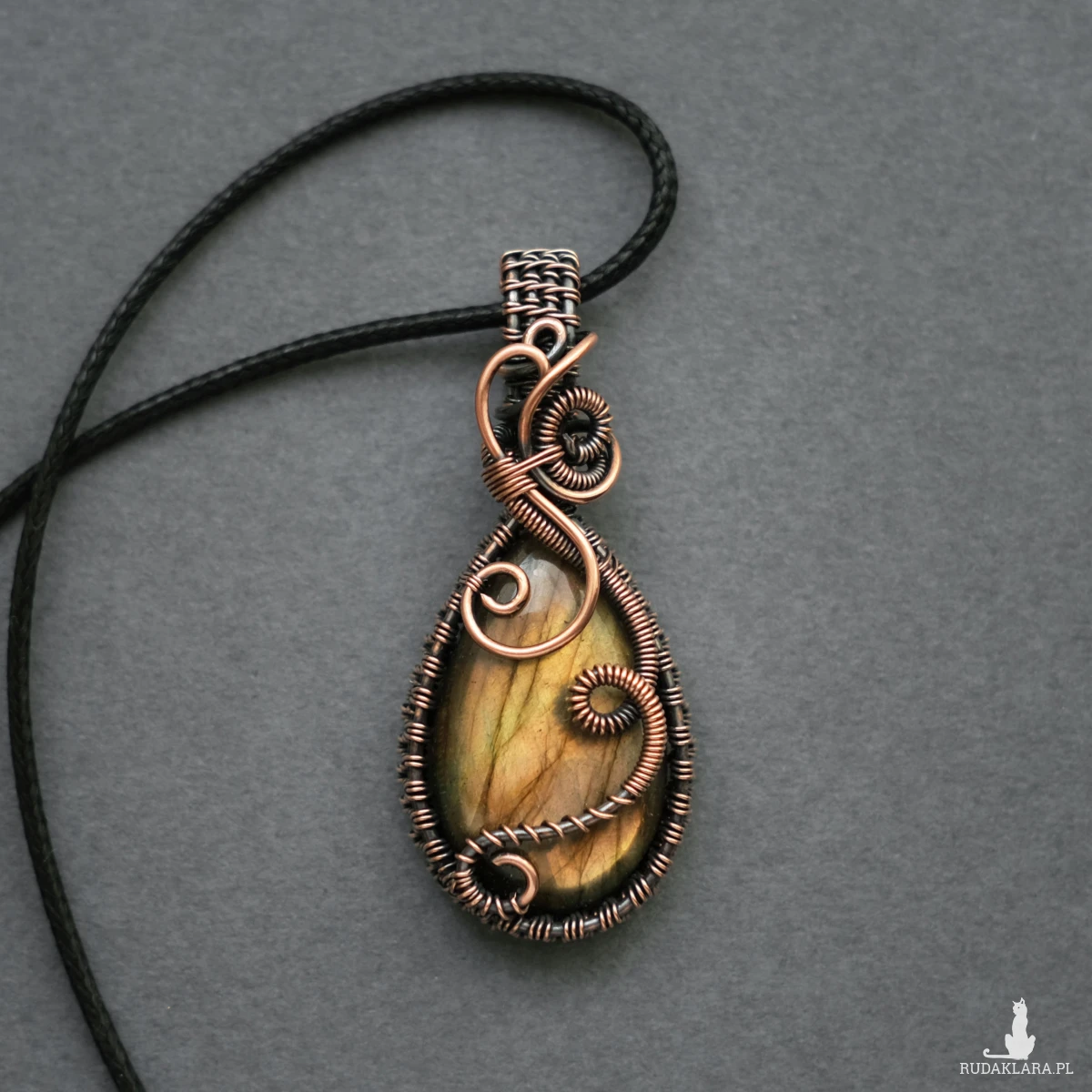 Miedziany wisiorek mieści w sobie kamień labradorytu o pięknej żółto-pomarańczowej iryzacji. Posiada ozdobne boczki i fantazyjne sploty miedzianego drutu. Wisiorek jest unikatem, doda Twojej stylizacji oryginalności :-)