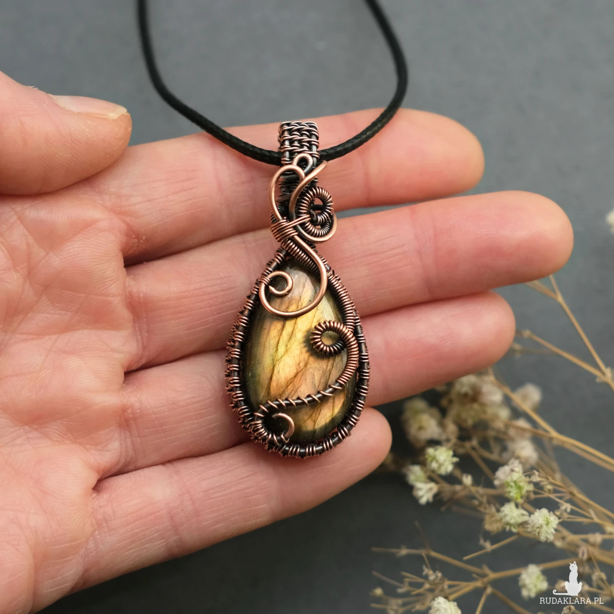 Oprawę wykonałam własnoręcznie pracochłonną techniką wire wrapping. Miedź poddałam oksydacji w celu uszlachetnienia barwy i nadania efektu patyny.