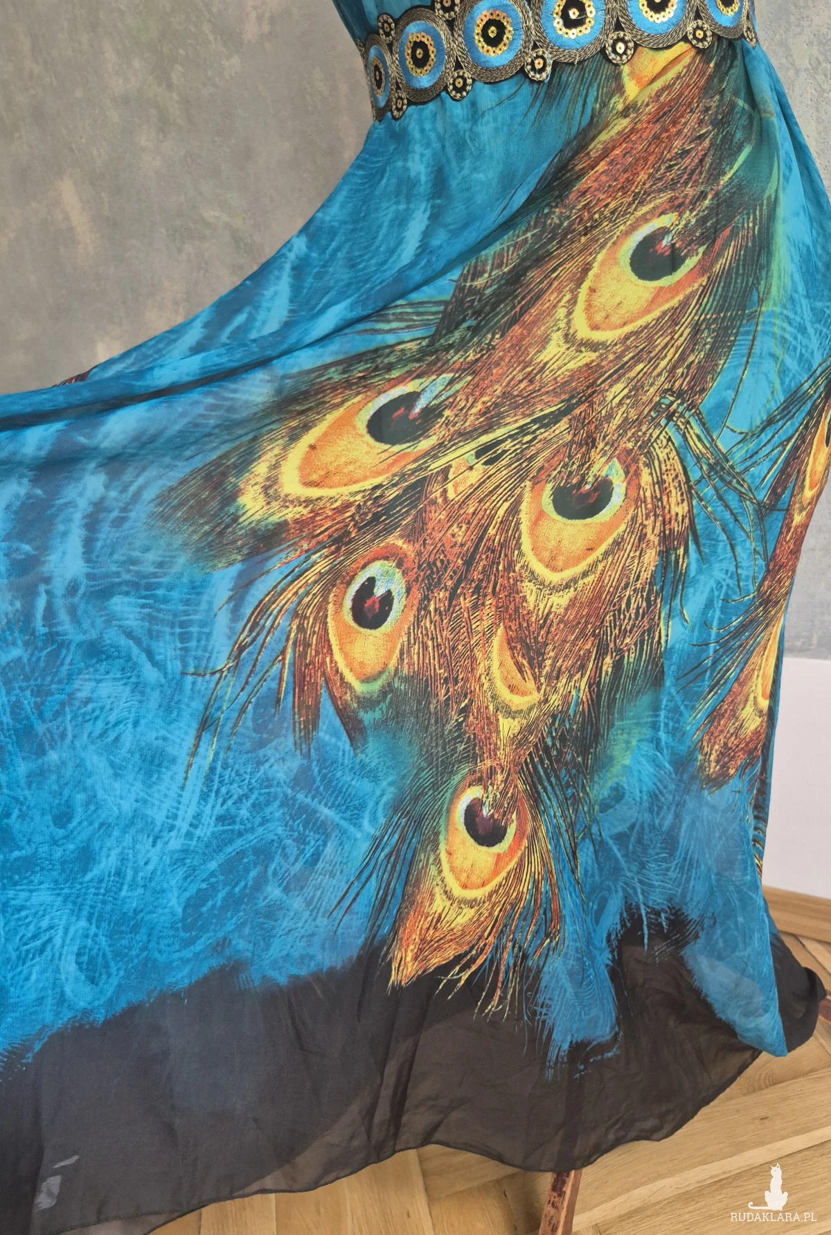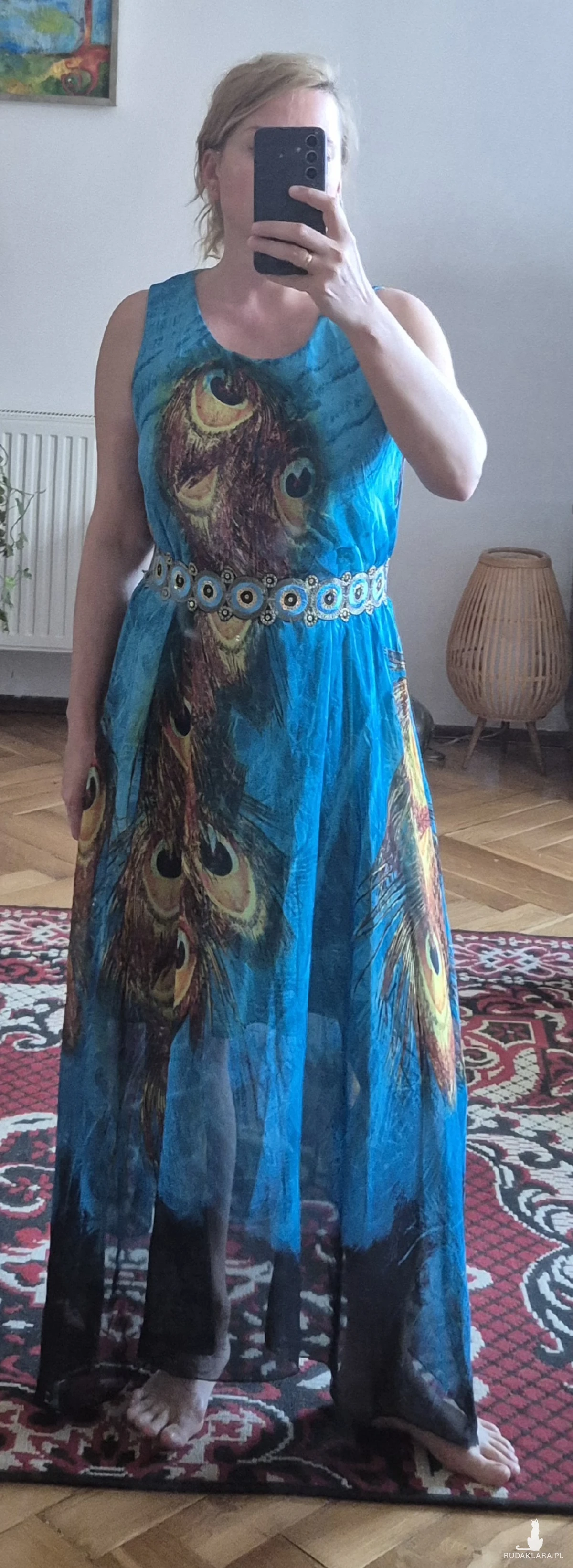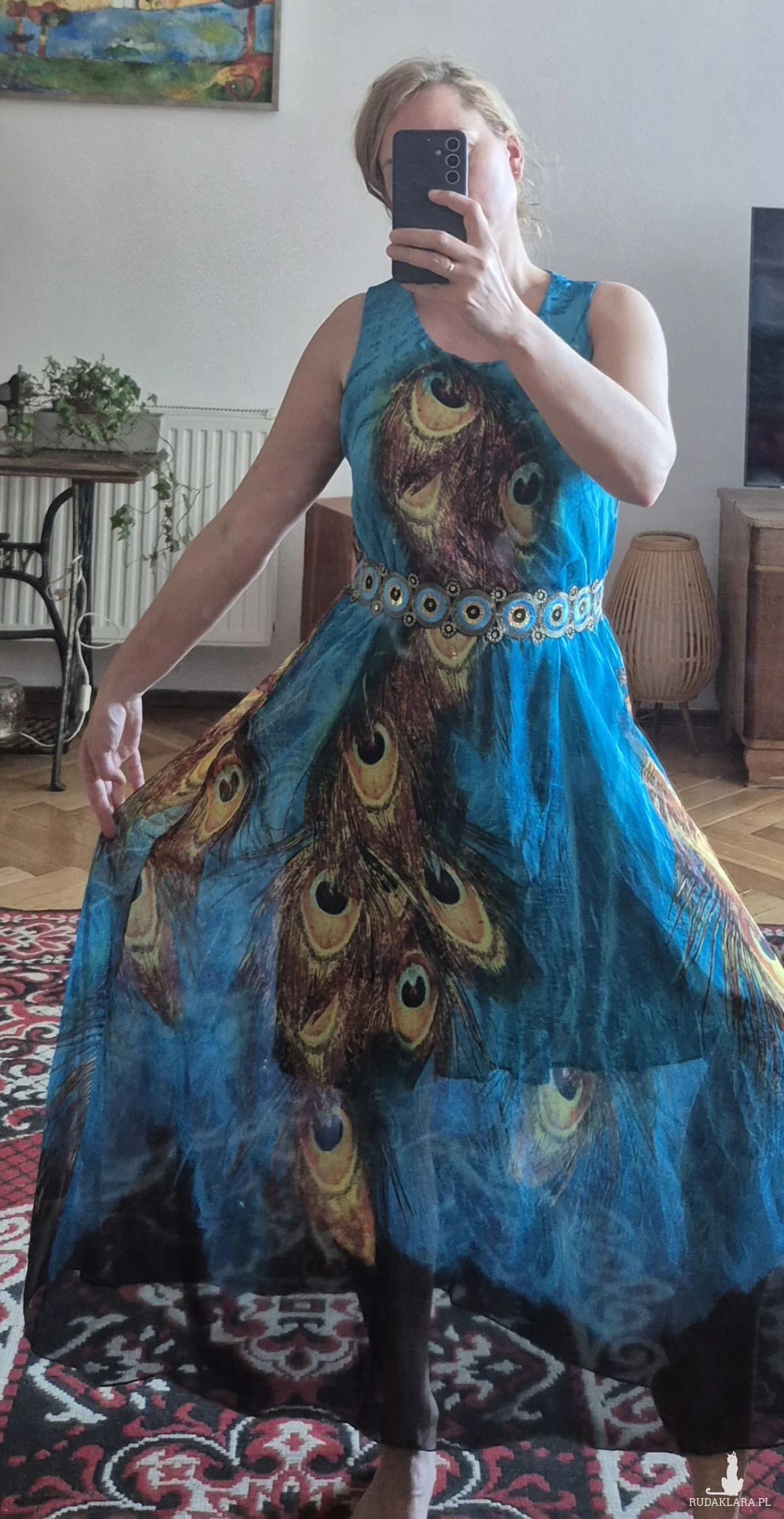 Niebieska długa sukienka w pawie pióra na podszewce ,bardzo elegancka i ciekawa, na dole kilka przebarwień pokazanych na zdjęciu, białawe odbarwienie tiulu, w całości sukienki tego nie widać długość sukienki 138 cm,odległość pacha pacha 52cm, można ją nosić z paskiem albo bez pasek cekinowy pokazany na zdjęciu końcówki paska wszczepione nie było tak fabrycznie, zostały nieumiejętnie zszyte, mimo tego sukienka jest piękna