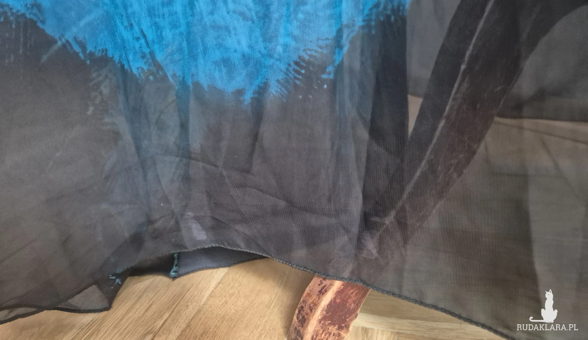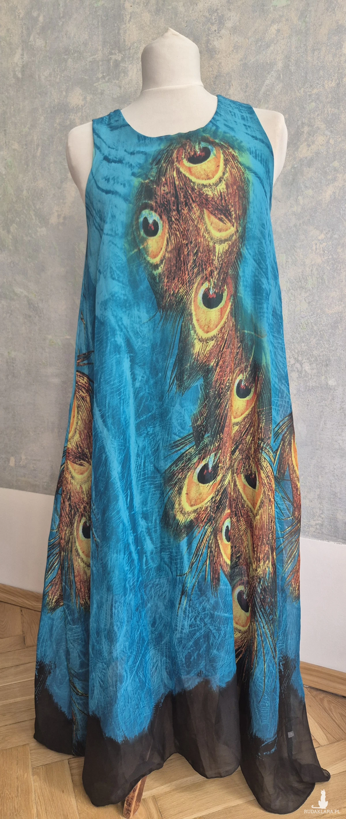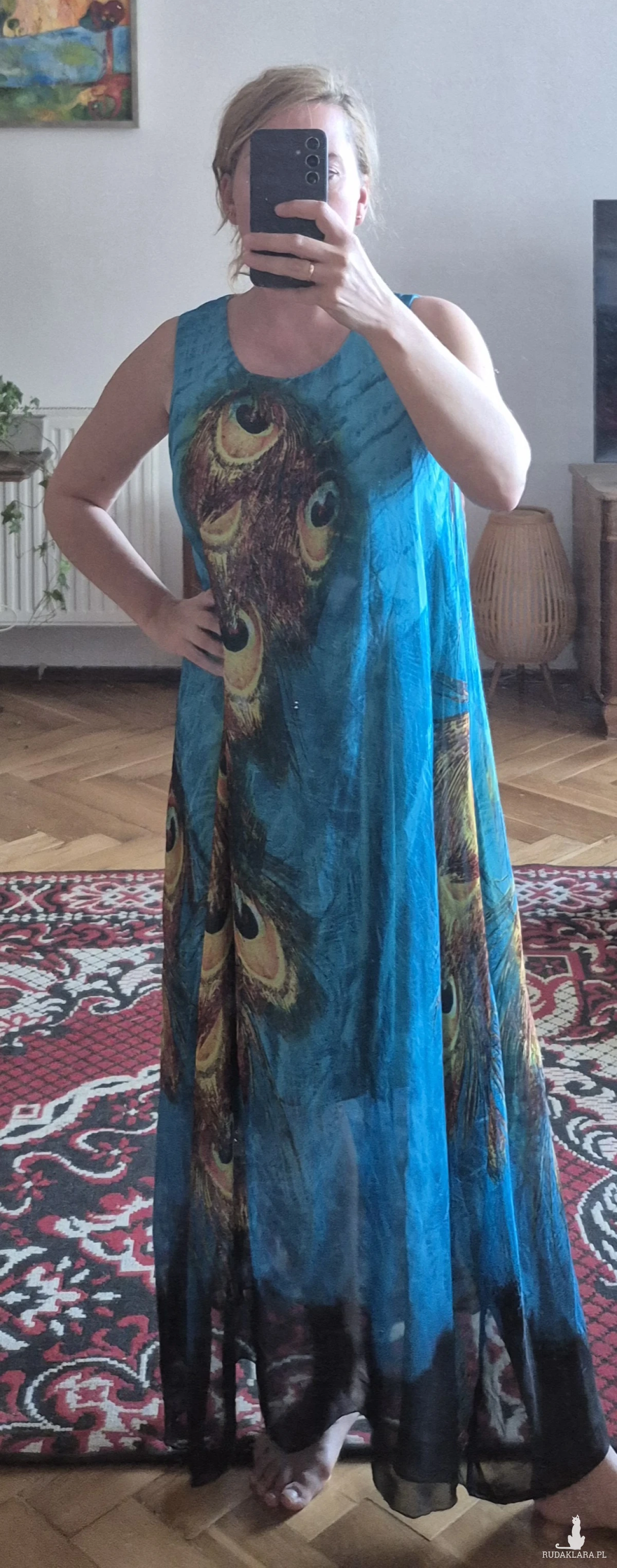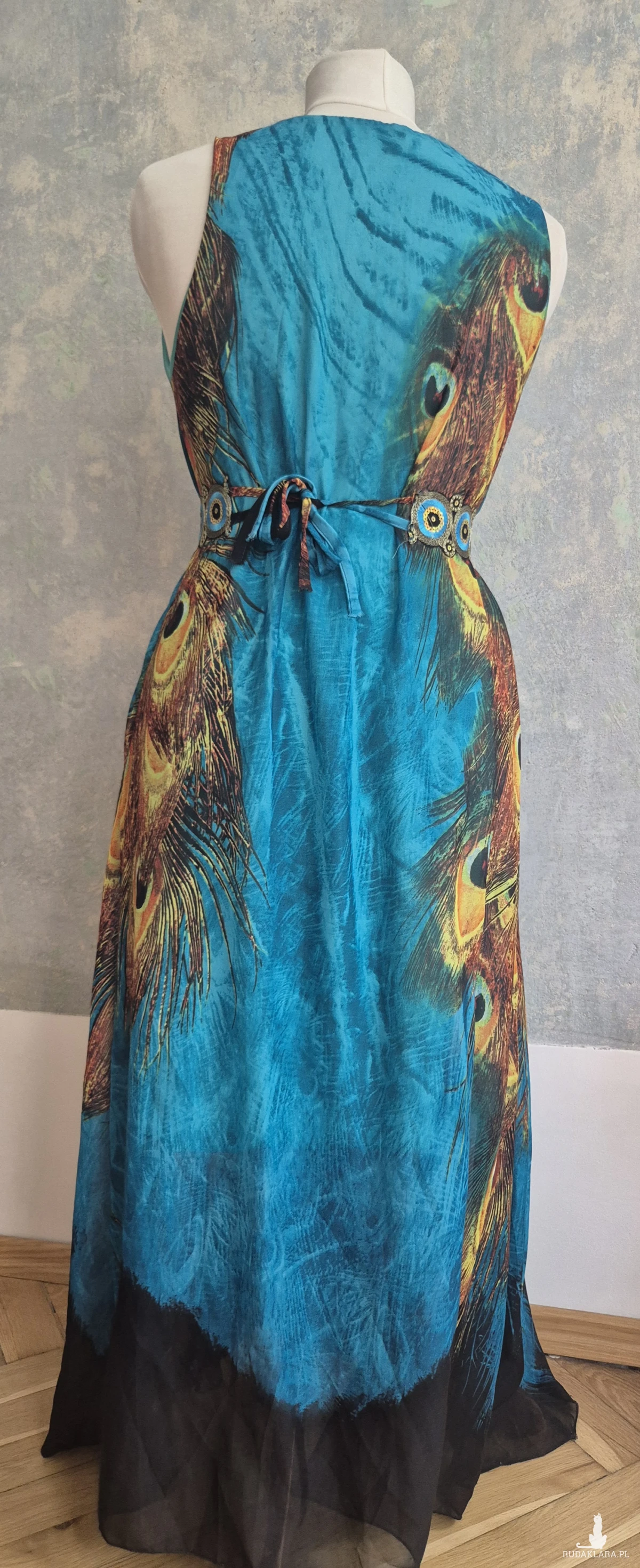 Niebieska długa sukienka w pawie pióra na podszewce ,bardzo elegancka i ciekawa, na dole kilka przebarwień pokazanych na zdjęciu, białawe odbarwienie tiulu, w całości sukienki tego nie widać długość sukienki 138 cm,odległość pacha pacha 52cm, można ją nosić z paskiem albo bez pasek cekinowy pokazany na zdjęciu końcówki paska wszczepione nie było tak fabrycznie, zostały nieumiejętnie zszyte, mimo tego sukienka jest piękna