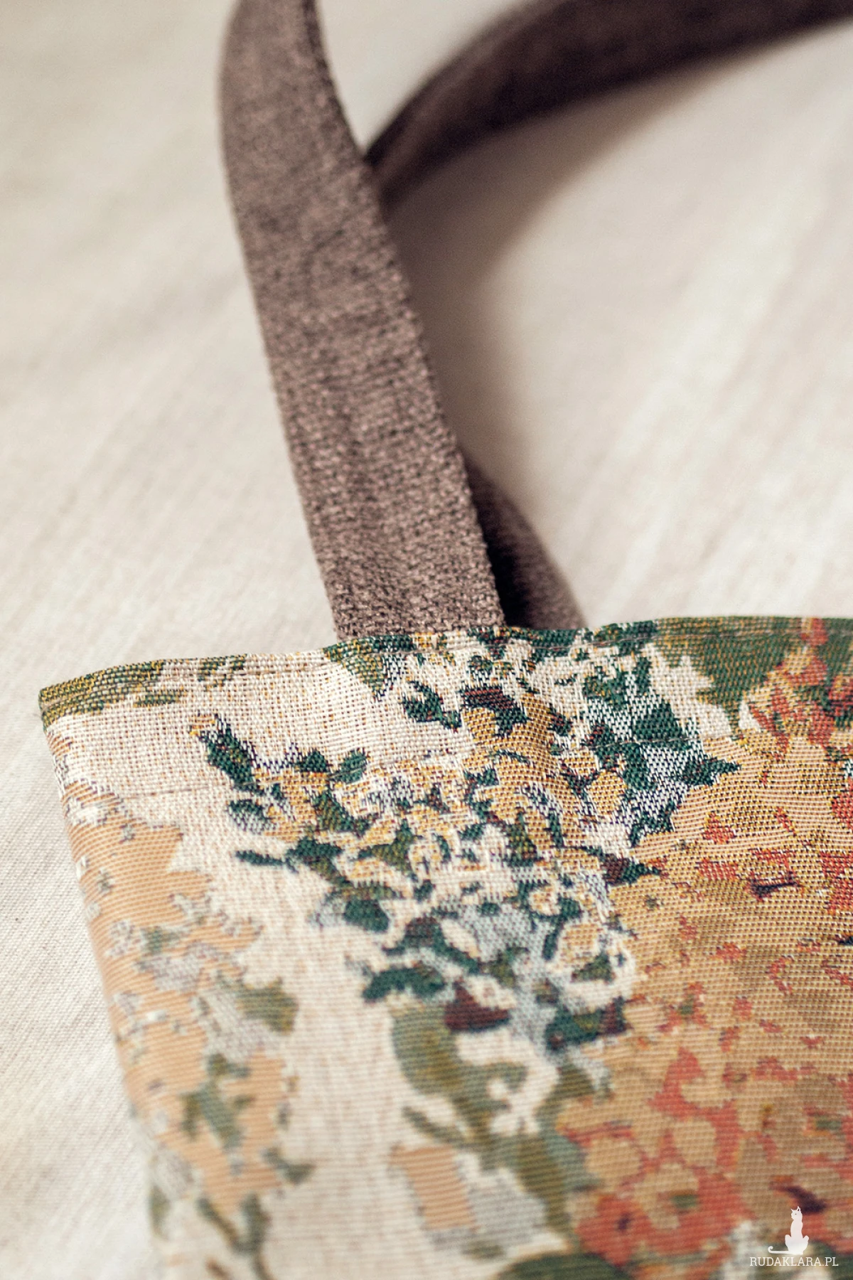 Duża torba na ramię typu shopper wykonana z plecionki w kolorze kawy z mlekiem oraz żakardu w kwiaty.
