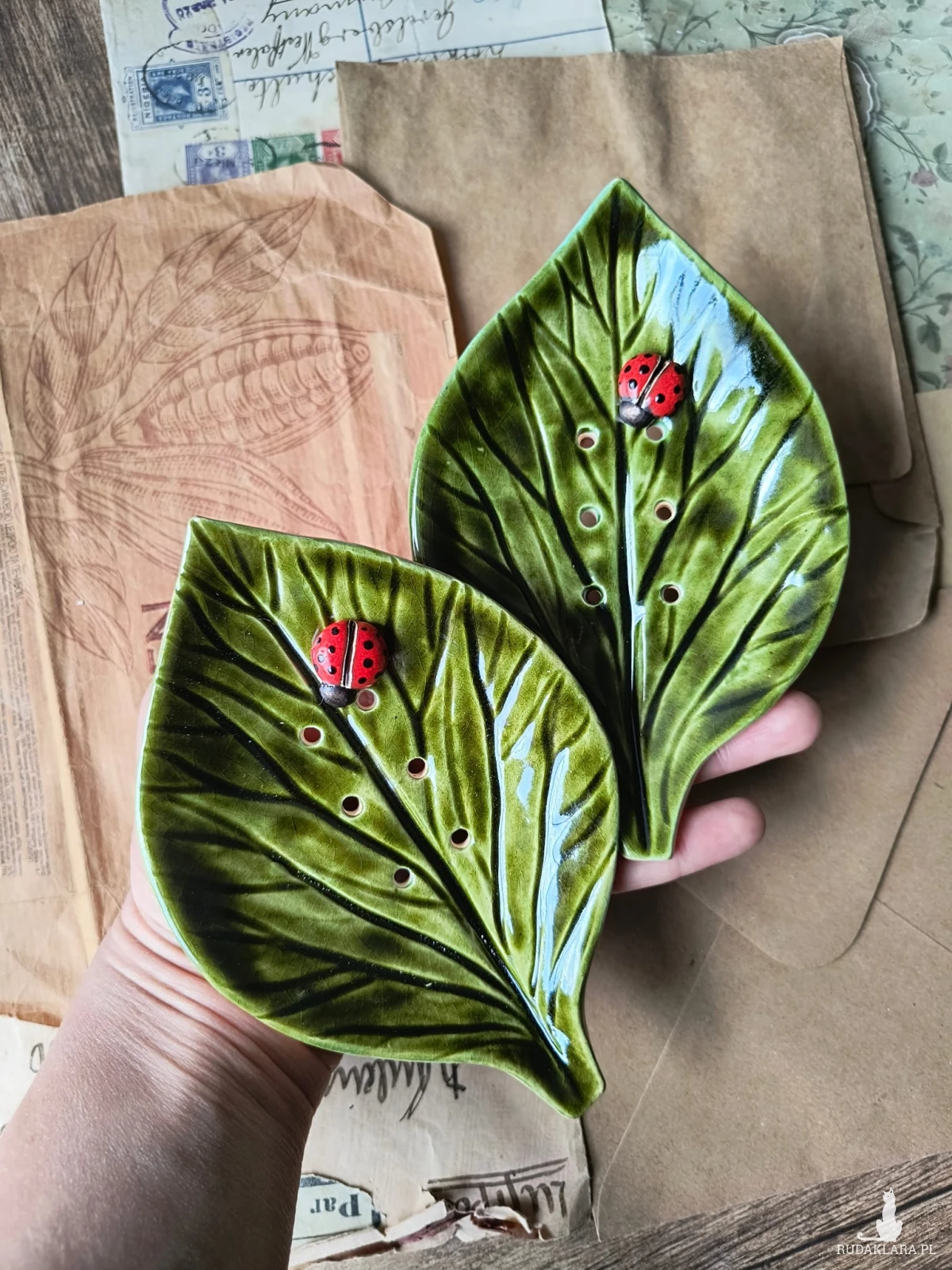 Mydelniczki ceramiczne w kształcie liścia, wykonane z gliny szamotowej wypalone na biskwit, a następnie szkliwione w temperaturze 1260 stopni C. Wymiary ok 13,5 x 8 cm cm. W pięknej butelkowej kolorystyce. Idealne do ozdoby domu lub jako prezent okolicznościowy. Serdecznie polecam!!!
