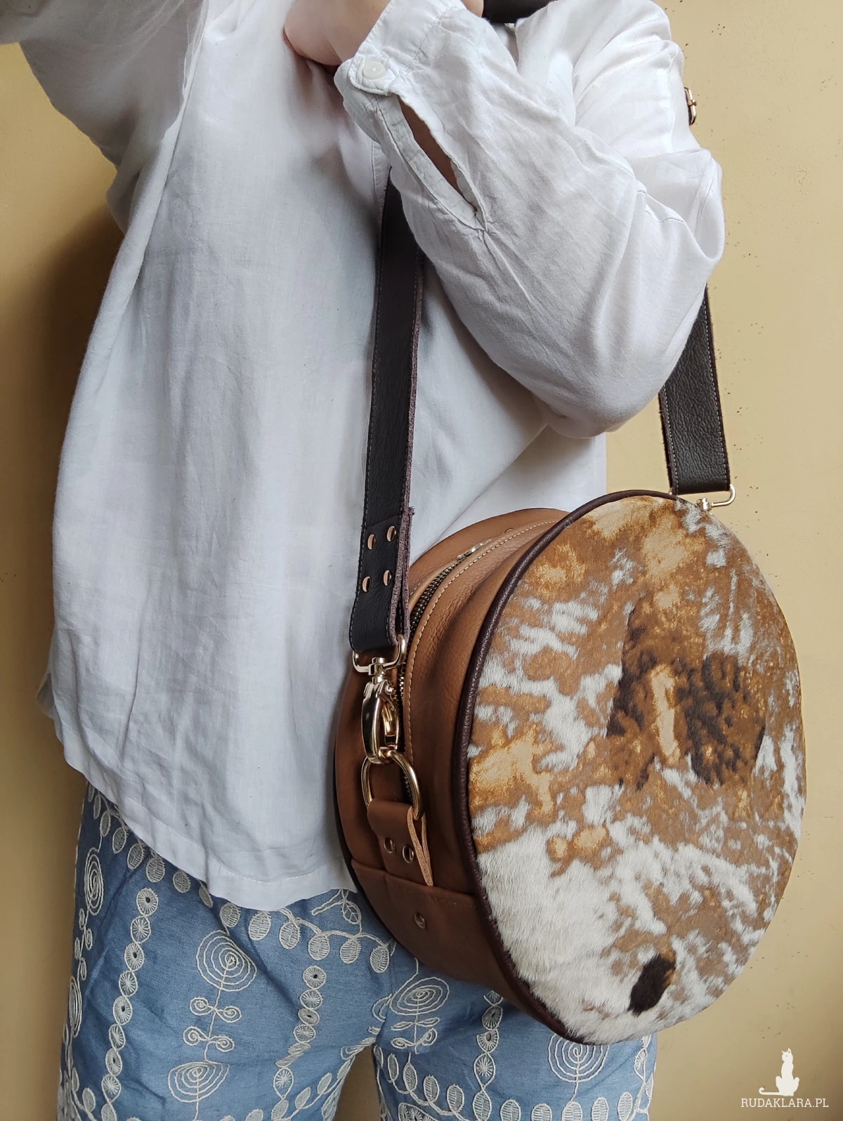 Oryginalna torebka o okrągłym kształcie, wykonana ręcznie w autorskiej pracowni z najwyższej jakości naturalnych skór. Po przepięciu pasków można ją nosić jak plecak. To projekt jedyny w swoim rodzaju – powstał w pojedynczym egzemplarzu, z myślą o osobach, które poszukują niepowtarzalnych dodatków z duszą.