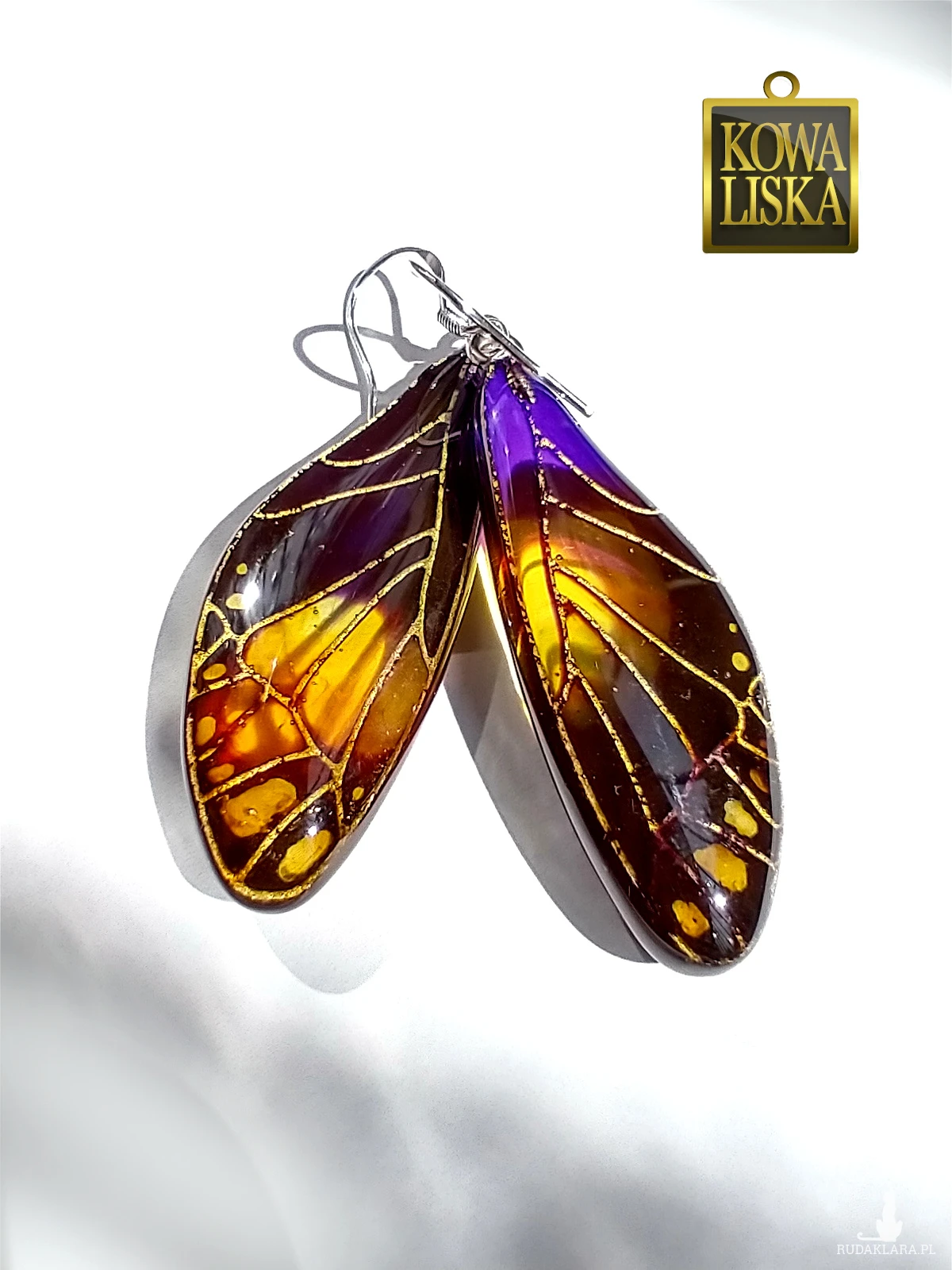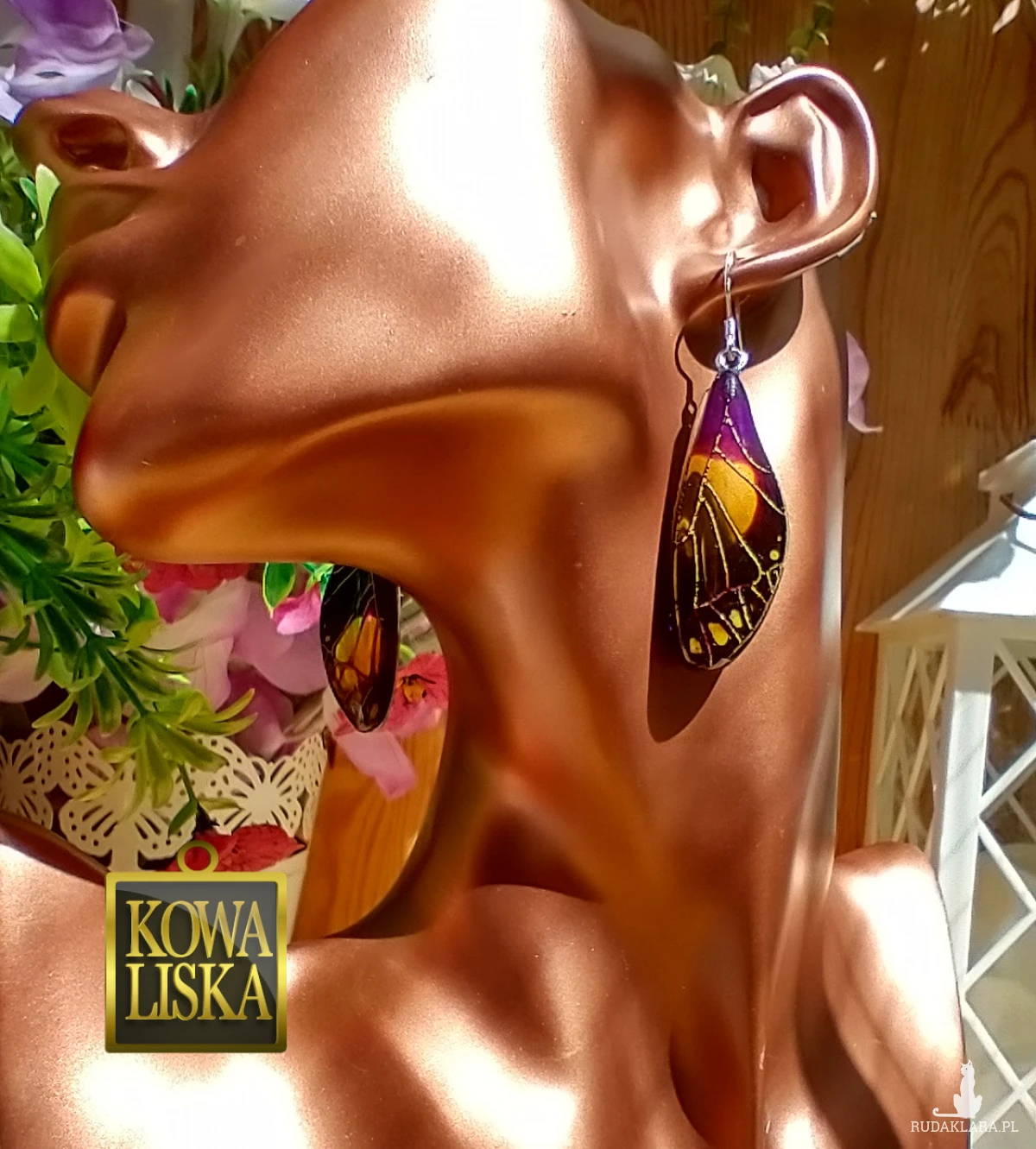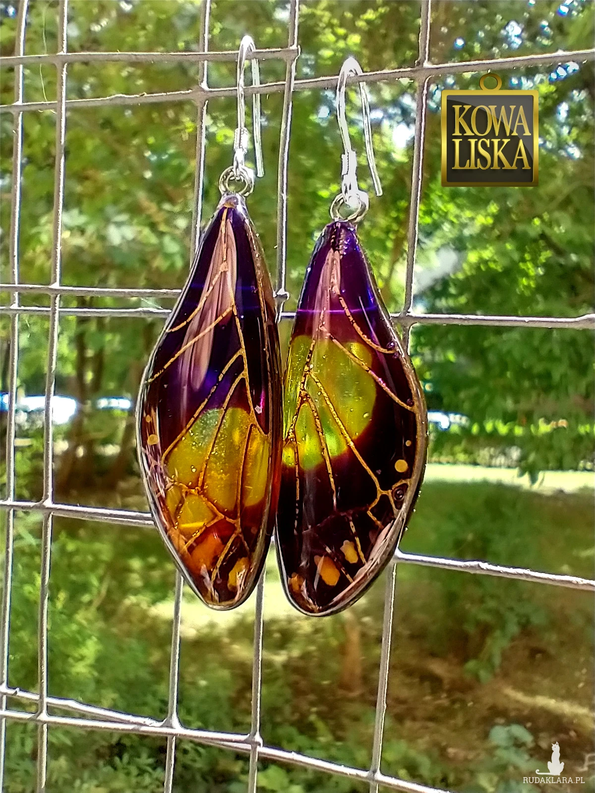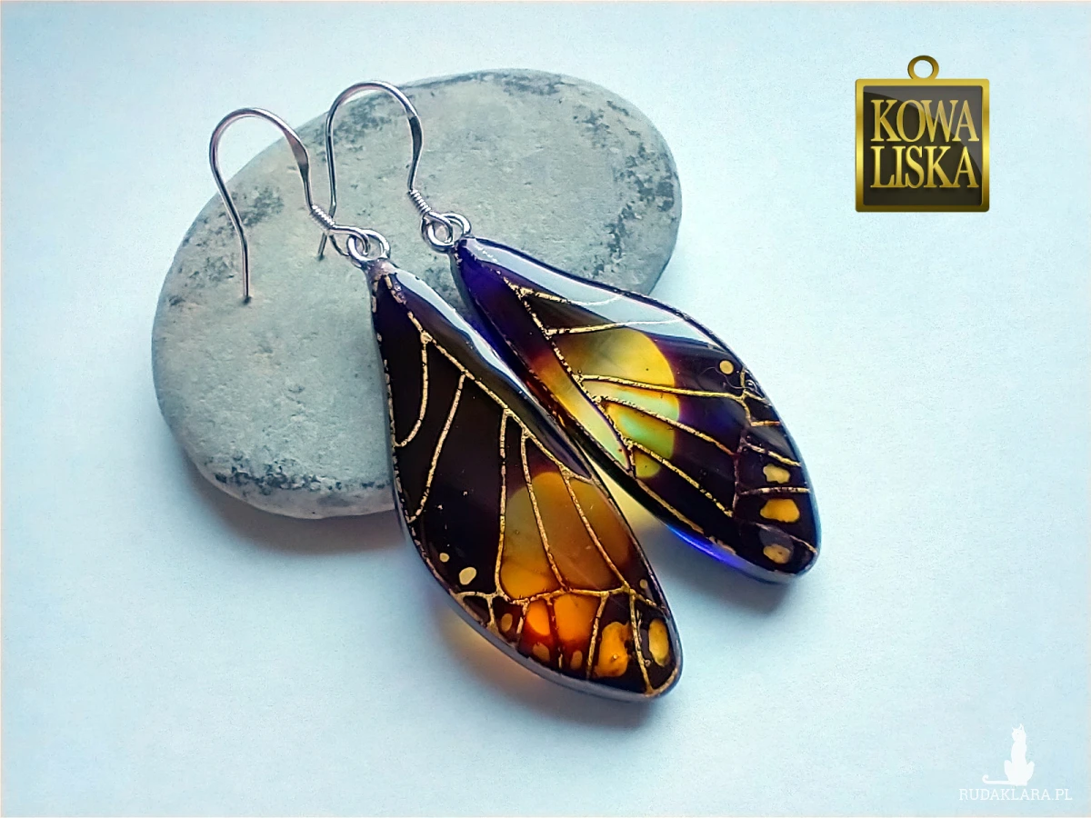Lśniące fioletowo-bursztynowym blaskiem skrzydła motyla przepięknie podkreślą Twoją urodę, zarówno w ciepłe, słoneczne dni, jak i podczas wieczornego wyjścia. Złote żyłowania mienią się w słońcu... Skuś się...