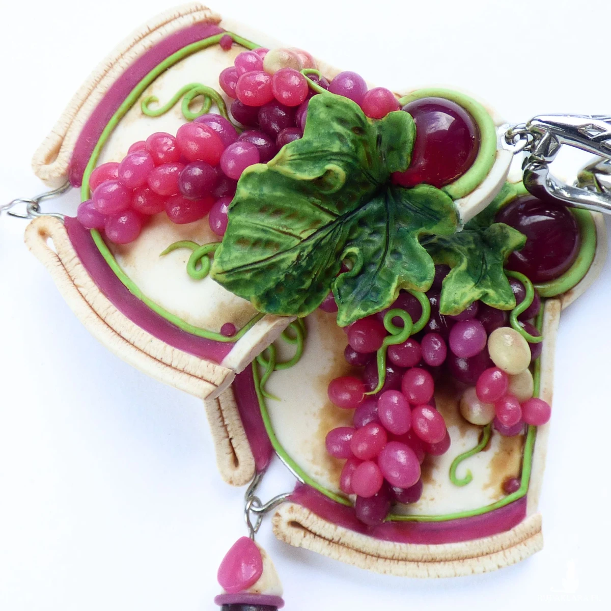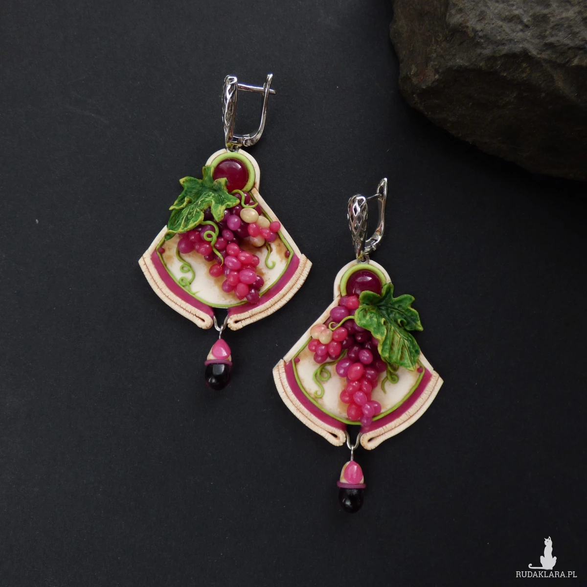 Ta efektowna para kolczyków przedstawia kiście winogron, których poszczególne owoce są na różnych etapach dojrzewania – od bladozielonych, jeszcze niedojrzałych kuleczek, po głęboko bordowe, soczyste owoce gotowe do zbioru. Winogrona w różnych kolorach i wielkościach ukazują piękno przemiany i cykliczności natury. Kompozycja liści, wijących się pędów winorośli oraz subtelnych detali nadaje biżuterii naturalny, artystyczny charakter.