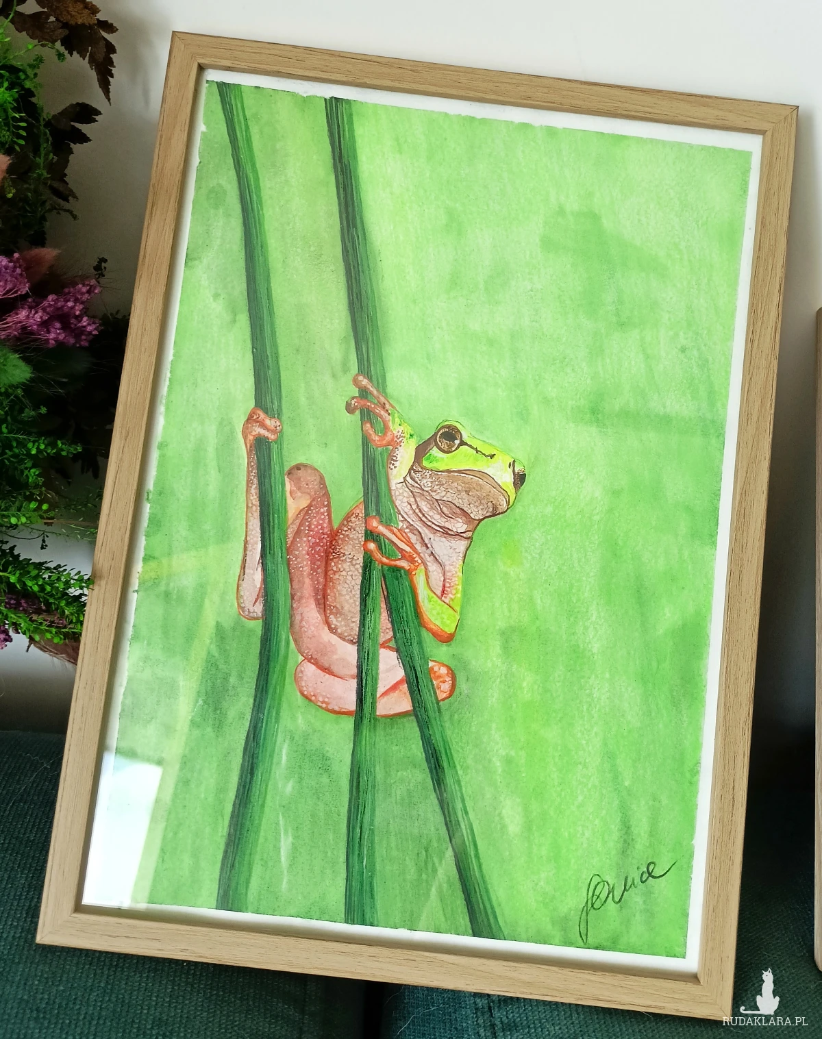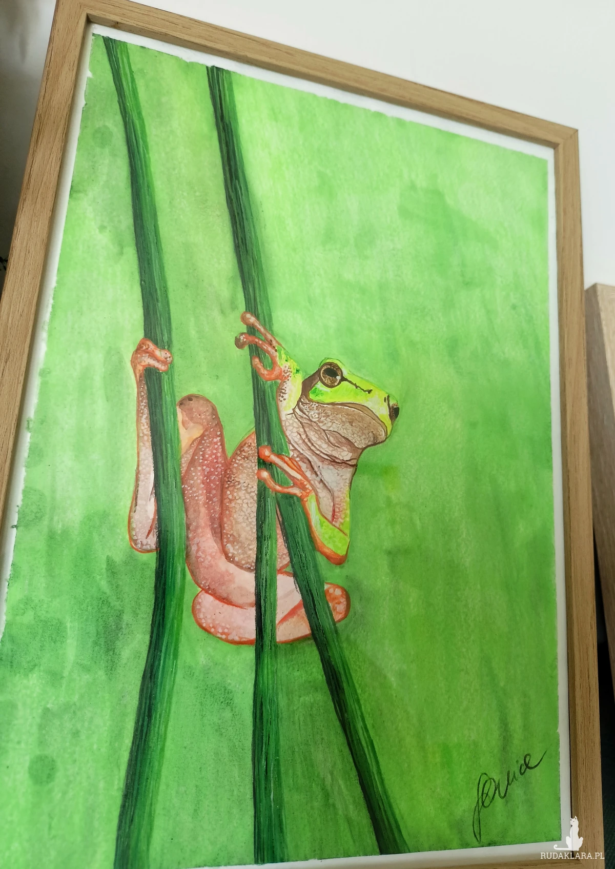 obraz żaba akwarela, rzekotka zielona ilustracja, akwarela ręcznie malowana, dekoracja ścienna z motywem natury, obraz A4 w ramce, rękodzieło akwarela, prezent dla miłośnika zwierząt, żaba do dekoracji, obrazek zielona żaba, sztuka botaniczna, obraz z ramką drewnianą