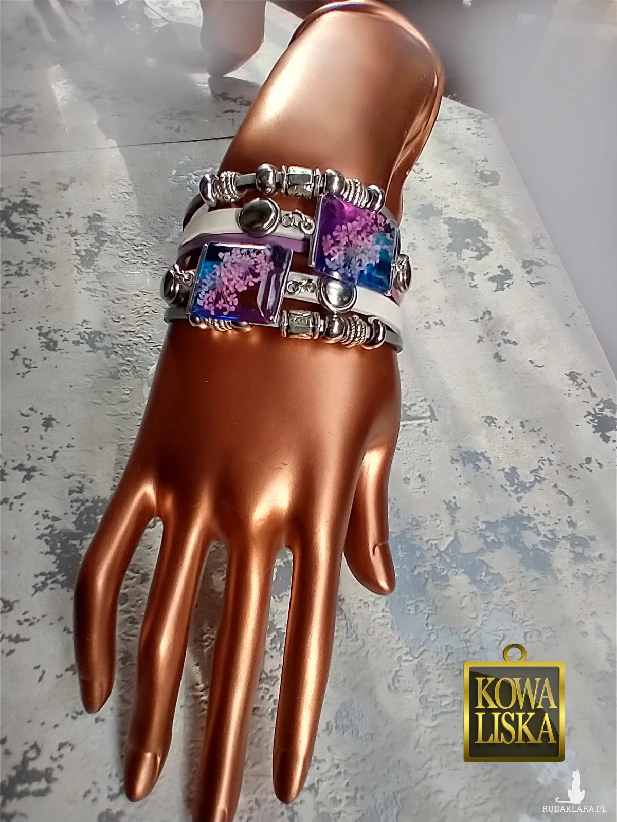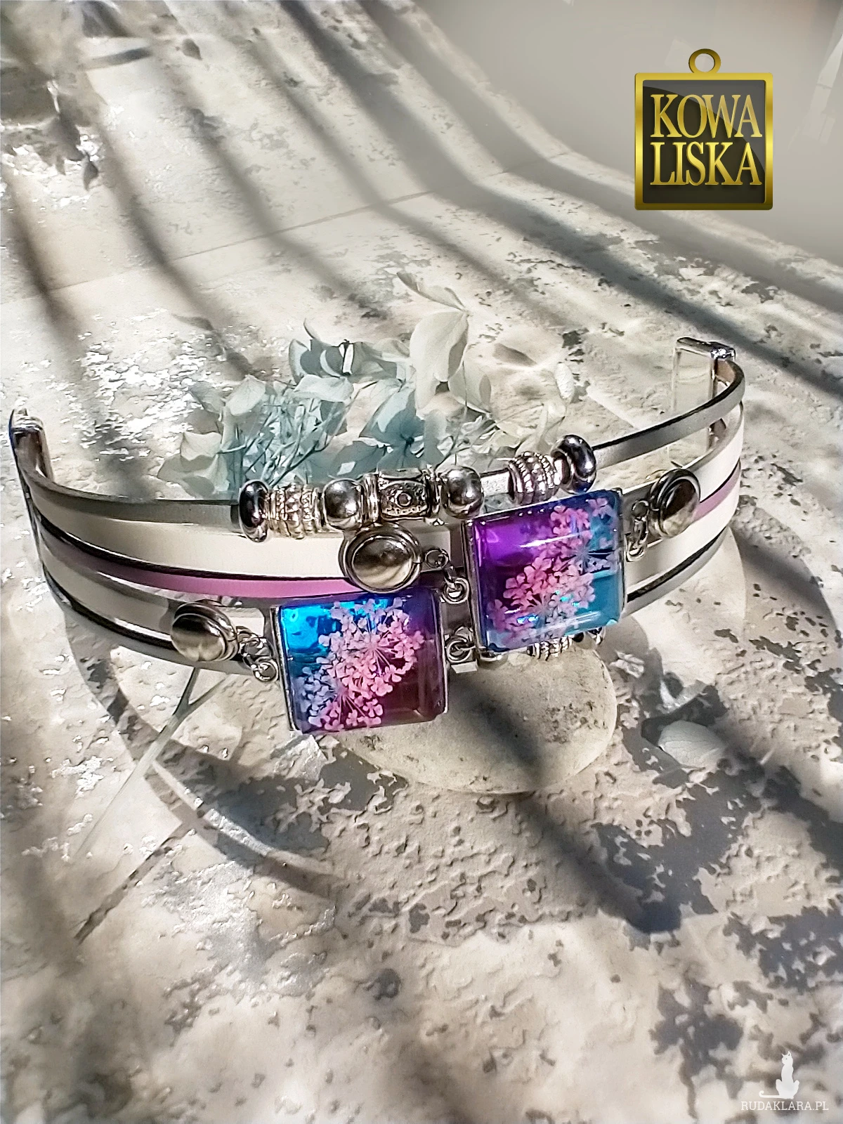 Ciężkość rzemieni i metalu pięknie się uzupełnia z eterycznością żywicy i kwiatów. Bransoleta bardzo dobrze leży i pięknie odbija światło, jest widoczna z daleka. Słońce wydobywa z niej ciepły, słoneczny blask, idealna na lato.