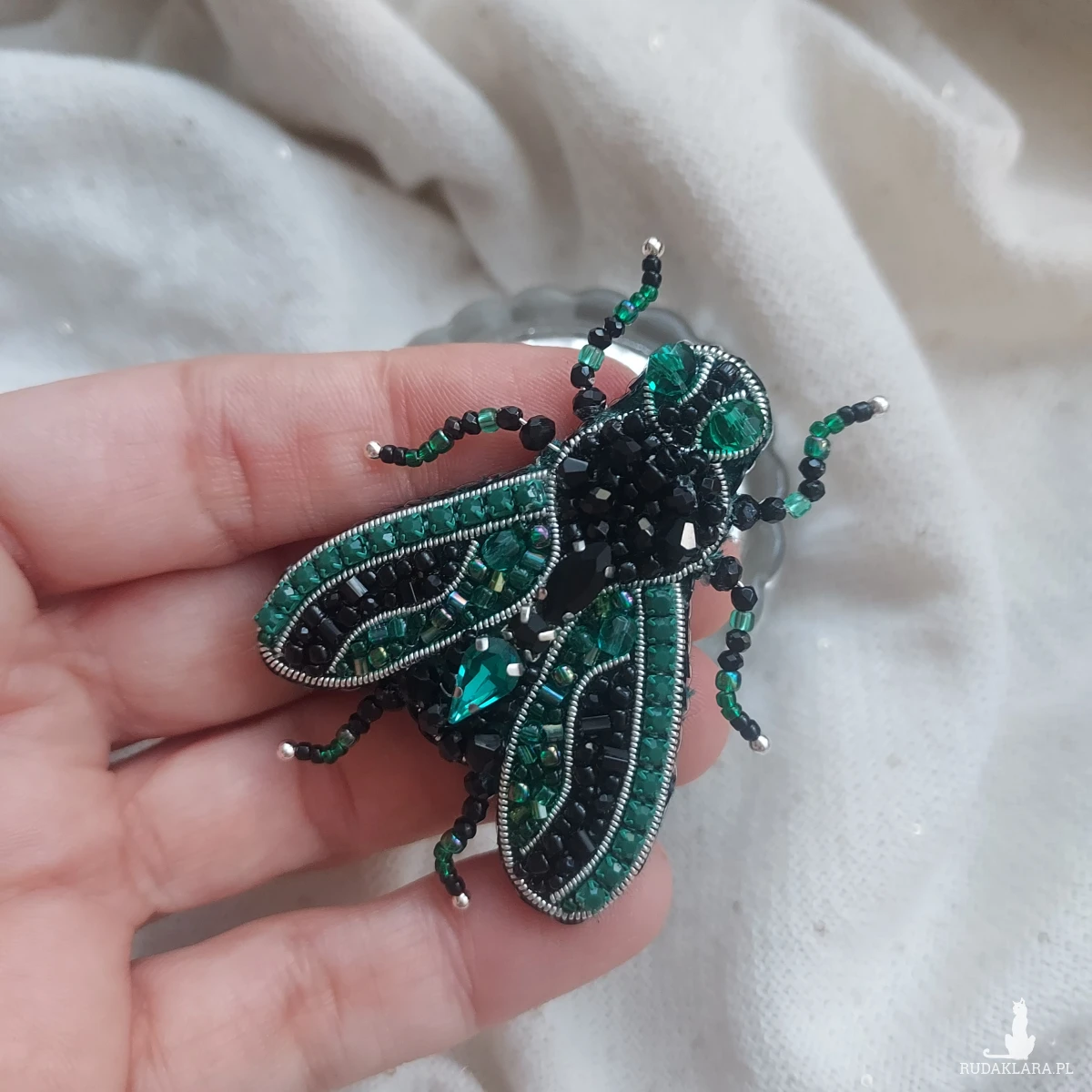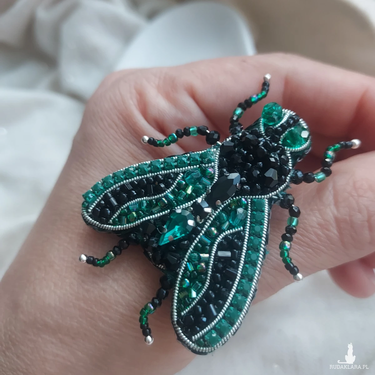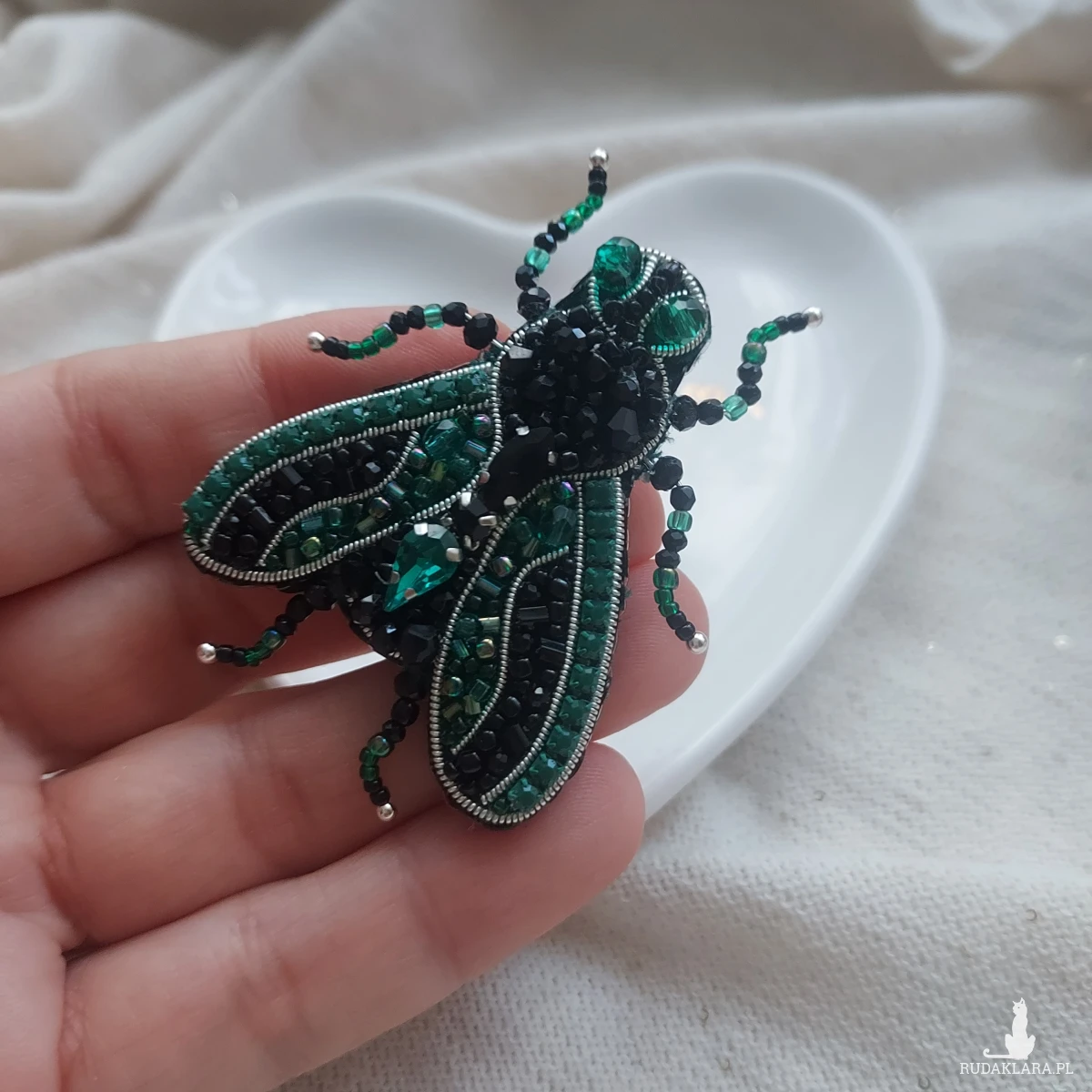 Odkryj piękno natury z wyjątkową broszką cza-szmaragdowo-czarną broszką w kształcie muchy.