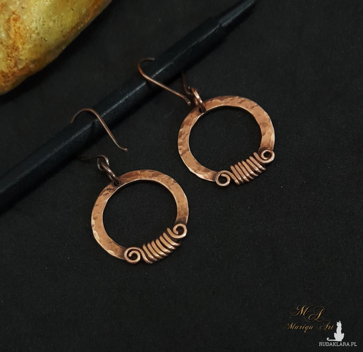 Kolczyki koła wykonane z miedzi oksydowanej, młotkowanej. Średnica koła to 2 cm natomiast długość kolczyka wraz z biglem wynosi 3,9 cm.