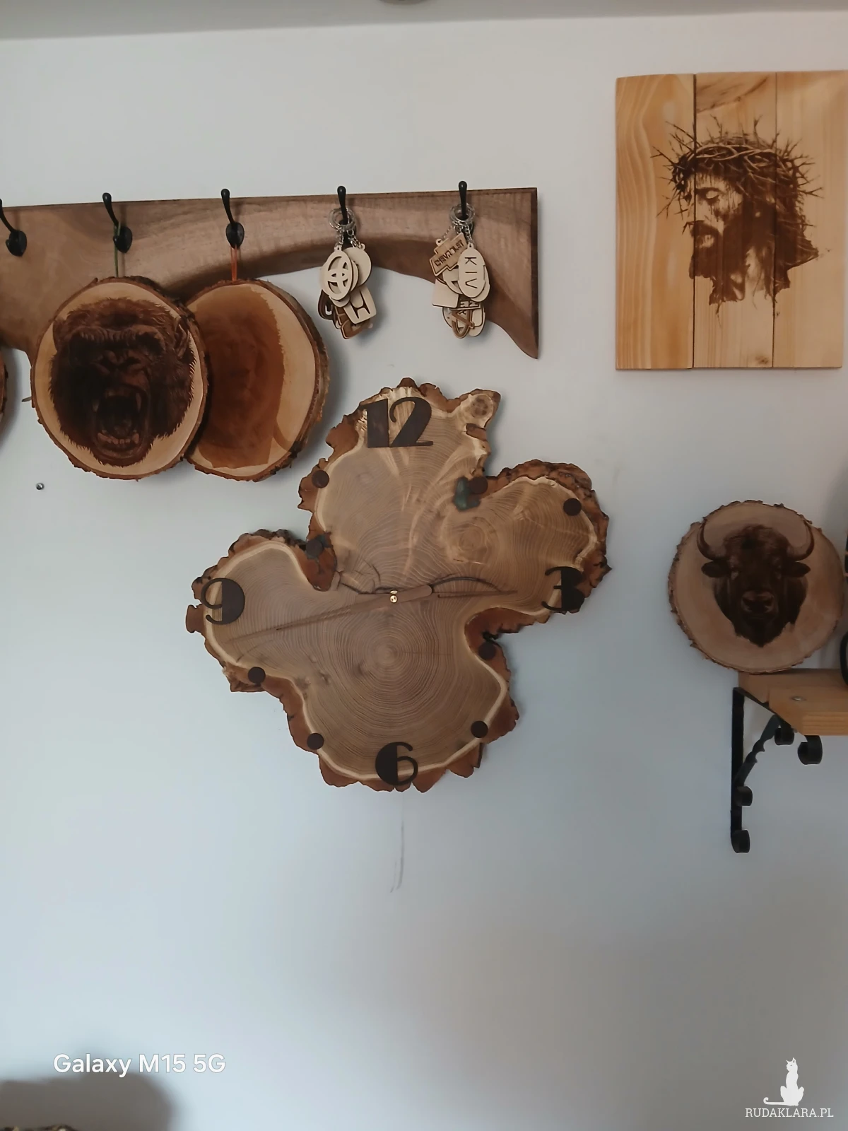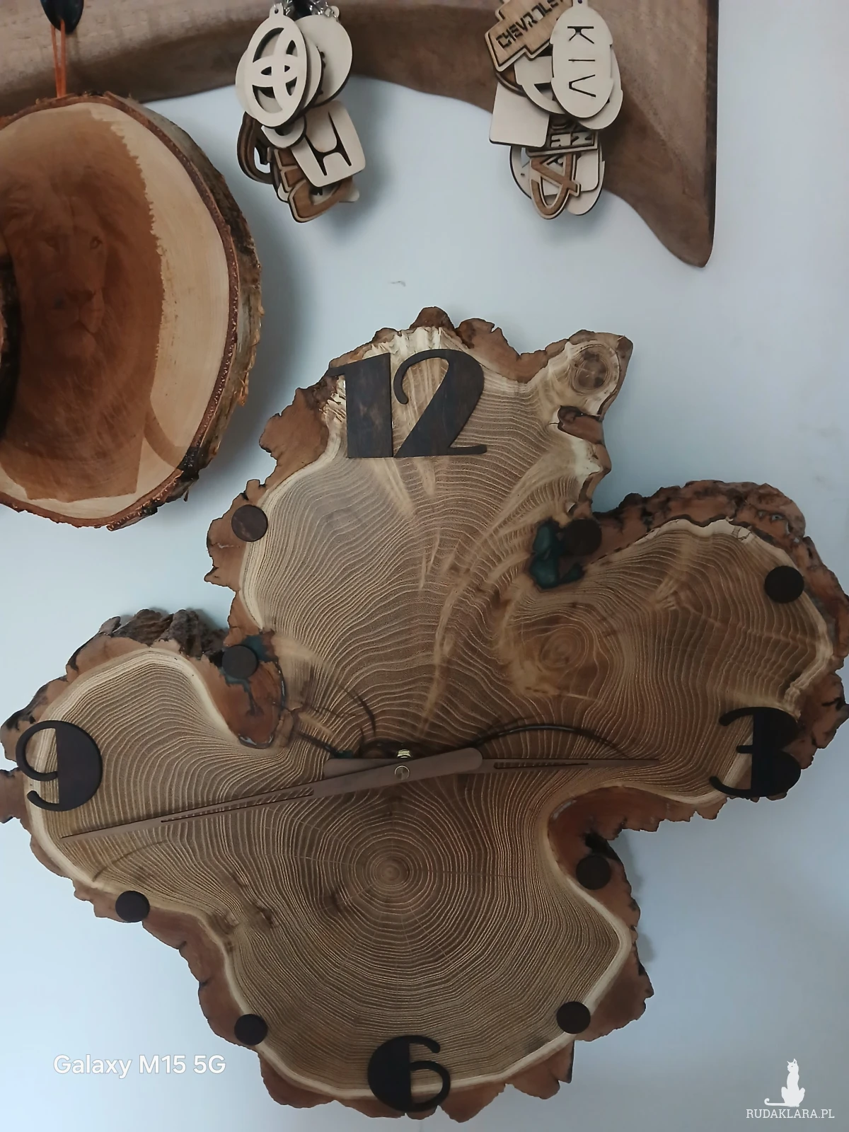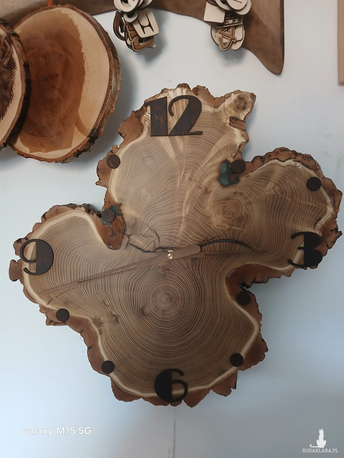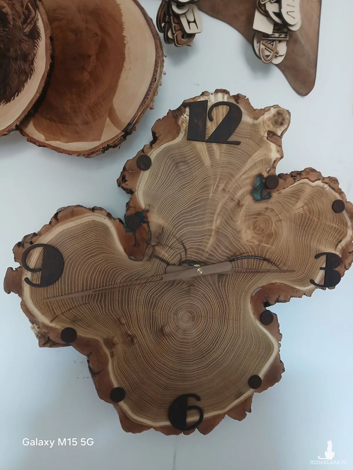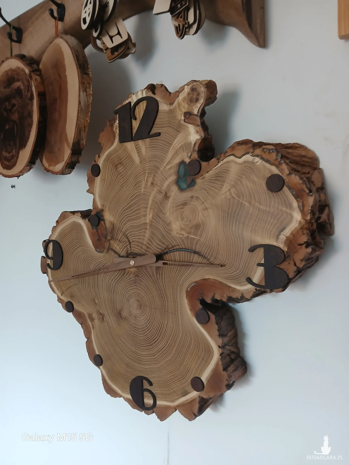 Zegar wykonany na plastrze akacji, z cichym mechanizmem, bez sekundowej wskazówki. Woskowany ,wymiary:49 cmx49cm.Kora zabezpieczona lakierem akrylowym .