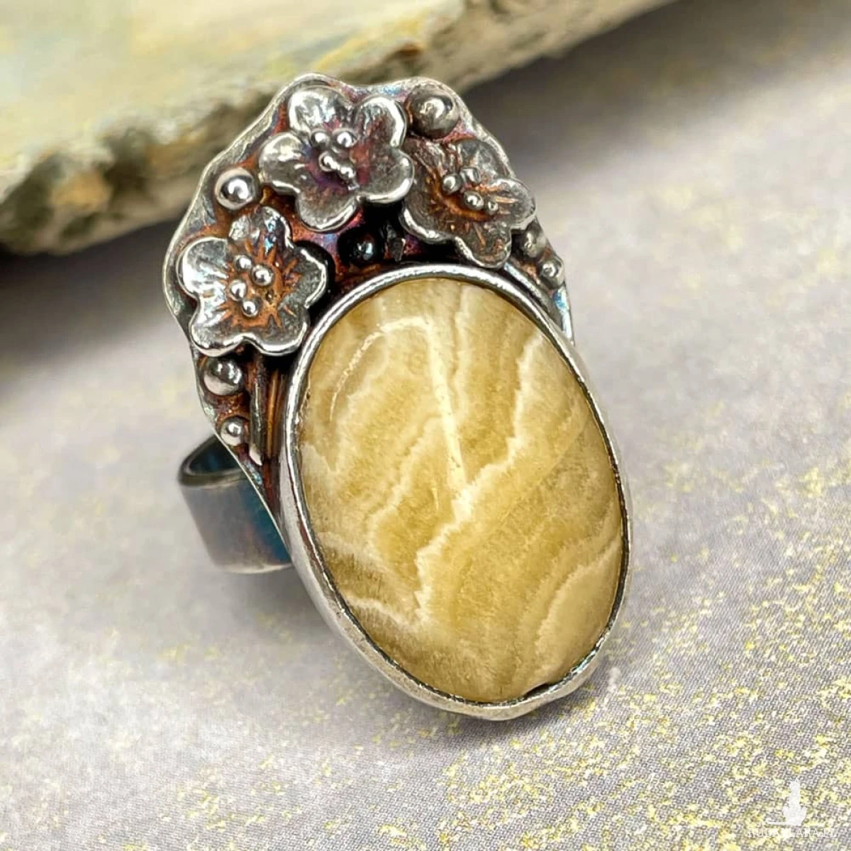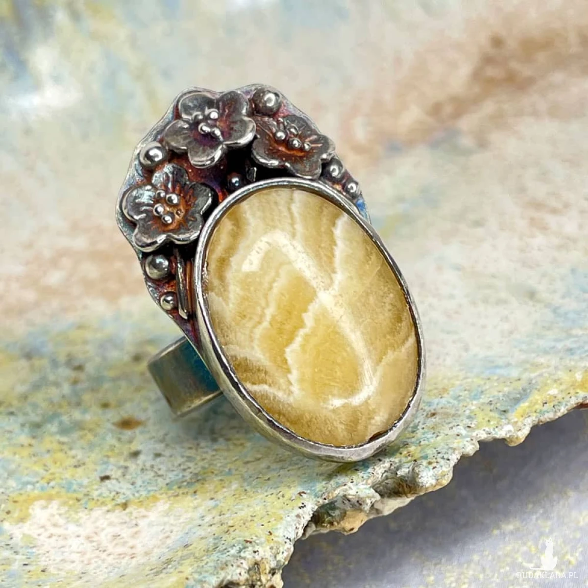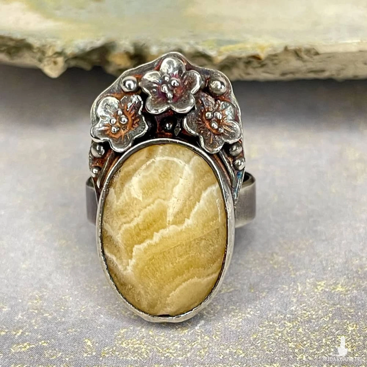 Kalcyt osadzony w zdobionej, srebrnej oprawie przyciąga uwagę subtelną grą barw i naturalnym rysunkiem, który przywodzi na myśl słoneczne pejzaże. Ręcznie wykonana oprawa ze srebra próby 925, ozdobiona delikatnym motywem florystycznym, nadaje pierścionkowi romantyczny, lekko secesyjny charakter. Oksydowane i przecierane srebro podkreśla detale oraz nadaje całości nieco artystycznej surowości. To idealna propozycja dla osób, które szukają biżuterii z duszą – eleganckiej, ale inspirowanej naturą. Pierścionek pięknie uzupełni zarówno codzienne, jak i bardziej wyrafinowane stylizacje, pozostając niepowtarzalnym akcentem każdej z nich.