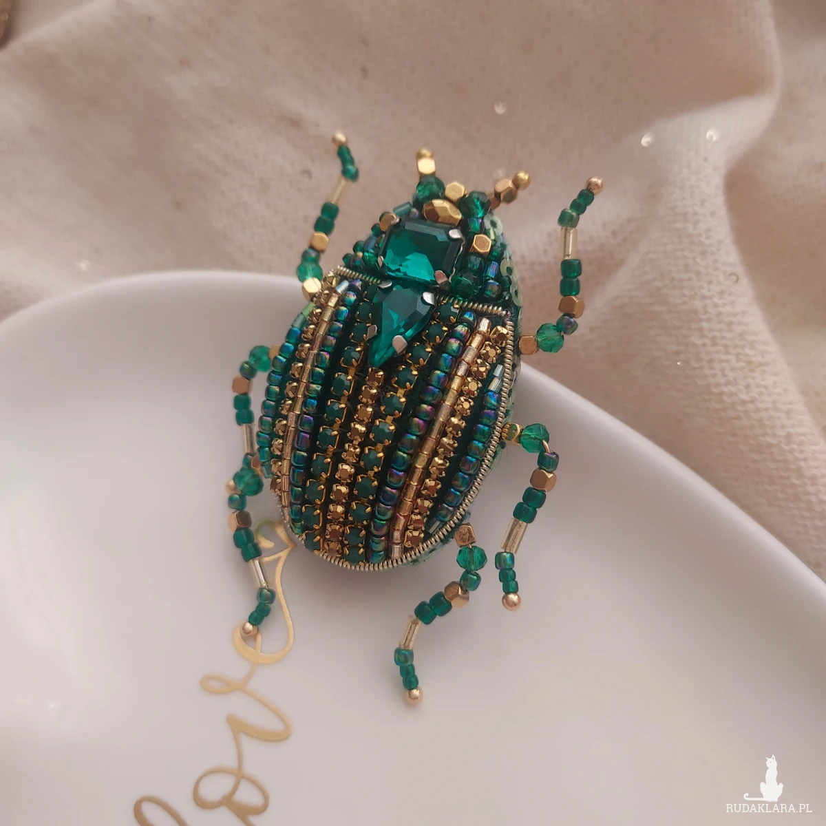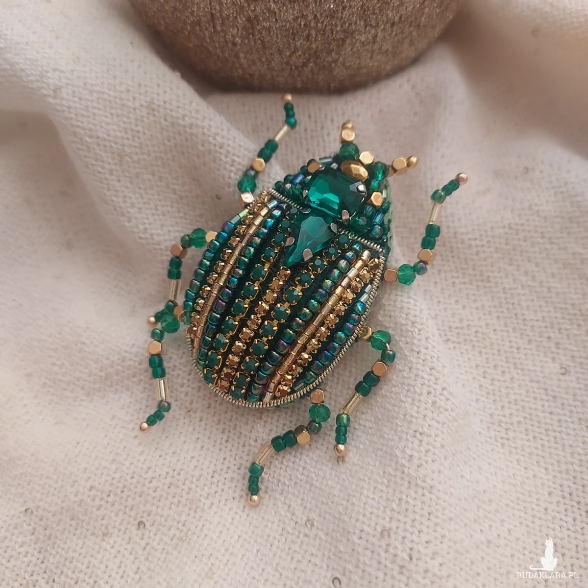 Wiosenno-letnia broszka żuczek w kolorze szmaragdowo-złotym powstała techniką haftu koralikowego.