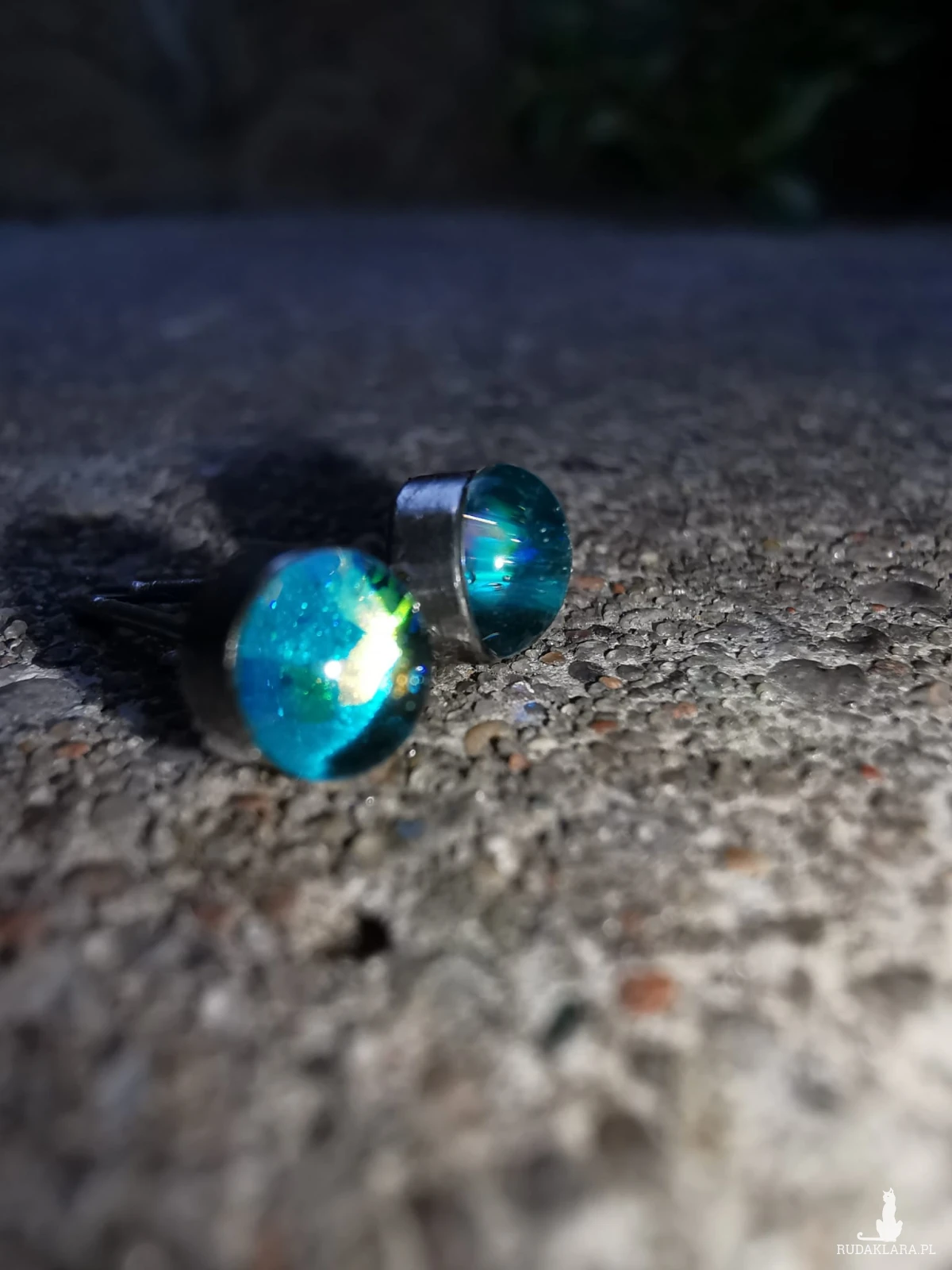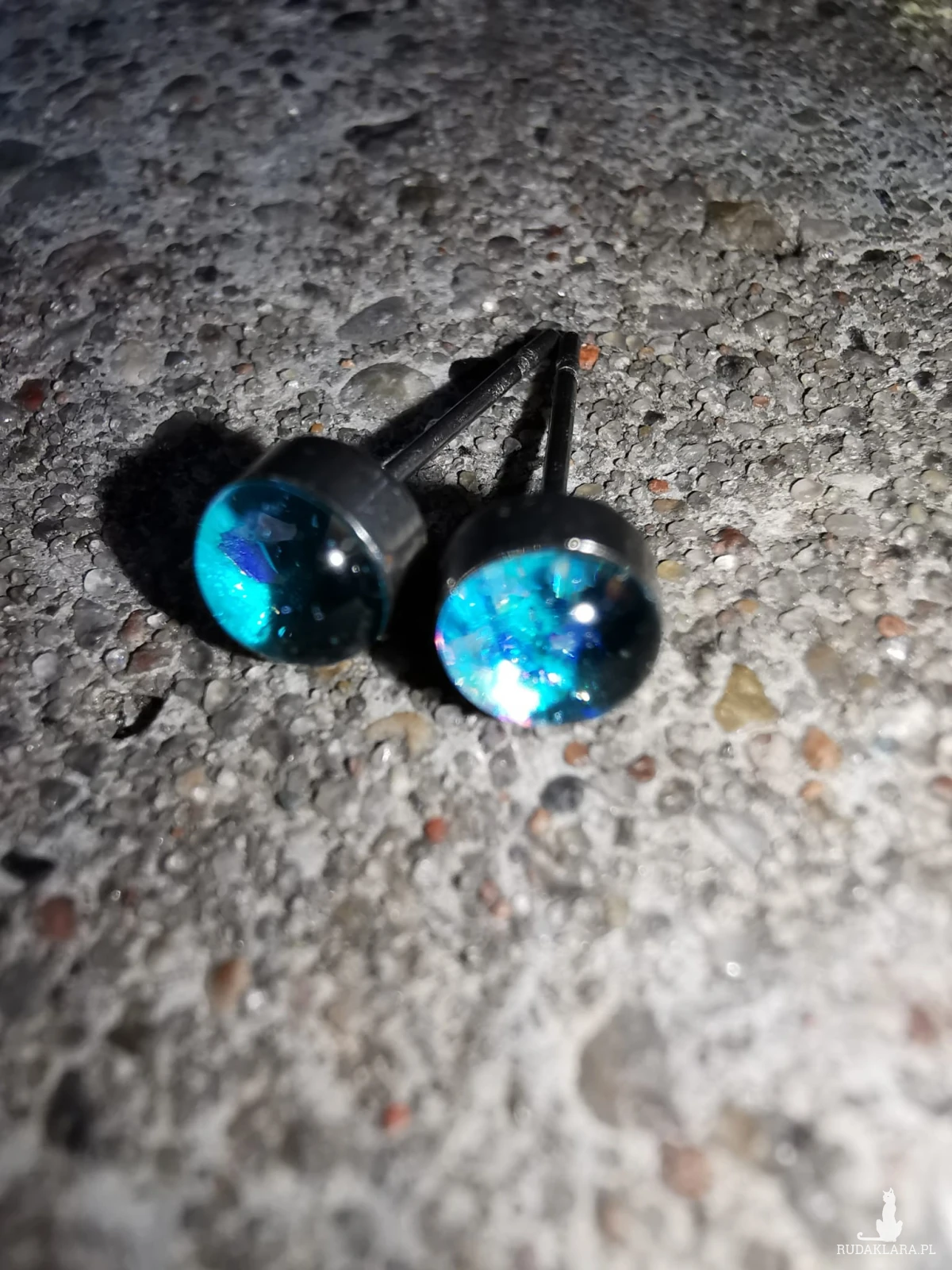 Drobne kolczyki stalowe 4mm, ręcznie wypełnione żywicą epoksydową i brokatami. Mocno się mienia różnymi kolorami. Są gustownym dodatkiem do różnych stylizacji.