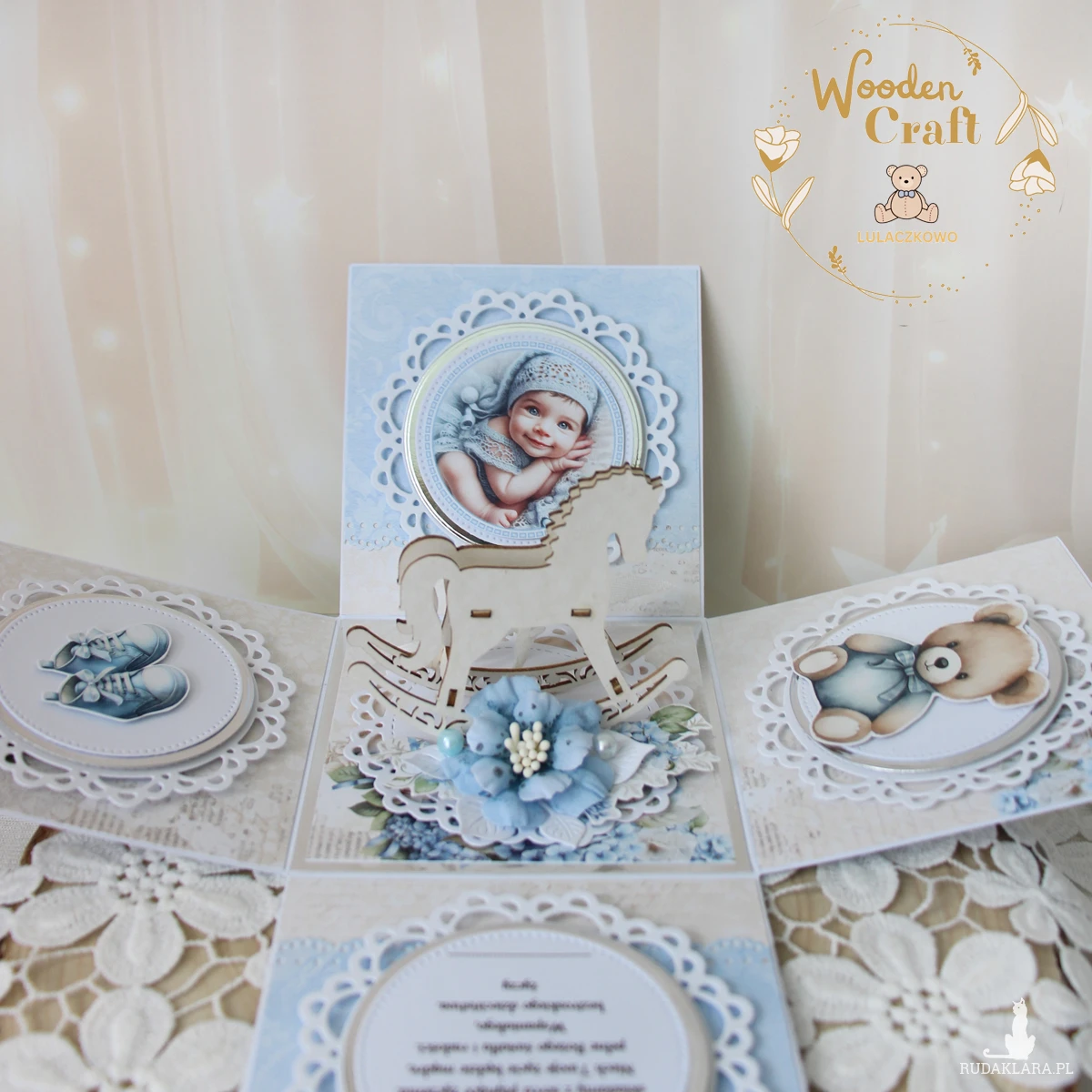 W środku boxa znajduje prześliczna tekturka 3D - konik na biegunach, ozdobiony ręcznie robionymi, materiałowymi kwiatami. Na ściankach boxa umieszczone zostały prześliczne grafiki przedstawiające małego, uroczego chłopczyka, pluszowego misia oraz chłopięce buciki, a także życzenia. Za tekturką 3D znajduje się wstążeczka, którą można przewiązać zwinięte w rulonik banknoty.
