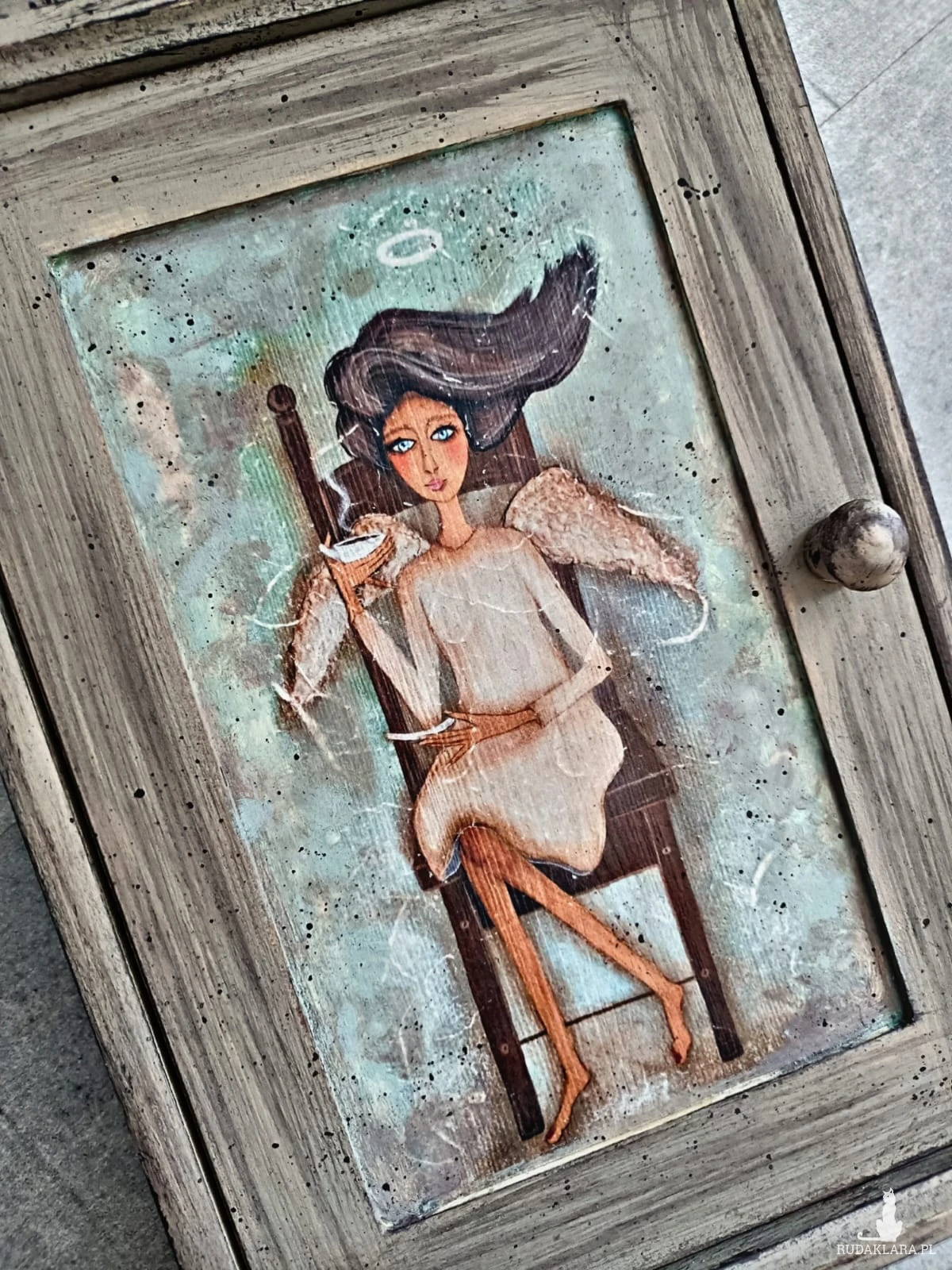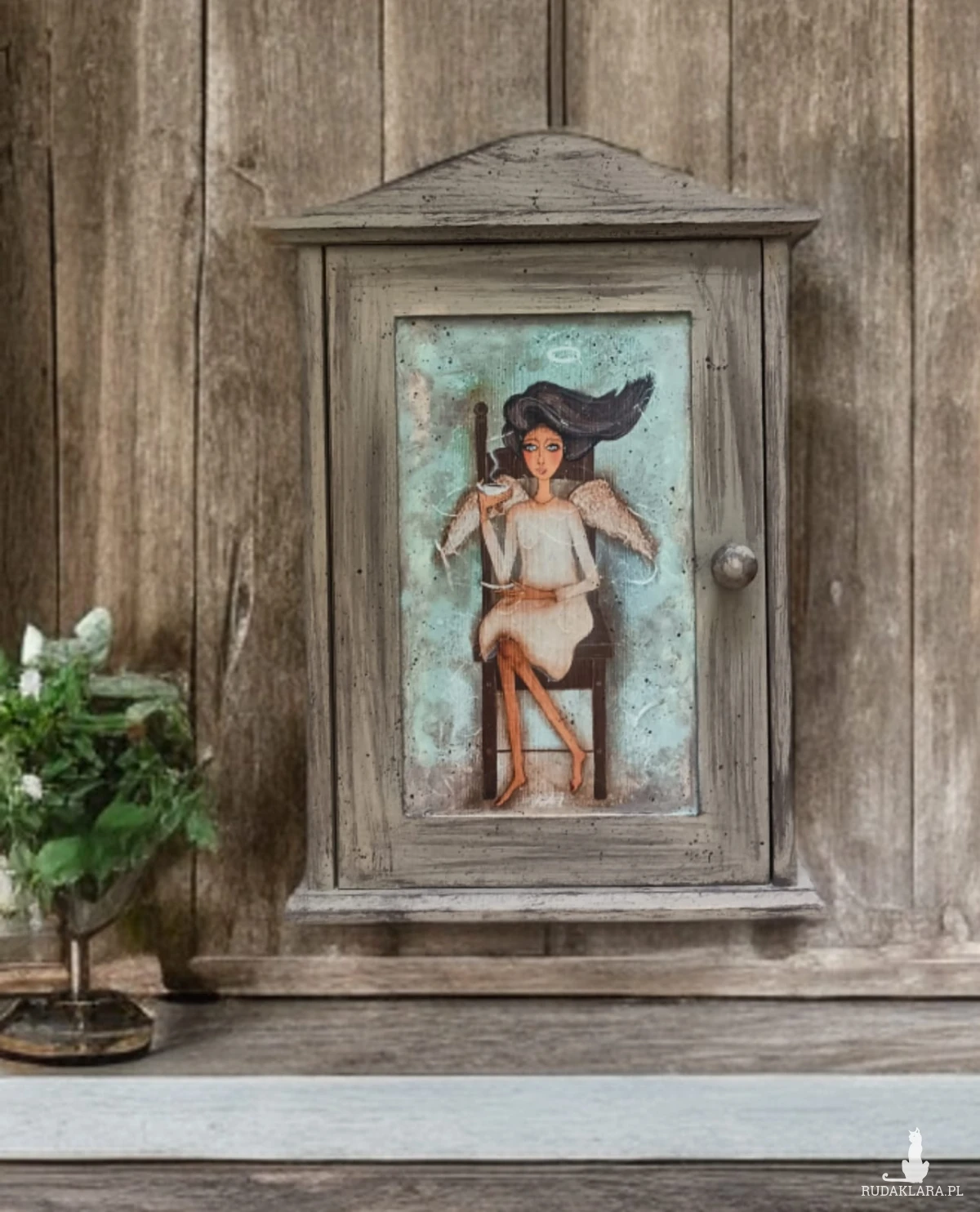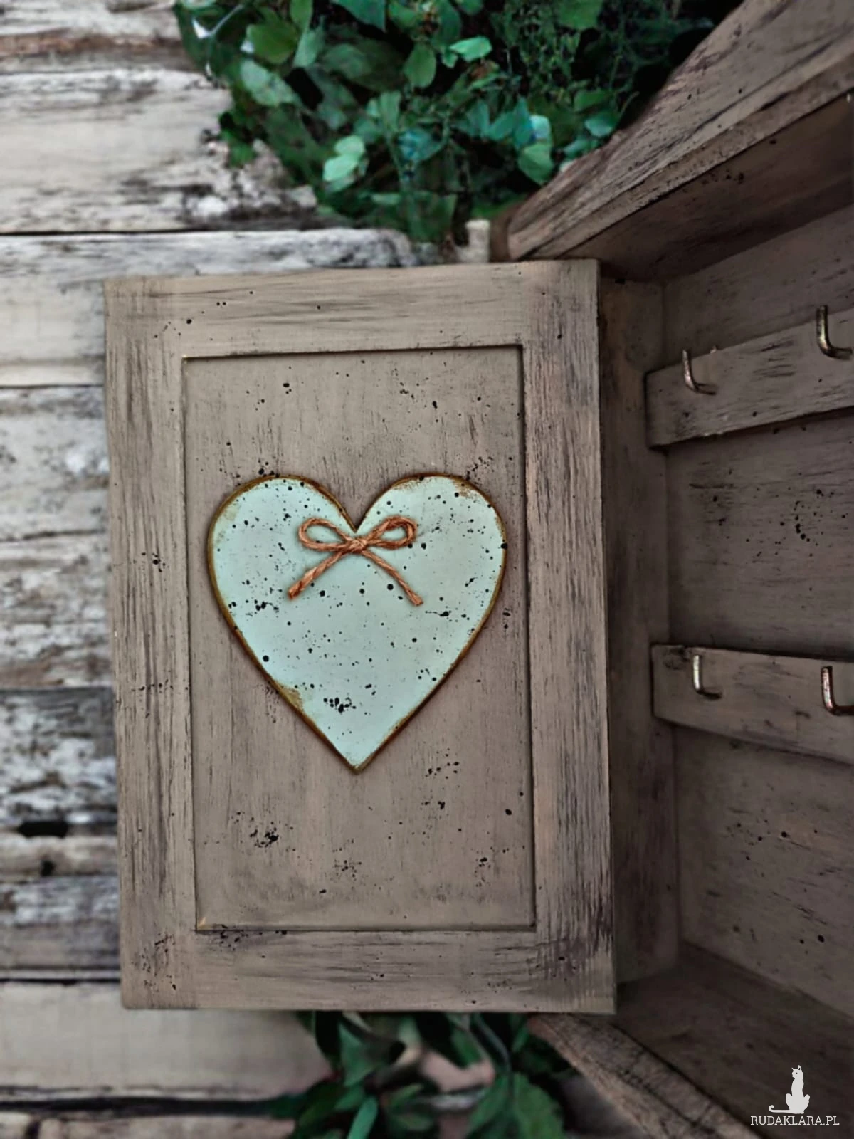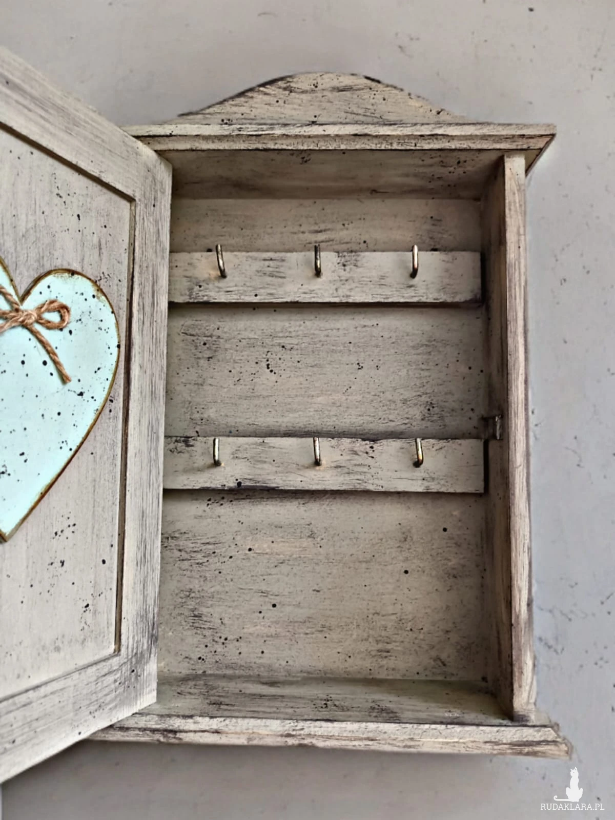 Drewniana skrzyneczka na klucze. Zdobiona za pomocą techniki decoupage. Wewnątrz sześć haczyków na klucze.