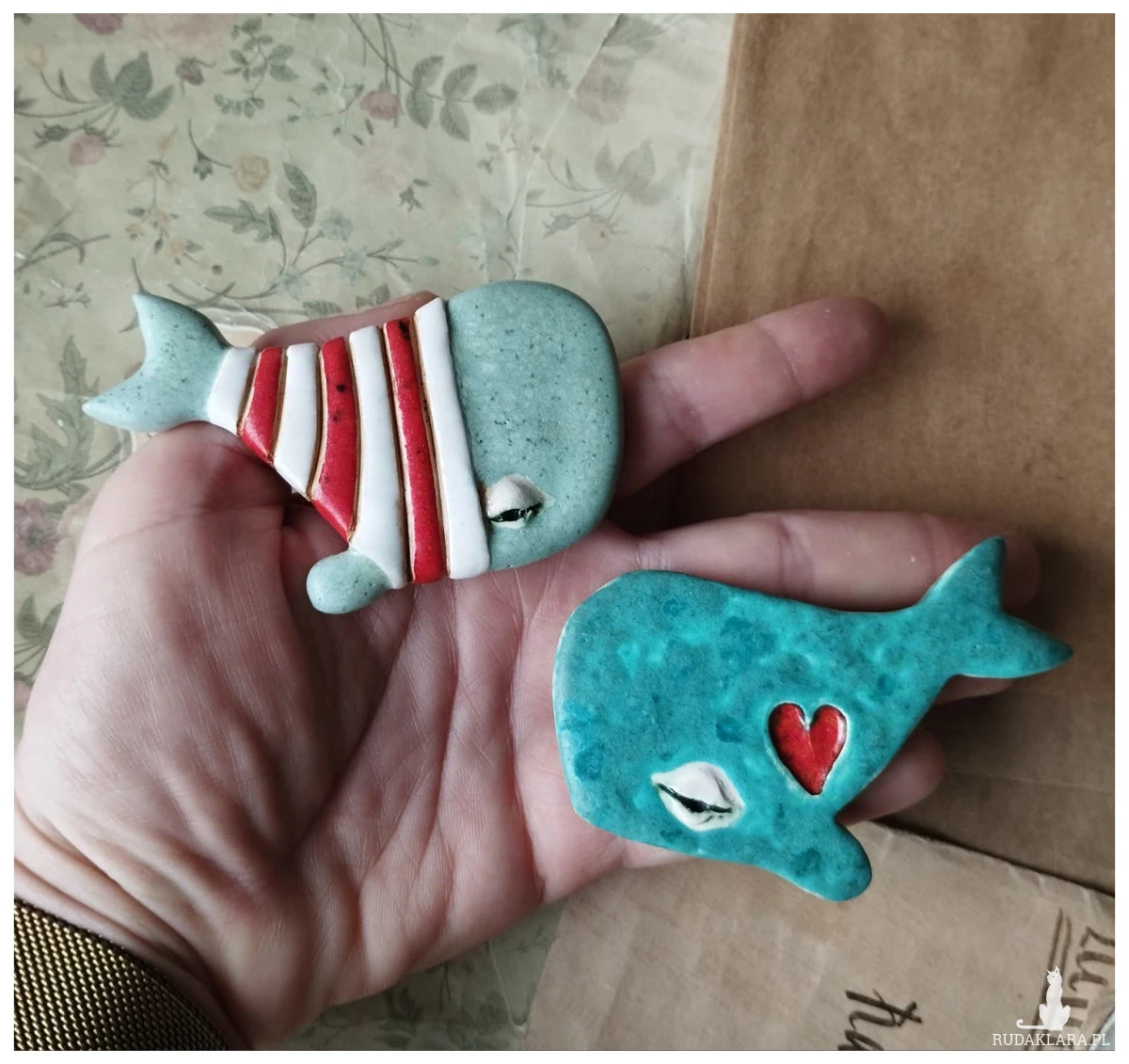 Broszki wielorybki wykonane z gliny szamotowej, wypalone na biskwit, a następnie szkliwione w temperaturze ok 1260 stopni C. O wymiarach ok; 4,5 cm x 8,5 cm. Serdecznie polecam wszystkim Paniom poszukującym nietuzinkowej biżuterii.