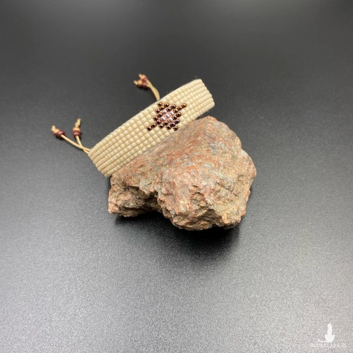 Bransoletka posiada makramową regulację i pasuje na nadgarstek od 15 cm (przy maksymalnym zaciśnięciu) do 18 cm. Szerokość bransoletki ok 1,3 cm.