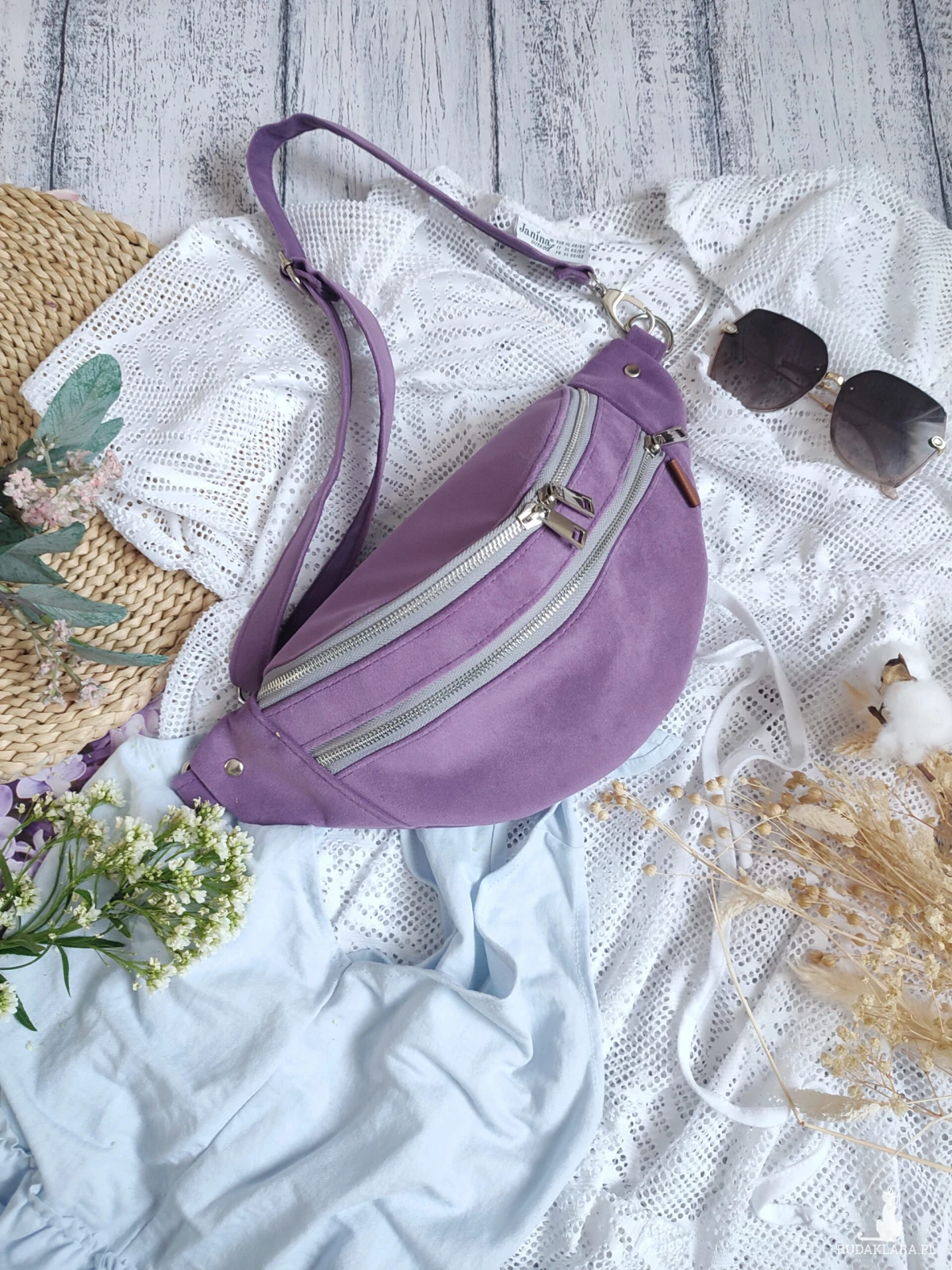 Uszyta z weluru w kolorze lawendowym. Podszewka z tkaniny wodoodpornej z wzorem. Okucia metalowe w kolorze srebrnym.