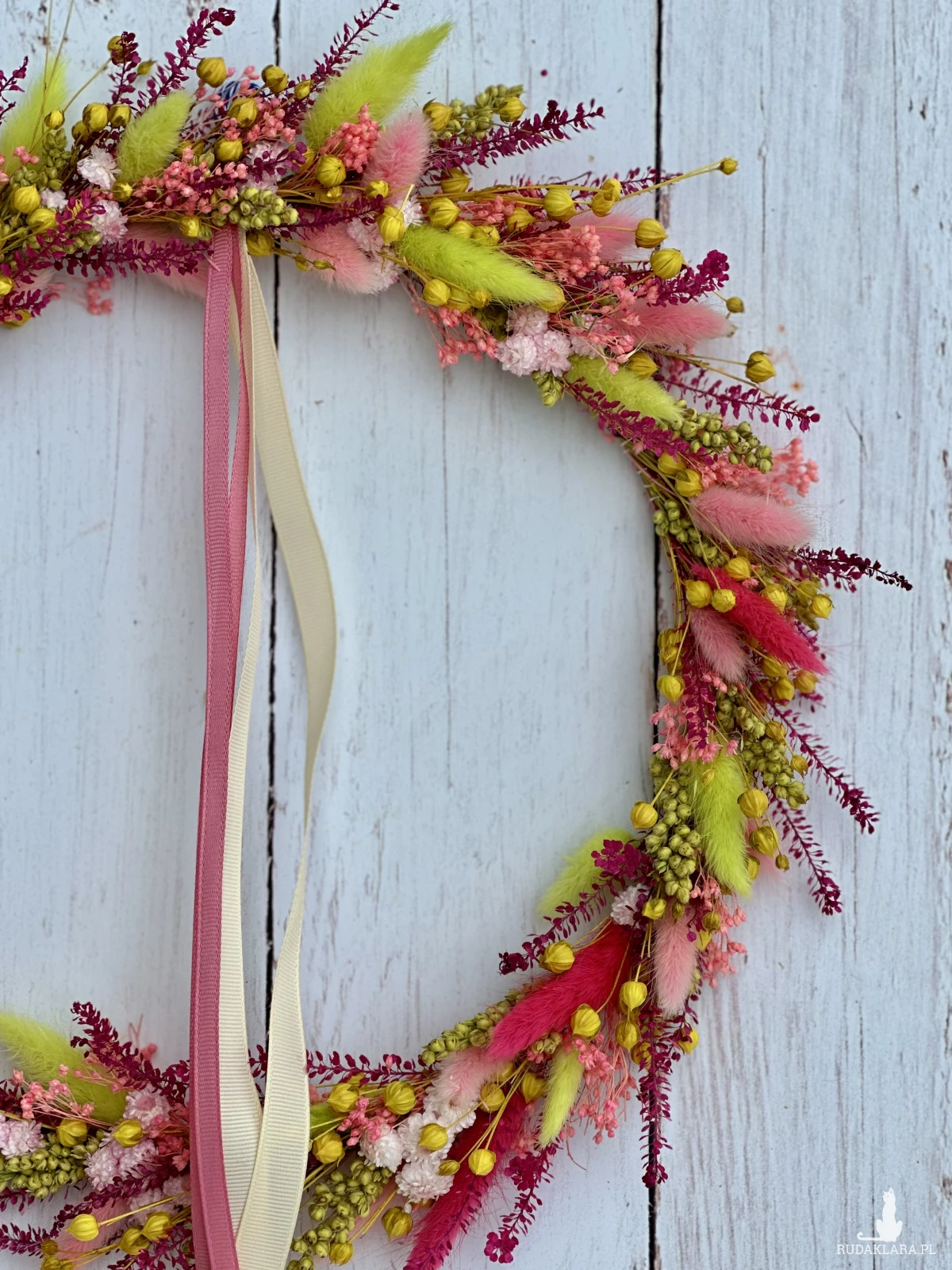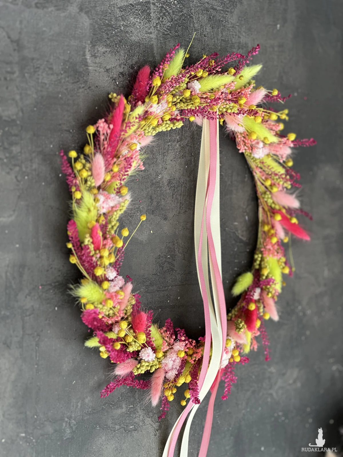 Kolorowy wianek wypleciony z naturalnych, suszonych kwiatów i traw, udekorowany wstążkami.