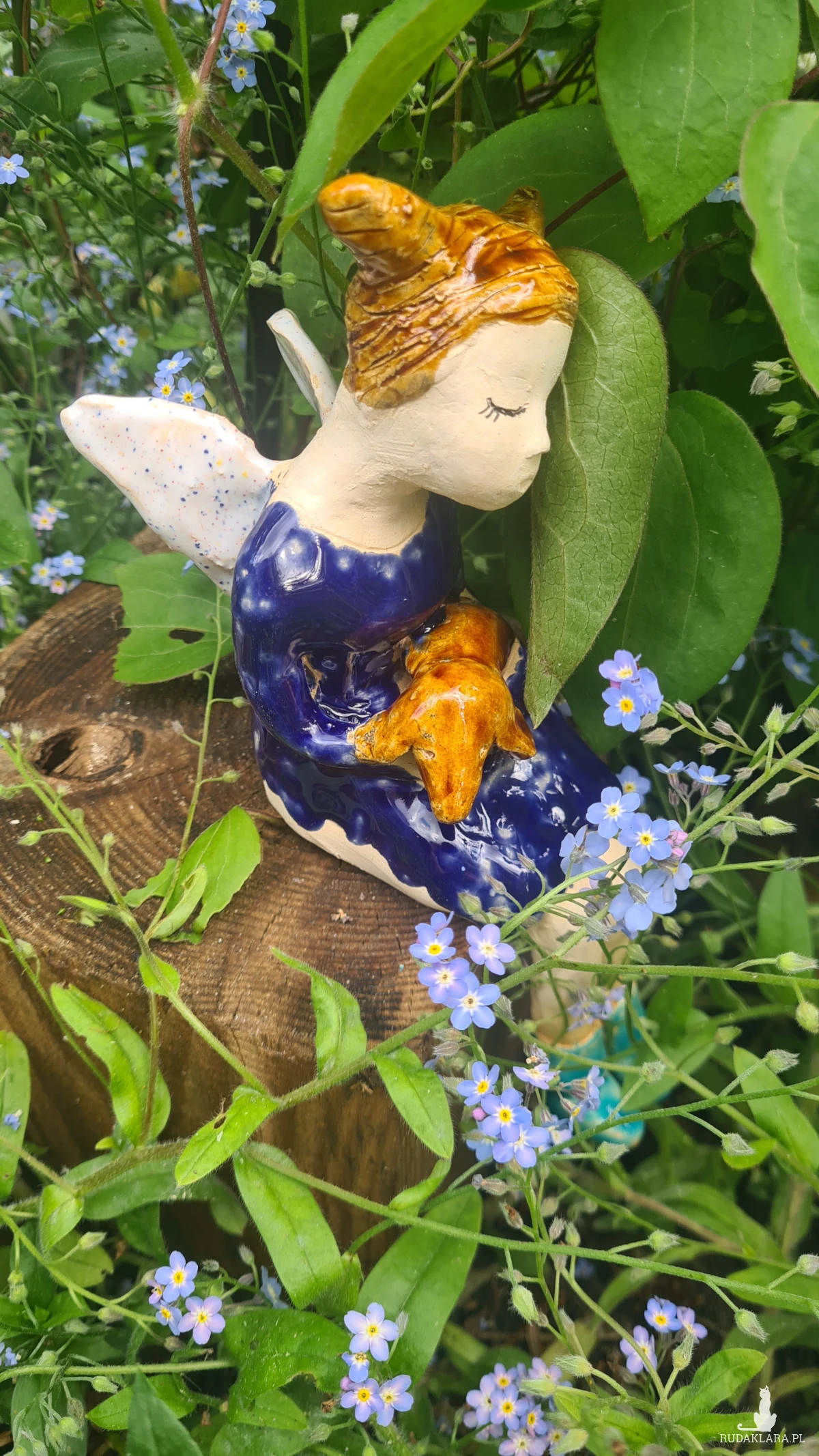 Piękny ceramiczny anioł z pieskiem wykonany z jasnej gliny, pokryty błyszczącymi szkliwami, dwukrotnie wypalany w piecu. Wymiary 20 cm.