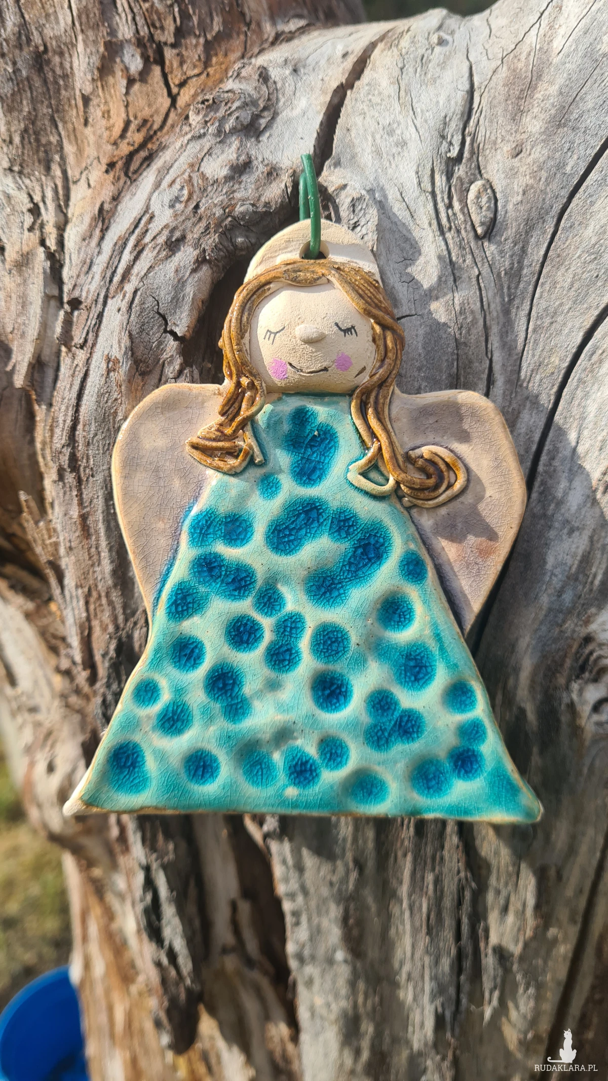 Anioł ceramiczny wykonany z jasnej gliny, pokryty błyszczącymi szkliwami ceramicznymi, dwukrotnie wypalany w wysokiej temperaturze. Wysokość 11 cm, do zawieszenia na ścianie lub w ogrodzie.