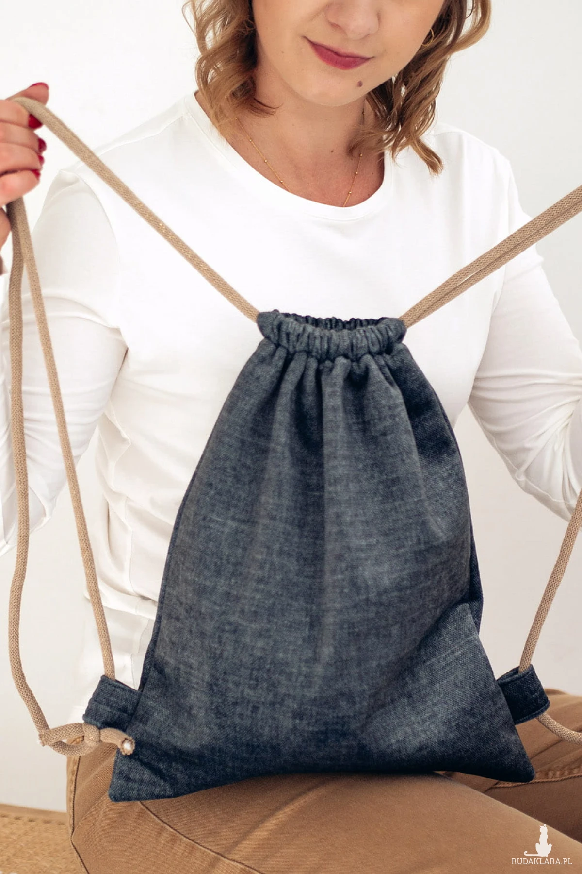 Plecak worek wykonany z filcu w kolorze brudnoniebieskim.