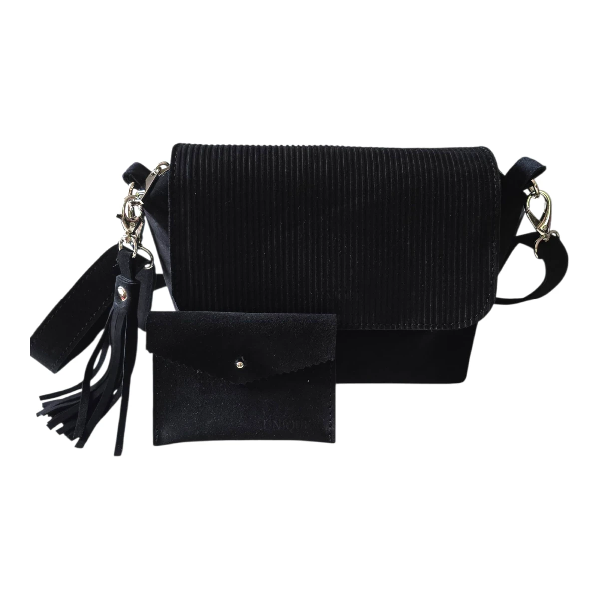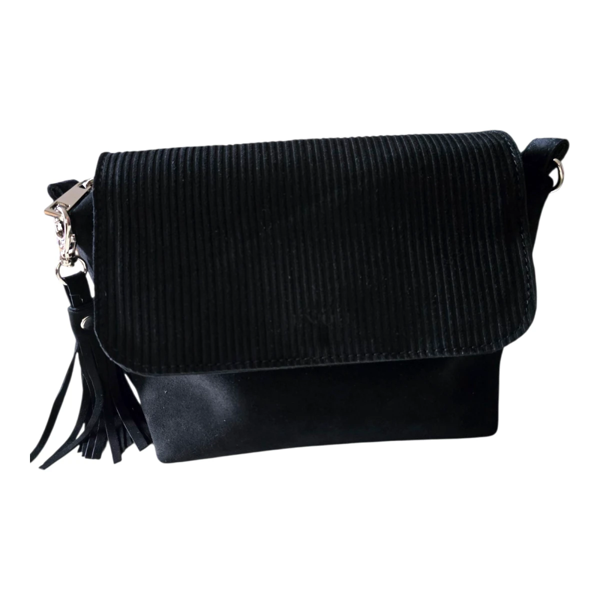 Uszyta z naturalnej skóry zamszowej, klapka tłoczona w prążki tzw. 'sztruks'.
