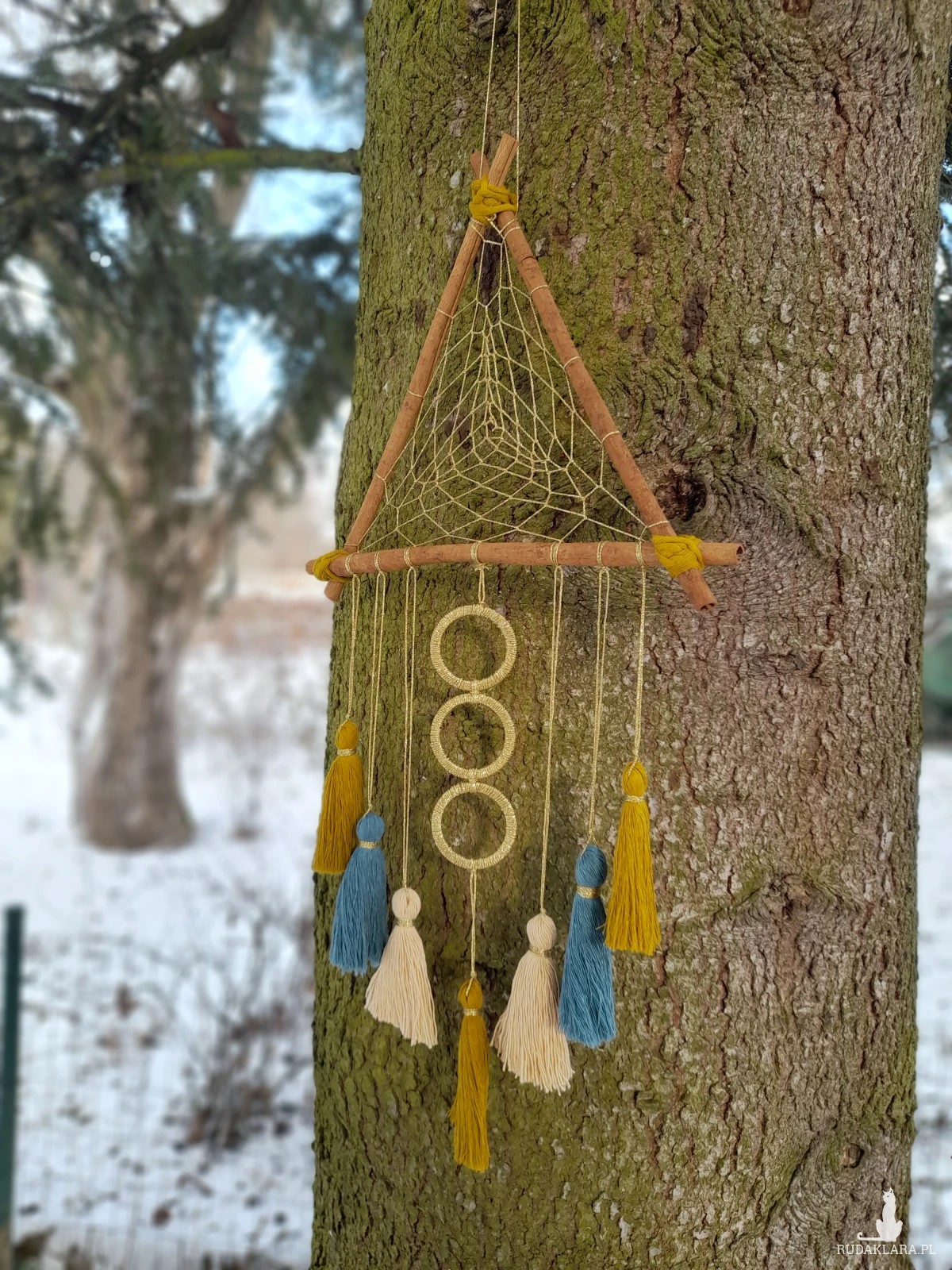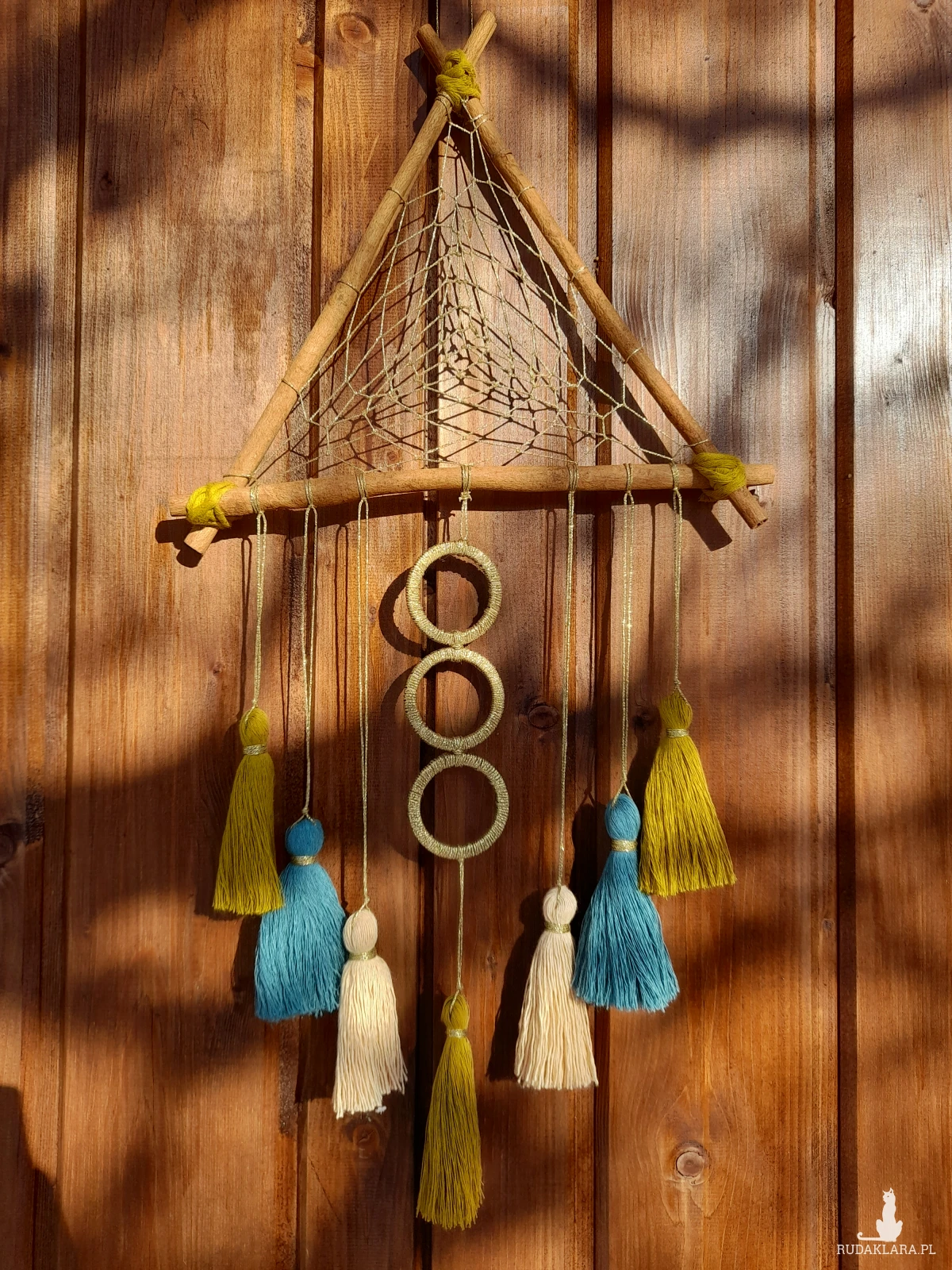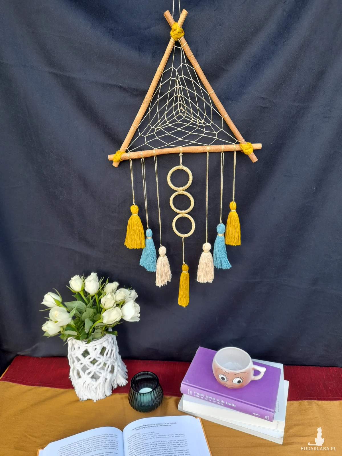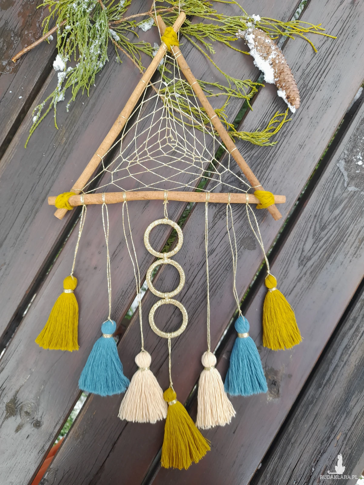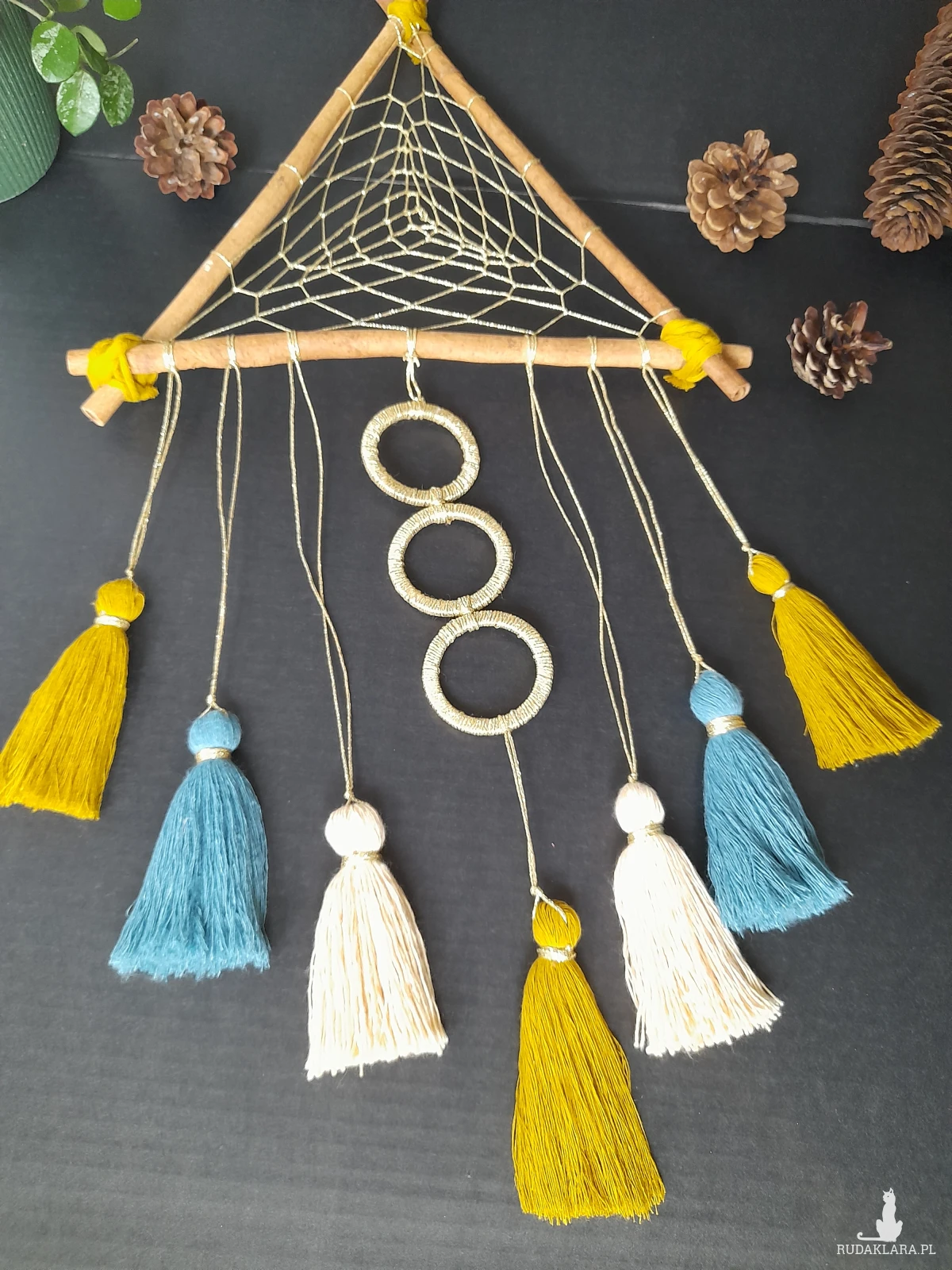 Trójkątny kształt i detale ze złotej nici oraz ręcznie tkane kółeczka nadają całości elegancji i lekkości, dzięki czemu makrama pasuje zarówno do przytulnych, rustykalnych wnętrz, jak i nowoczesnych, boho aranżacji.