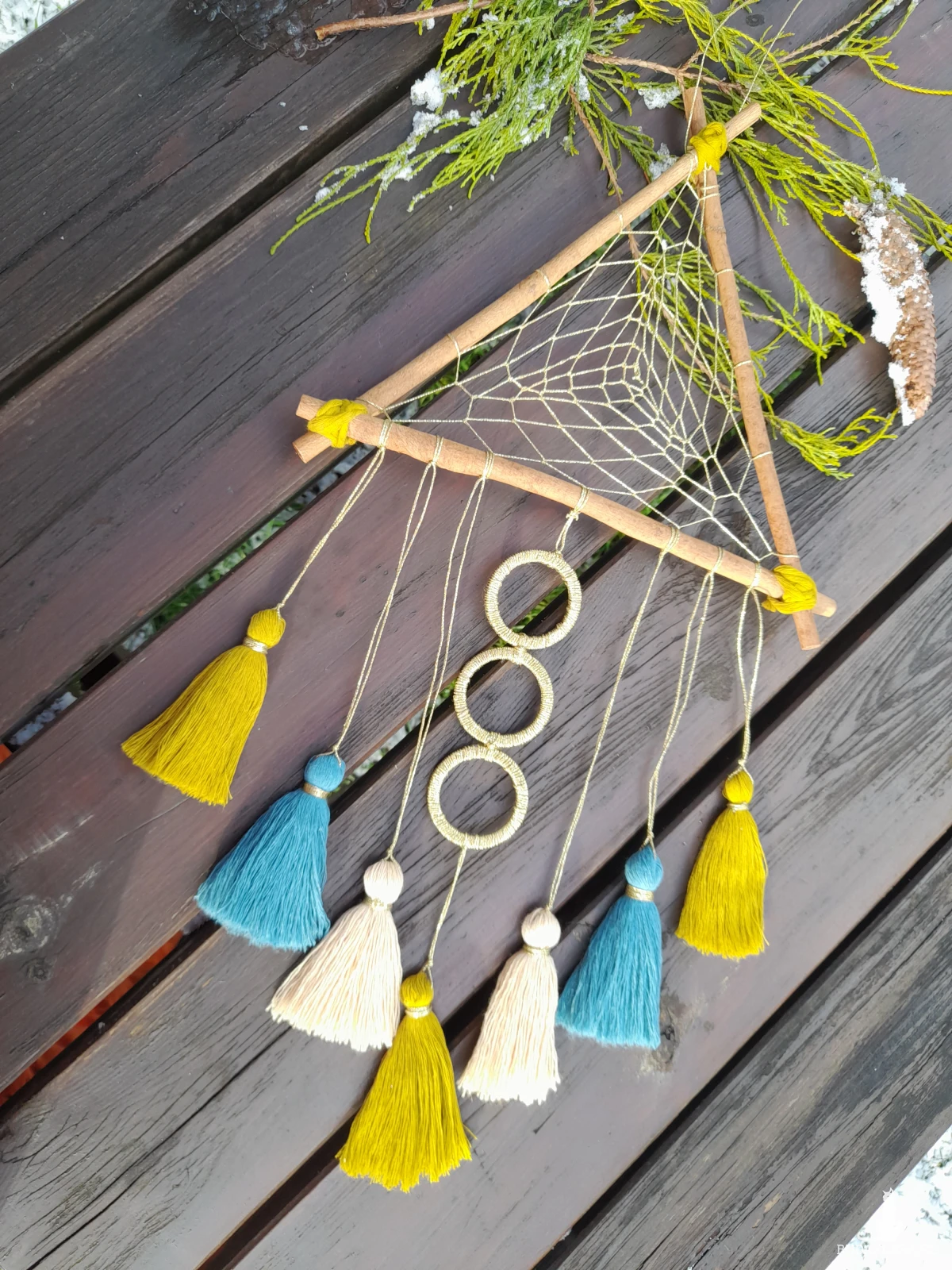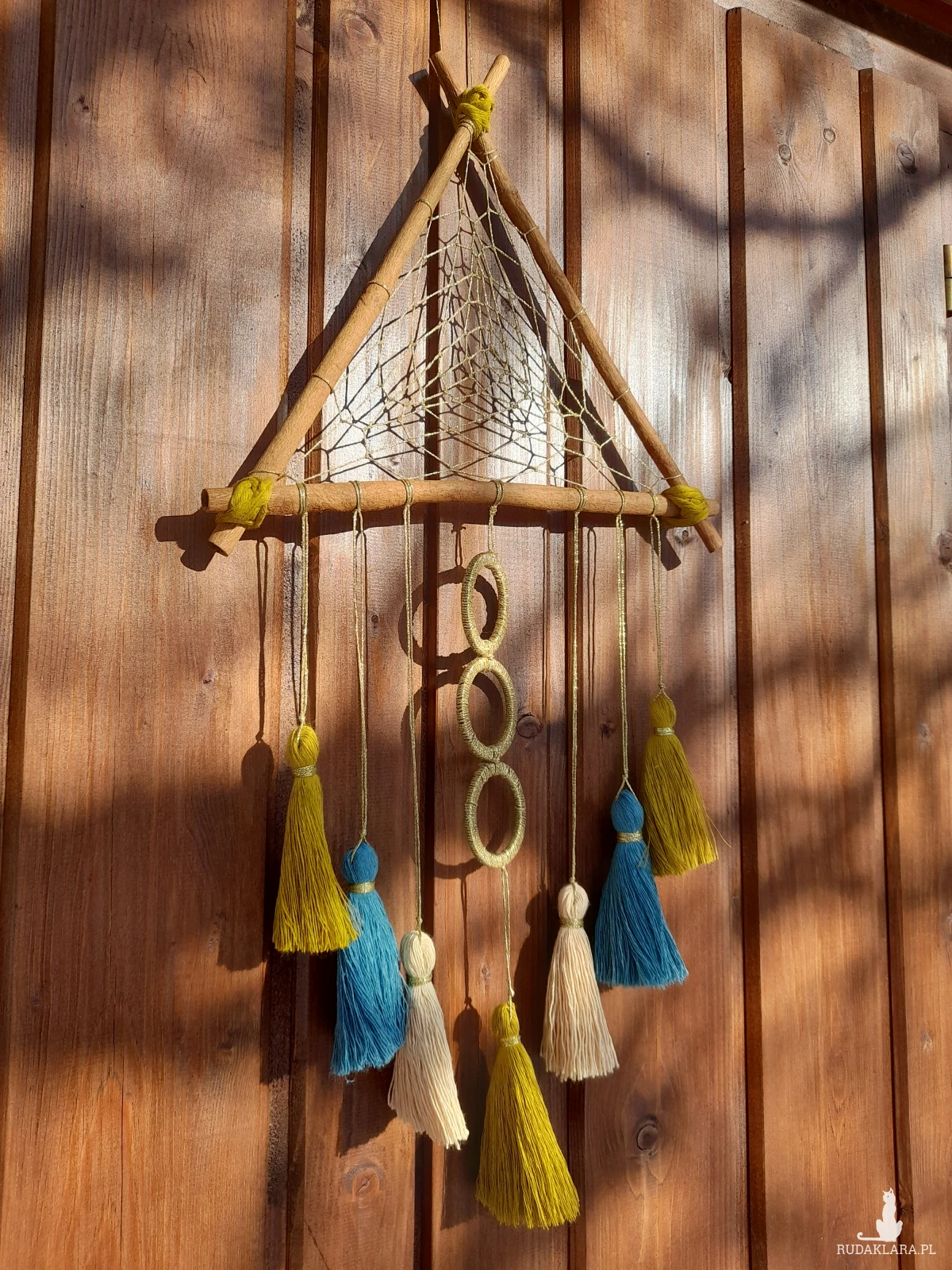 Wyjątkowy, kolorowy łapacz snów w stylu boho, który zachwyca nie tylko wyglądem, ale i zapachem 🌿✨. Ręcznie wykonany z naturalnych lasek cynamonu, delikatnej, plecionej sieci oraz kolorowych frędzli w odcieniach musztardowym, błękitnym i kremowym.
