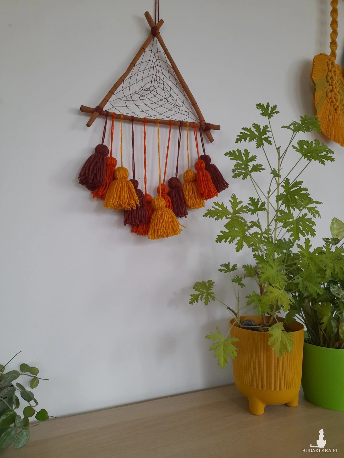 Trójkątny kształt oraz ręcznie pleciona sieć w połączeniu z rustykalnym charakterem nadają tej dekoracji unikalny klimat. Idealna do wnętrz inspirowanych naturą, stylu boho, rustykalnego czy cottagecore 🌾.