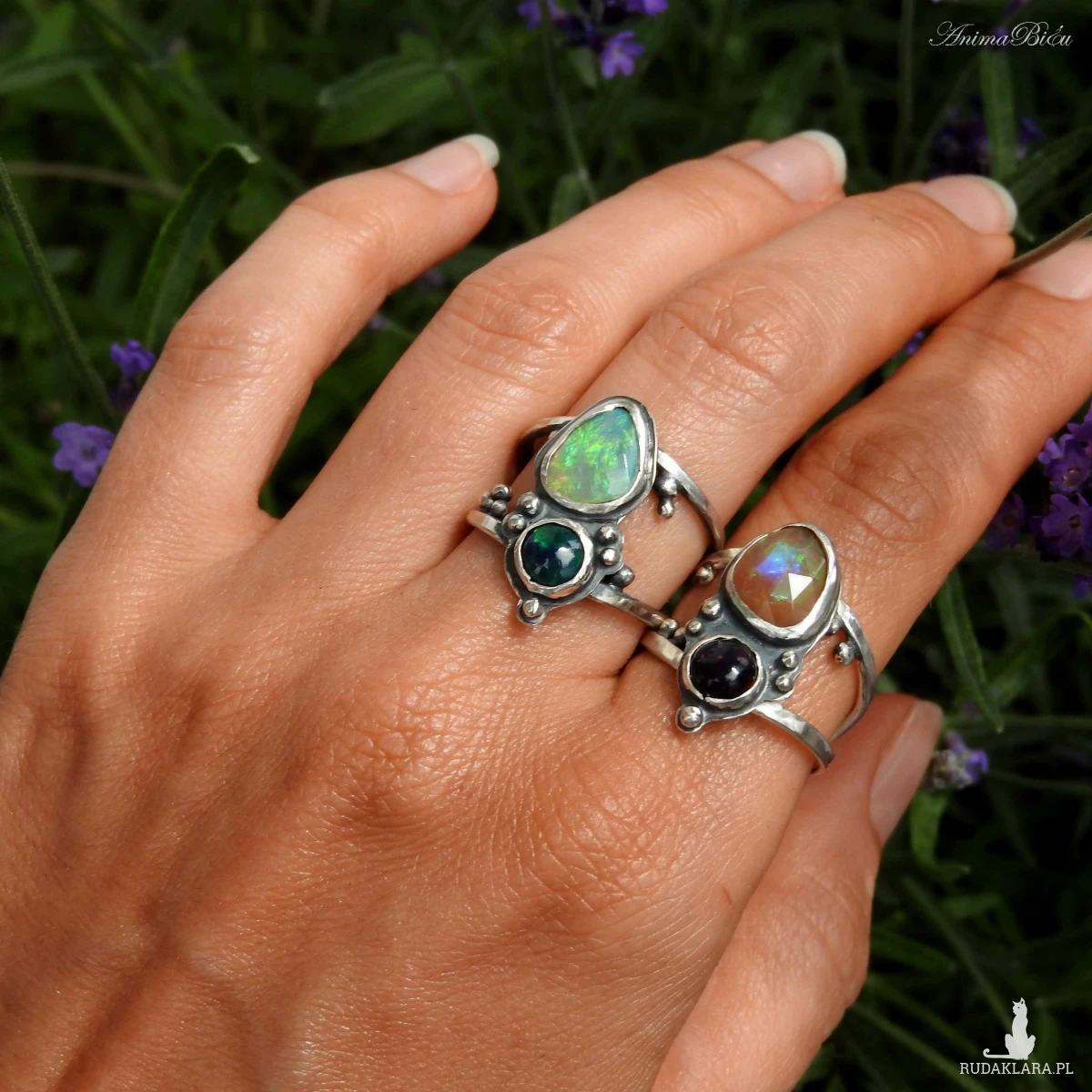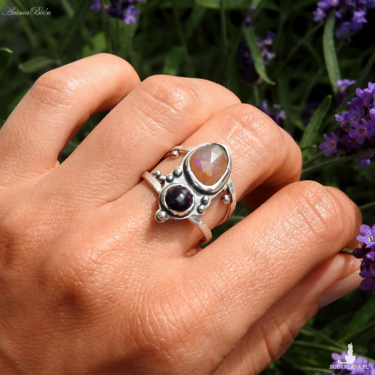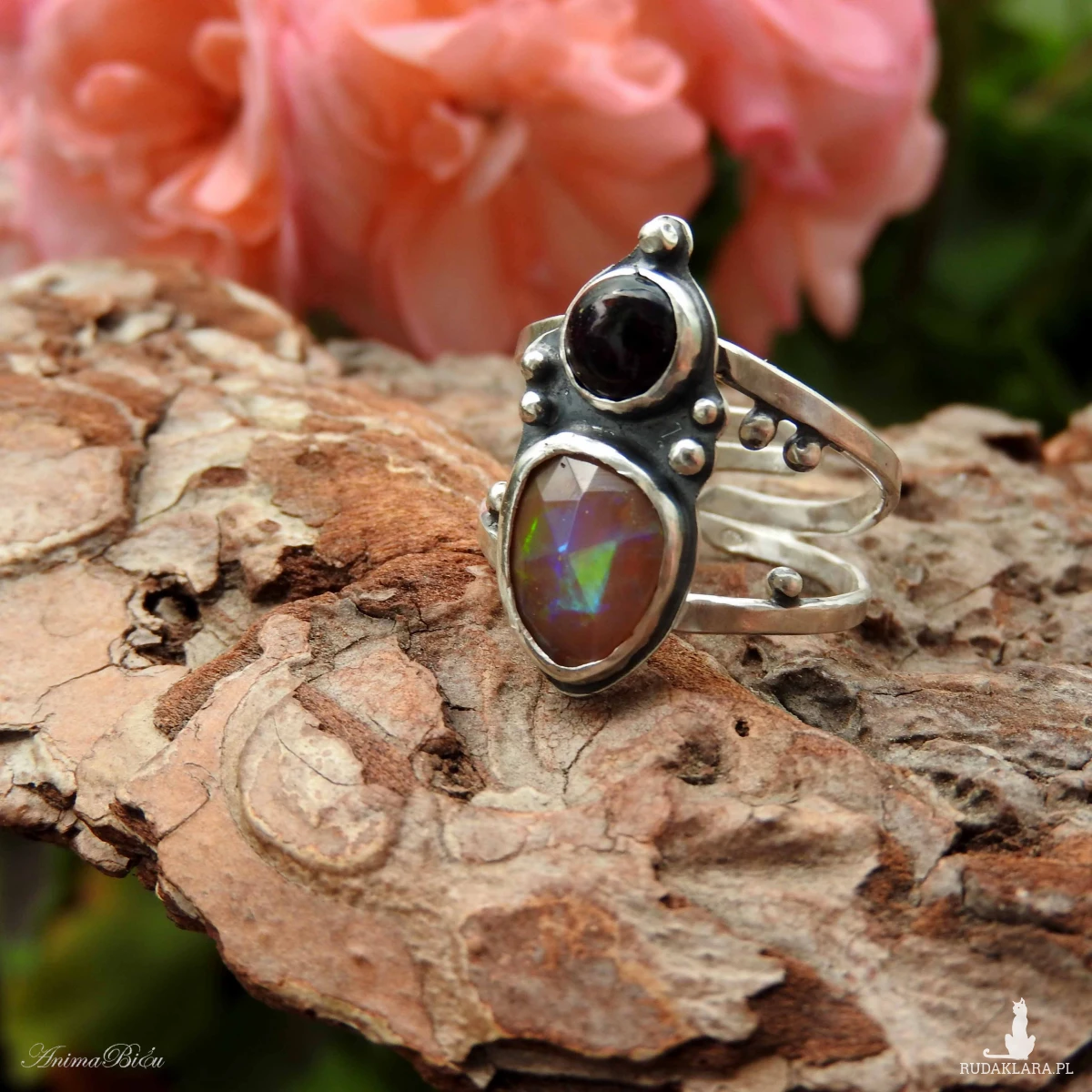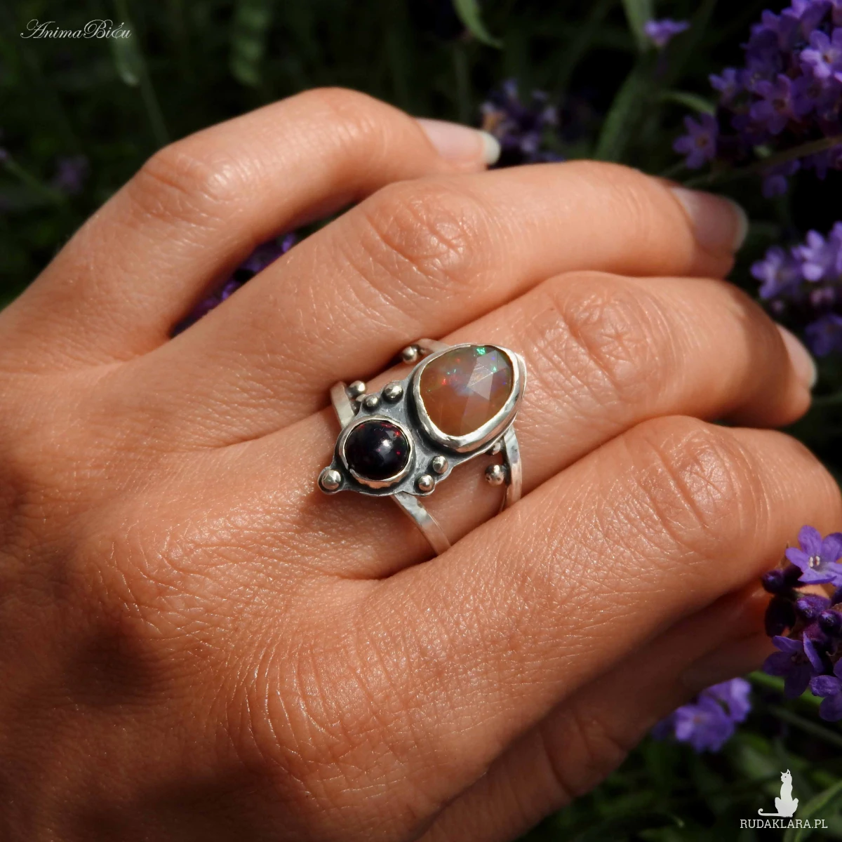Pierścionek srebrny z opalem etiopskim i opalem czarnym.