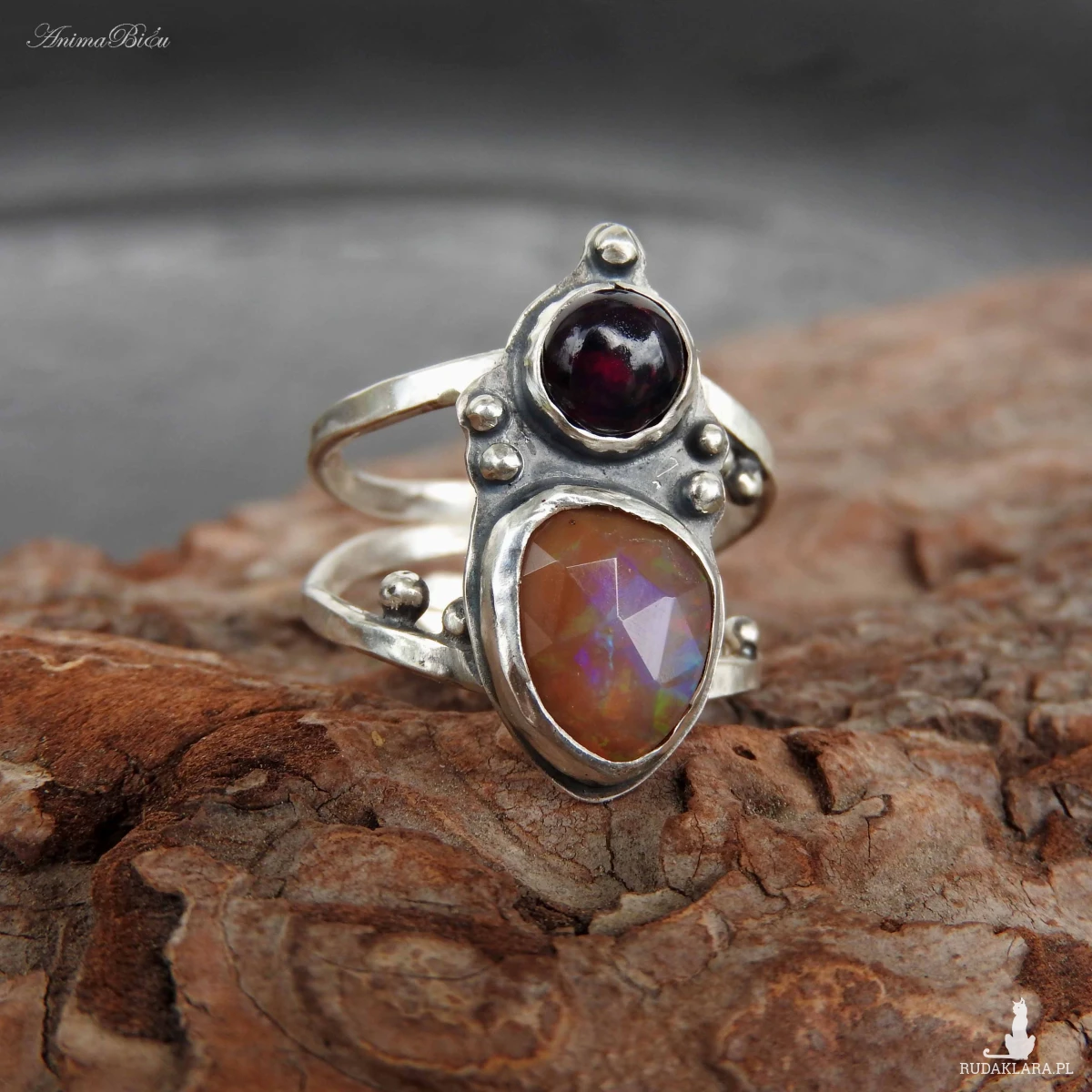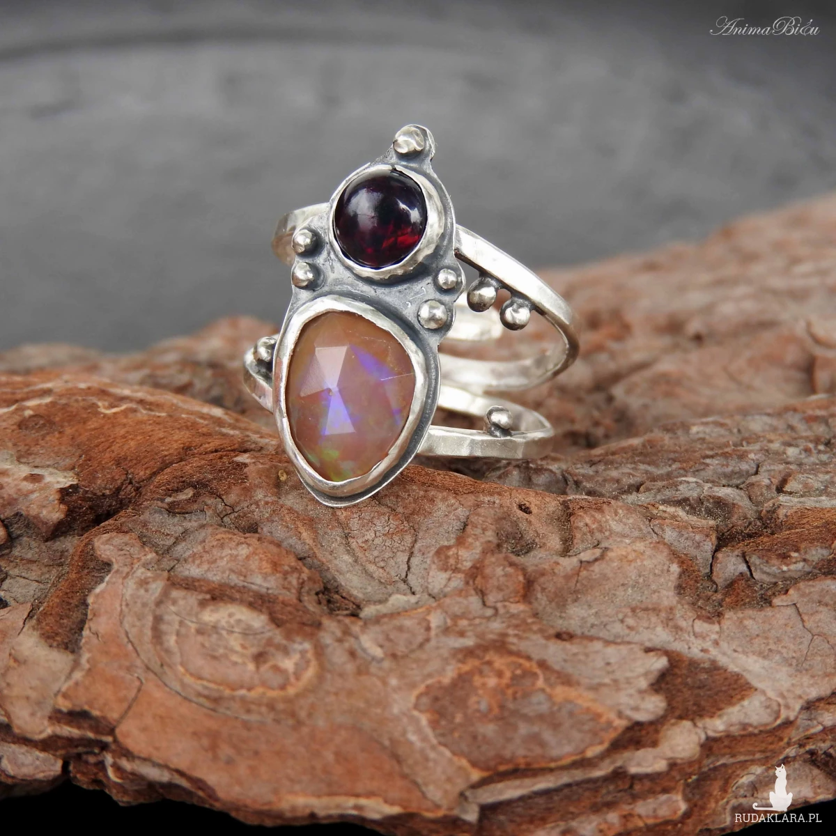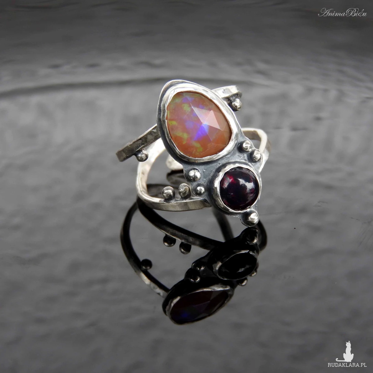 Pierścionek srebrny z opalem etiopskim i opalem czarnym.