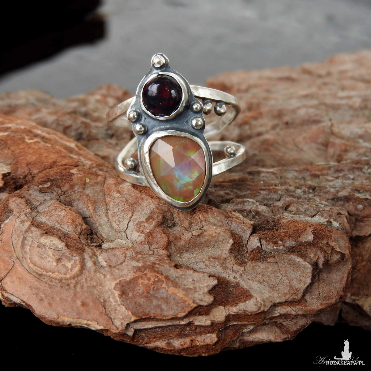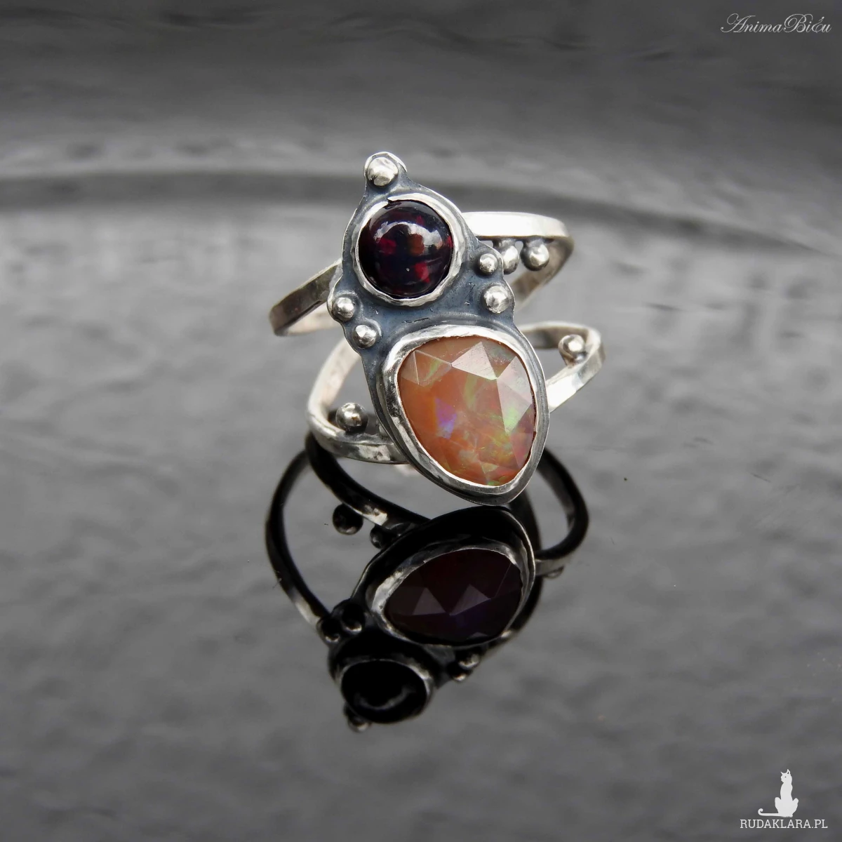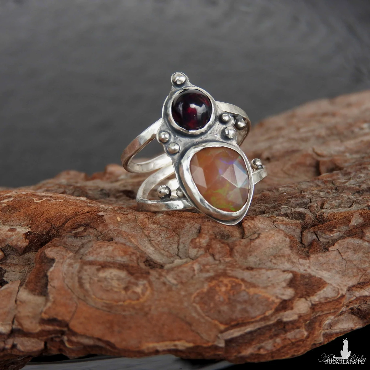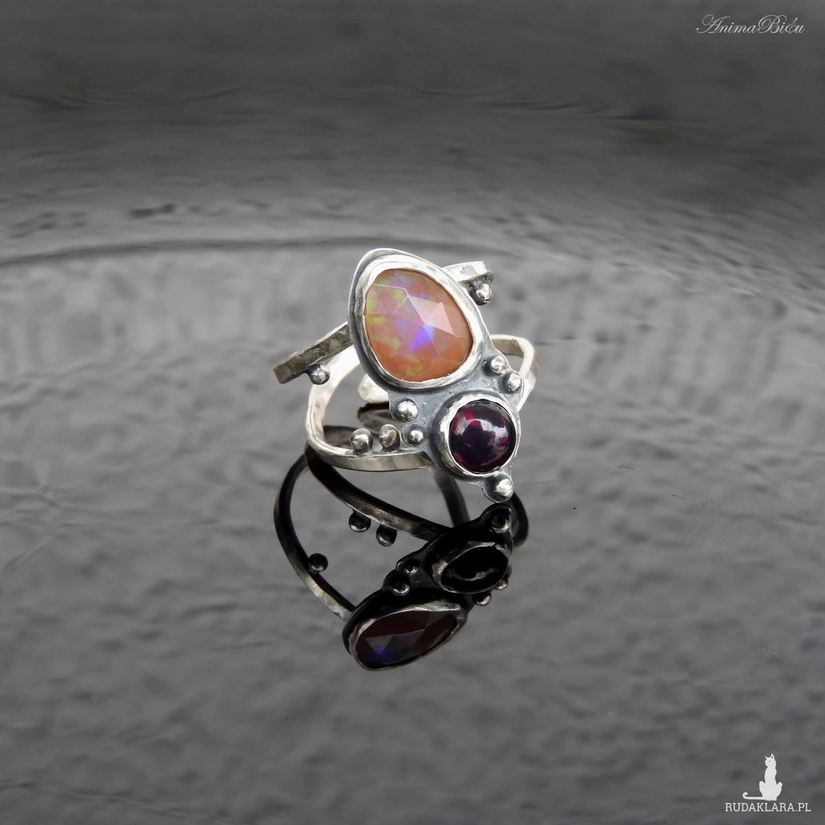 Pierścionek srebrny z opalem etiopskim i opalem czarnym.