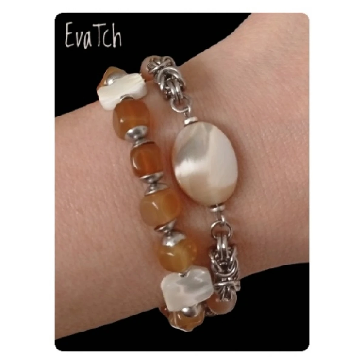 Podwójna bransoletka handmade ze stali szlachetnej z agatem i masą perłową, wykonana techniką chainmaille