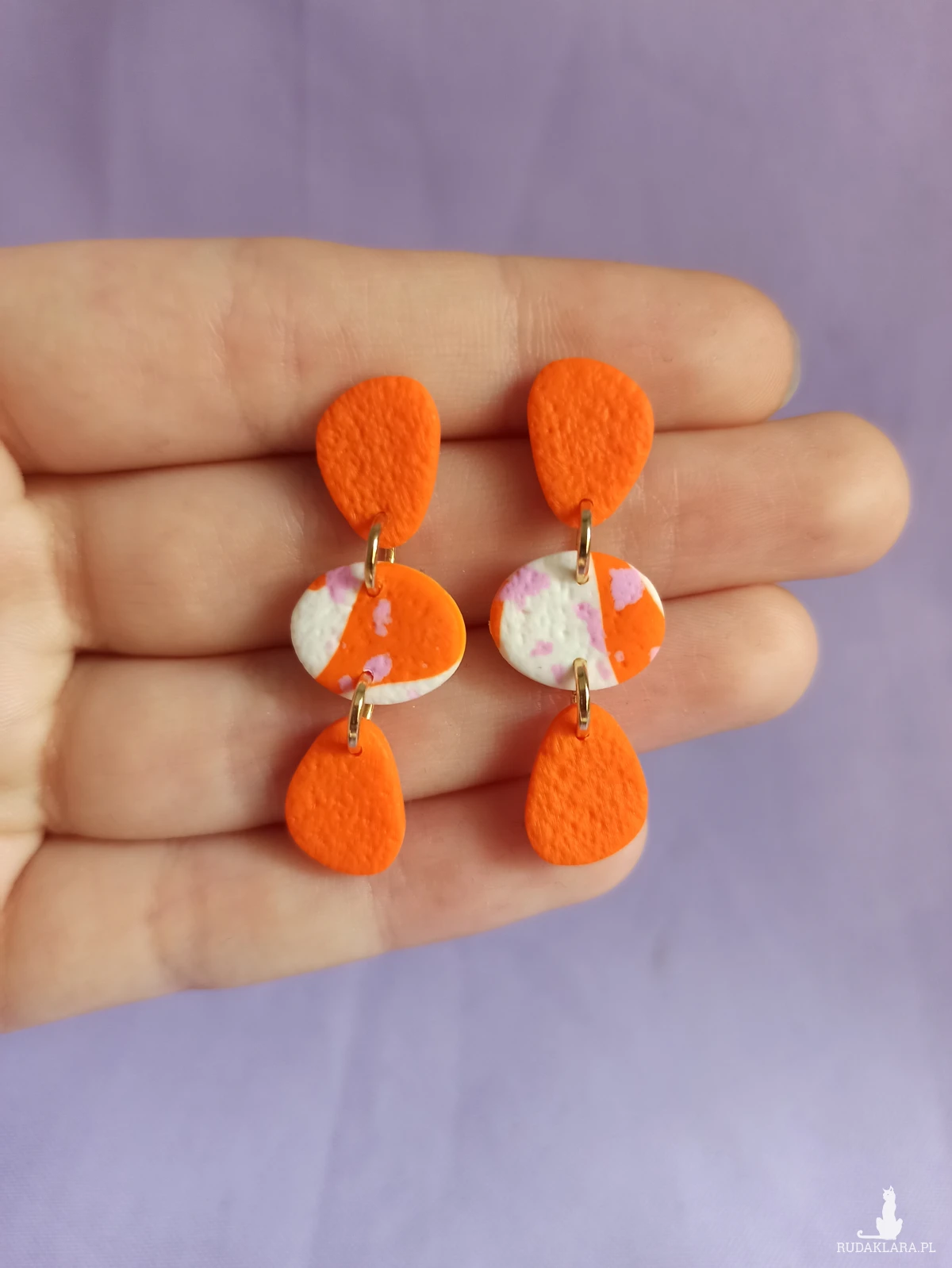 Kolczyki sztyfty w kształcie pomarańczowych łańcuszków z biało różowym elementem