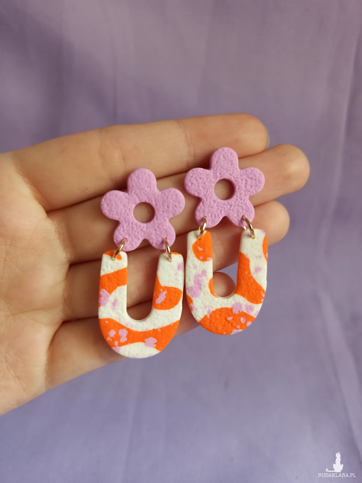 Kolczyki sztyfty w kształcie łuków Pomarańczowo biało różowych z różowym kwiatkiem