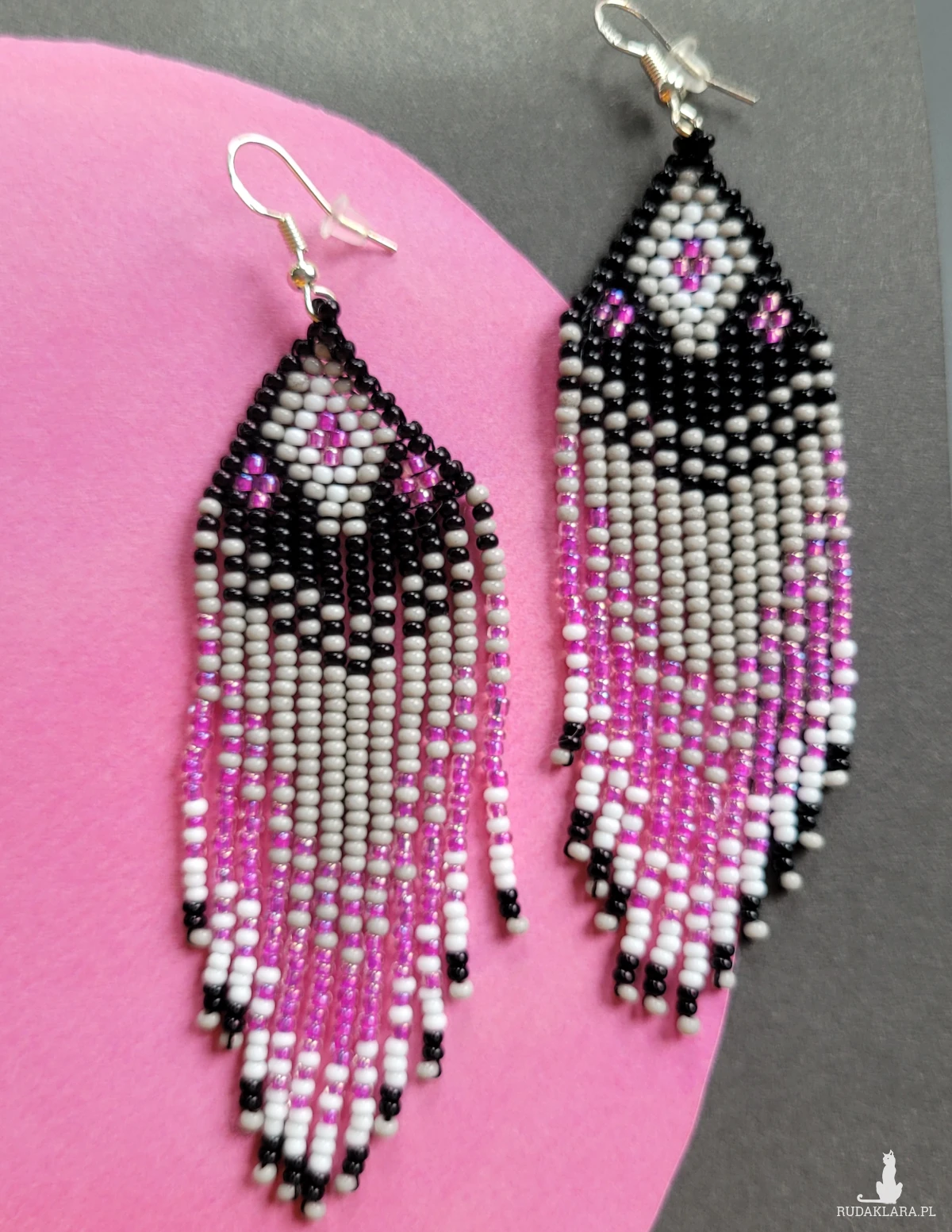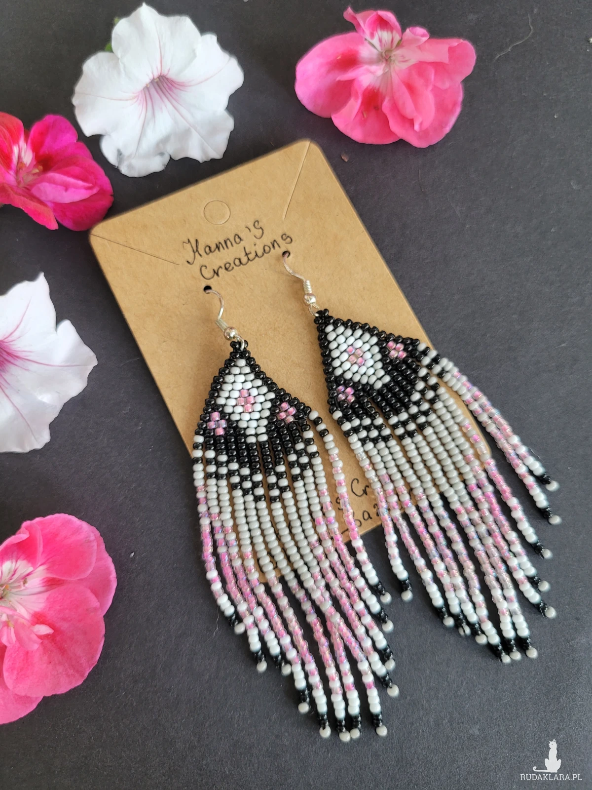 Kolczyki frędzle cieniowane szaro-różowe z motywem geometrycznym z koralików Preciosa