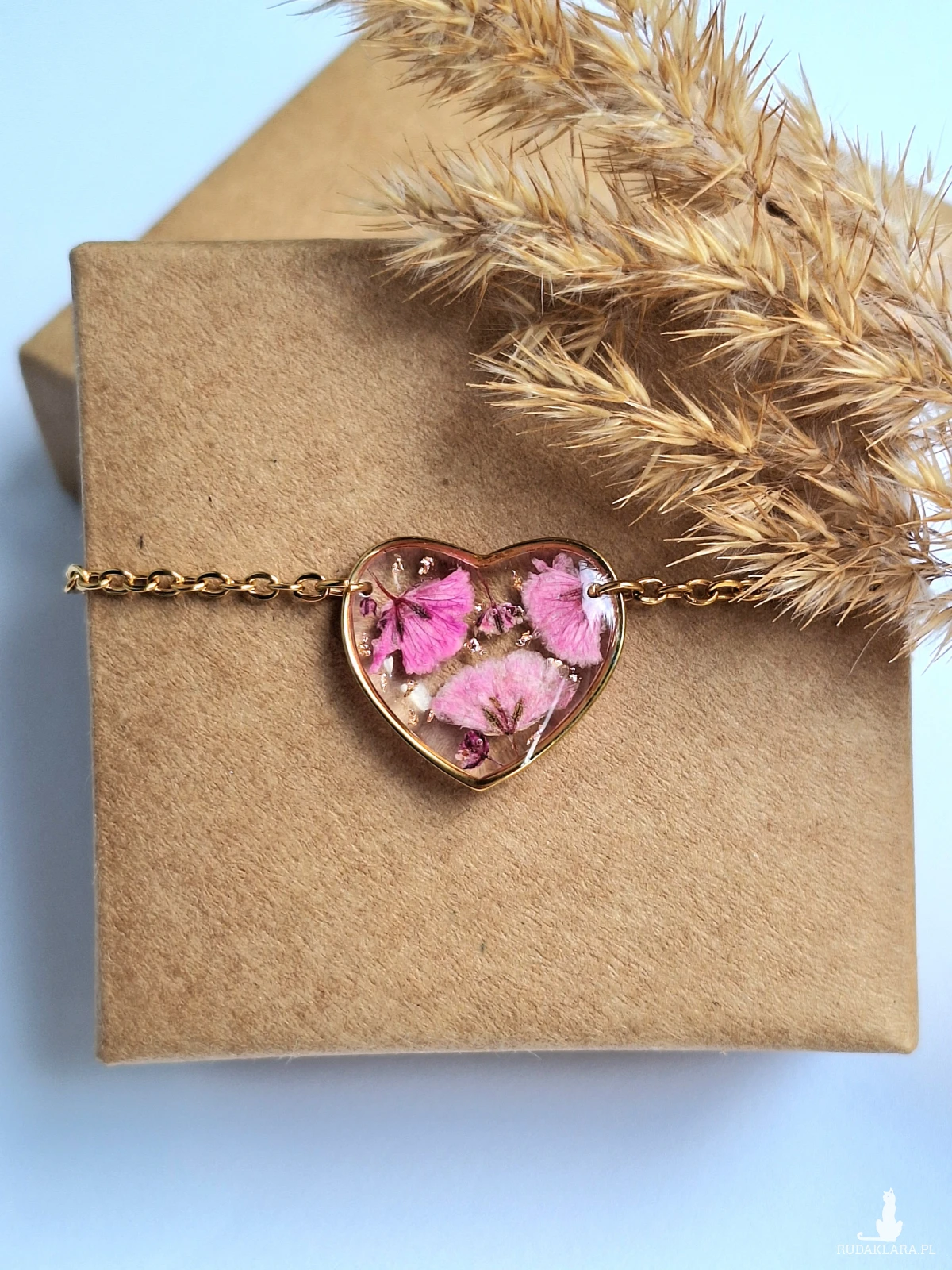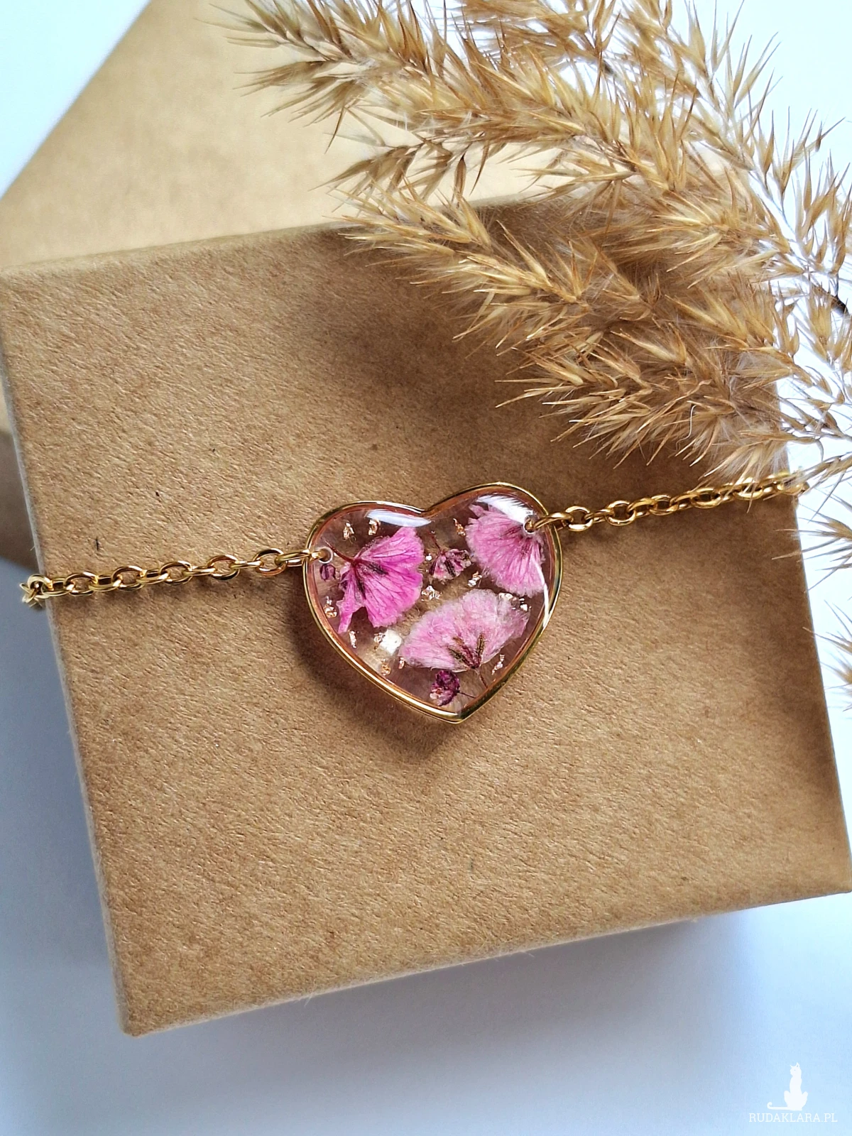 Urocza bransoletka z zatopionymi kwiatami różowej gipsówki i złotem. Wykonana z wysokiej klasy żywicy, która nie zmienia koloru pod wpływem promieniowania uv oraz wysokiej jakości stali chirurgicznej.