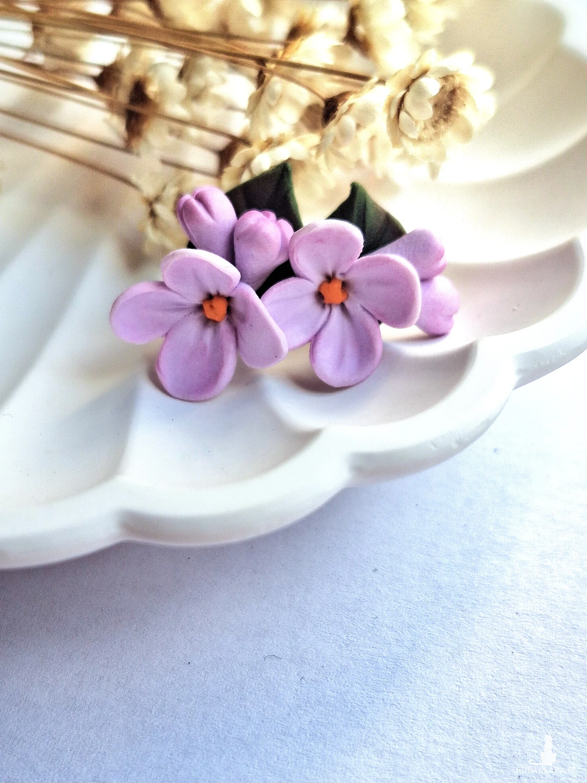 Dodaj odrobinę naturalnego uroku do swojej stylizacji dzięki tym wyjątkowym ręcznie wykonanym kolczykom w kształcie delikatnych, fioletowych kwiatów bzu. Każdy element został starannie uformowany z masy termoutwardzalnej, co nadaje całości niezwykle realistyczny wygląd i artystyczny charakter.