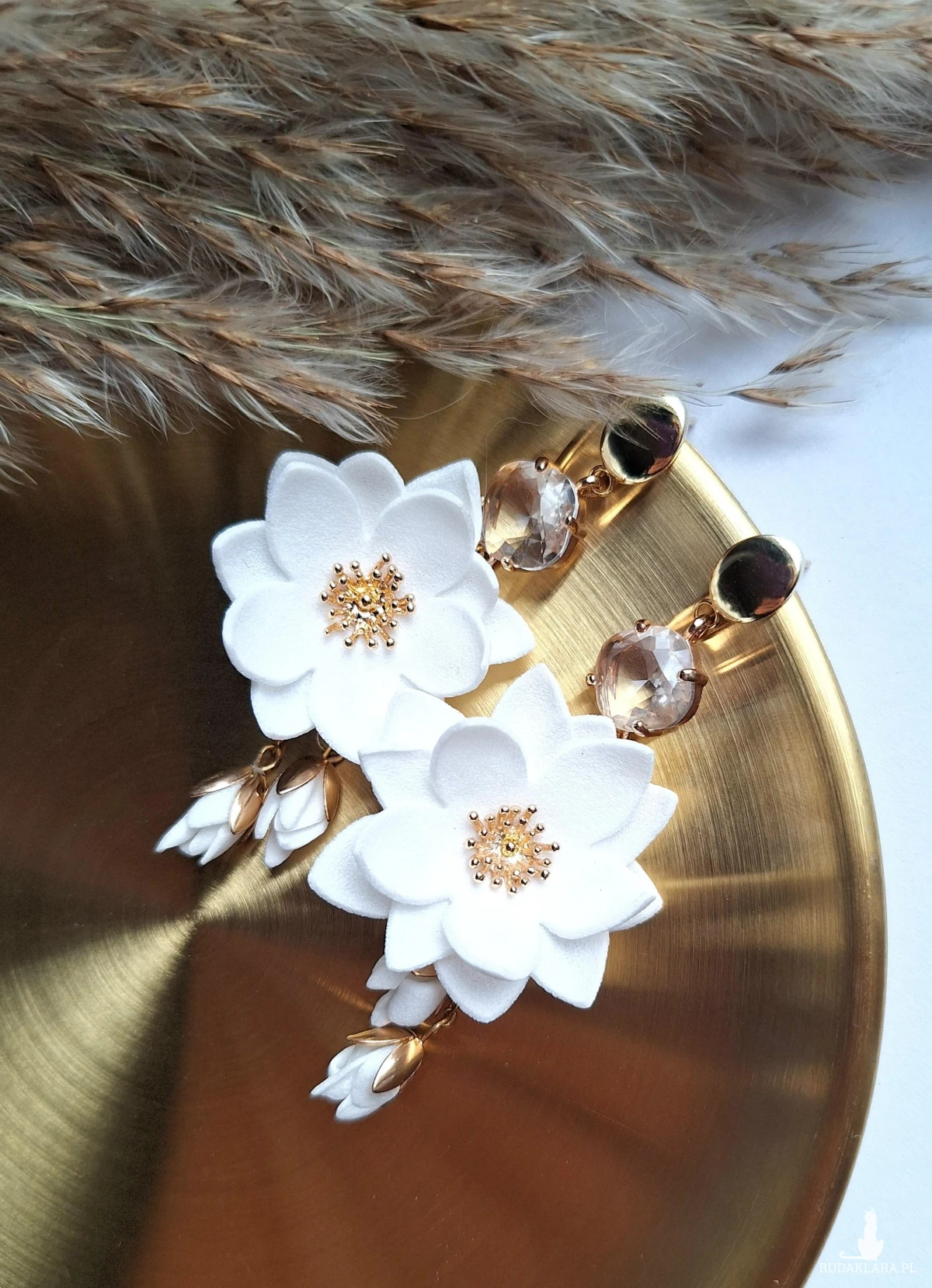 Długie wiszące kolczyki kwiaty w białym kolorze.
